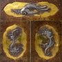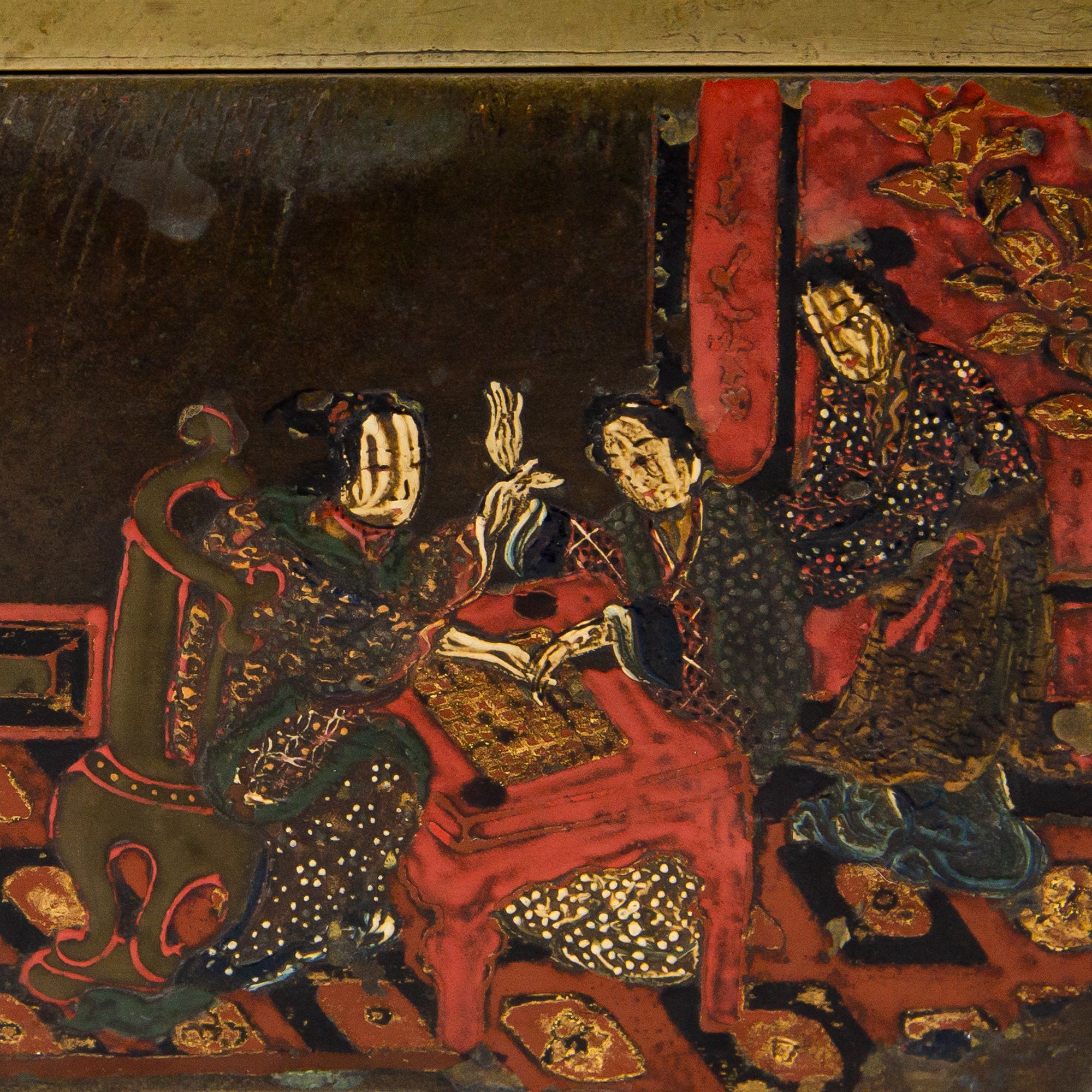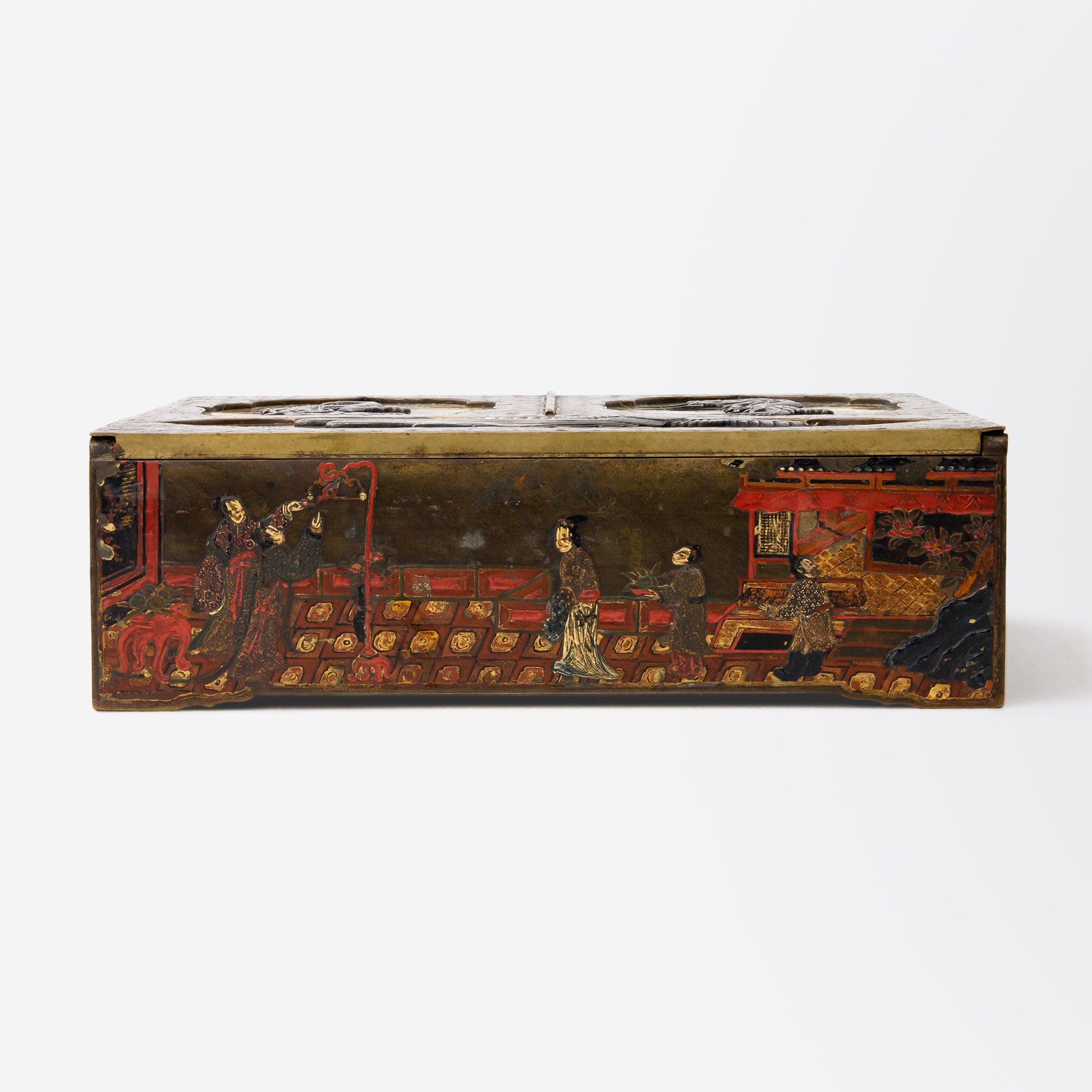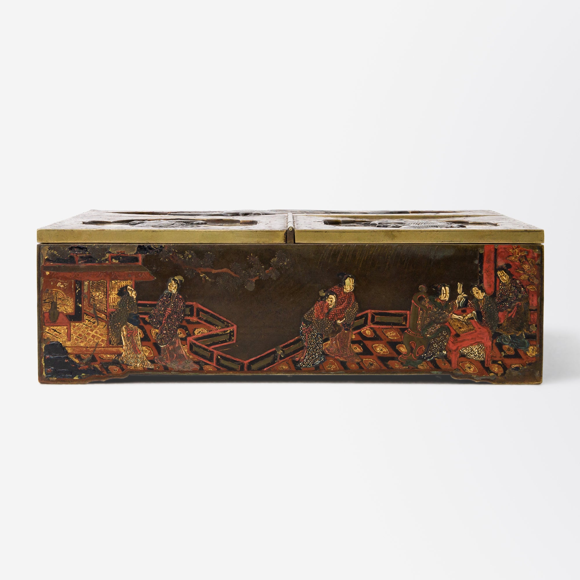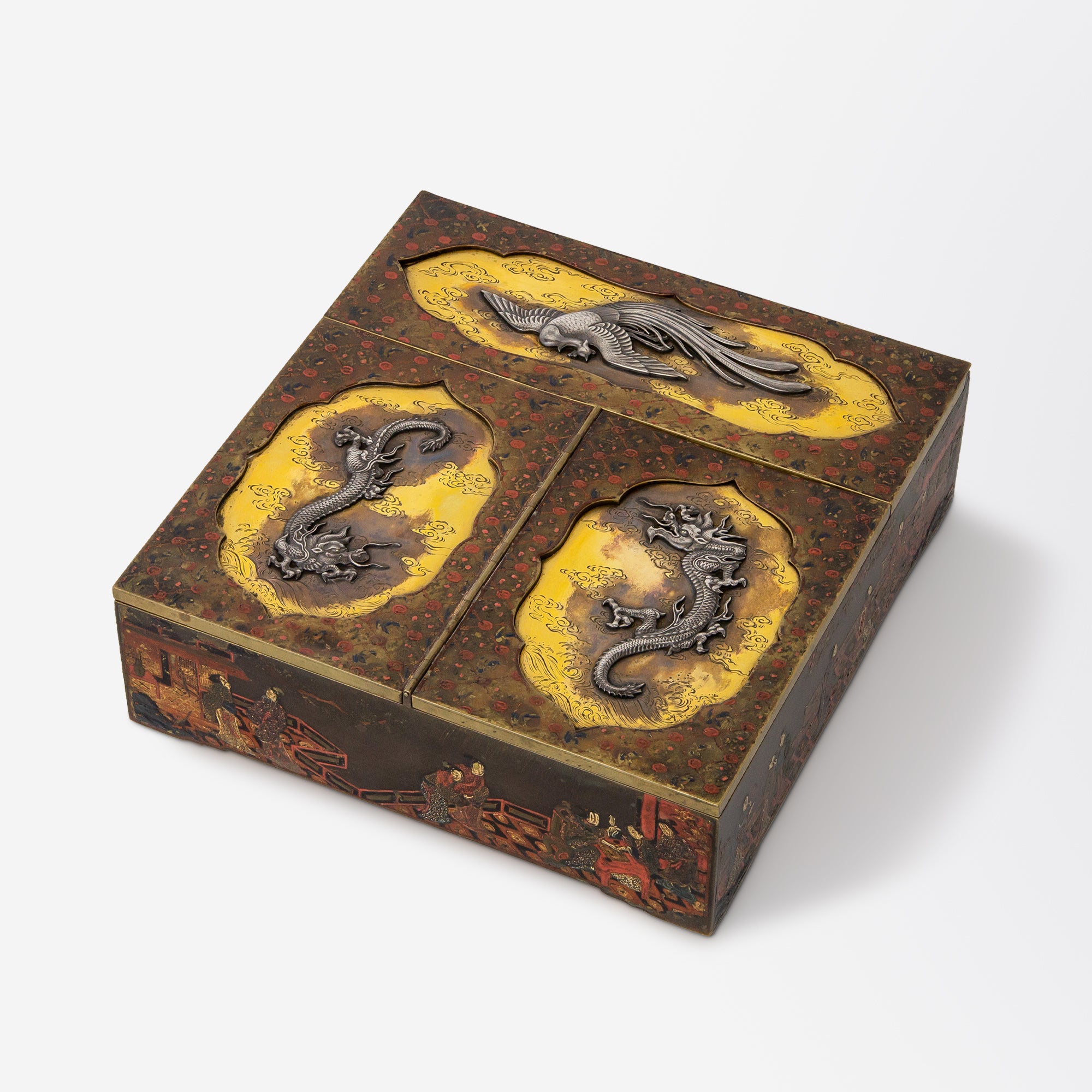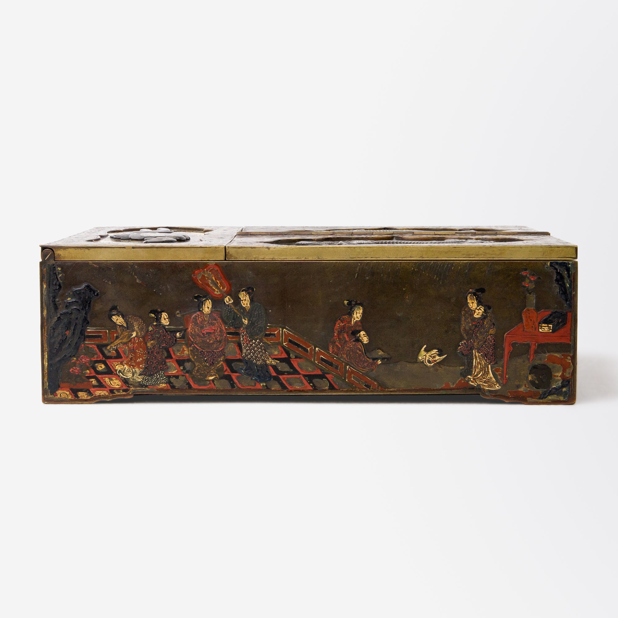 Ce coffret à écrire japonais en bronze émaillé de très belle qualité, appelé « Suzuri-bako », date du XIXe siècle. Ses panneaux latéraux présentent des scènes figuratives émaillées dans un jardin palatial. Trois couvercles/portes, semblables à des fenêtres, s'ouvrent pour révéler deux grandes pierres à encre, un compte-gouttes en argent et un récipient pour rincer les pinceaux. Les couvercles des trois compartiments sont en laiton et représentent des dragons et un phénix en argent en relief. De par sa fabrication et sa qualité, ce Suzuri-bako date probablement du milieu du XIXe siècle, vers la fin de l'époque d'Edo (1603-1867). D'une construction extrêmement lourde, il est magnifiquement réalisé et ne présente que quelques légères usures de l'émail, normales pour son âge.