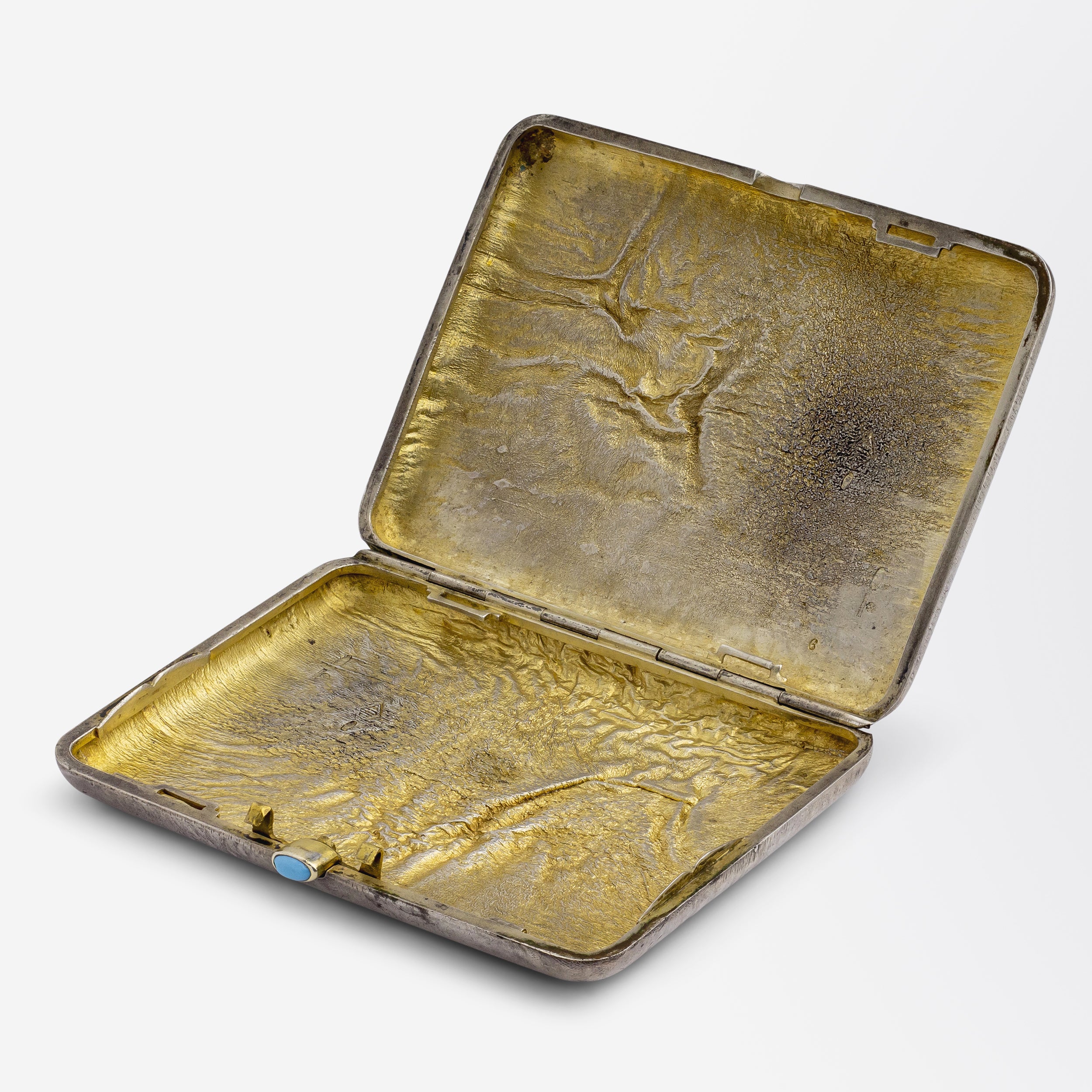 Dans le monde de la joaillerie et des arts décoratifs, le nom Fabergé suscite un enthousiasme sans égal. Cet étui à cigarettes en argent et turquoise cabochon date du début du XXe siècle, avant la révolution russe, et a été réalisé par Fabergé. Sa texture, dite « Samorodok », fait référence à la technique employée pour créer une surface ondulée, semblable à du tissu. L'intérieur de l'étui est doré à la feuille, ce qui le protège du ternissement ; une caractéristique fréquente des pièces de cette époque. Le fermoir à bouton-poussoir est taillé dans un cabochon de turquoise serti clos dans un anneau d'argent doré. Les deux faces de l'étui portent les poinçons Zolotnik de Moscou, son lieu de fabrication, ainsi que deux poinçons K. Fabergé, placés sous l'aigle bicéphale, symbole du « mandat impérial ». Ces poinçons indiquent que cet étui a été fabriqué entre 1908 et 1917, à la fin de la Russie impériale. L'étui est en superbe état, le seul défaut notable étant de légères éraflures sur la turquoise cabochon, normales compte tenu de son âge et de son utilisation. Une pièce absolument ravissante d'orfèvrerie russe d'avant la révolution, signée par le plus grand orfèvre de tous les temps, qui, au XXIe siècle, pourrait servir à ranger cartes bancaires et carte d'identité lors d'un dîner.