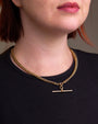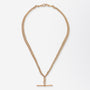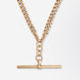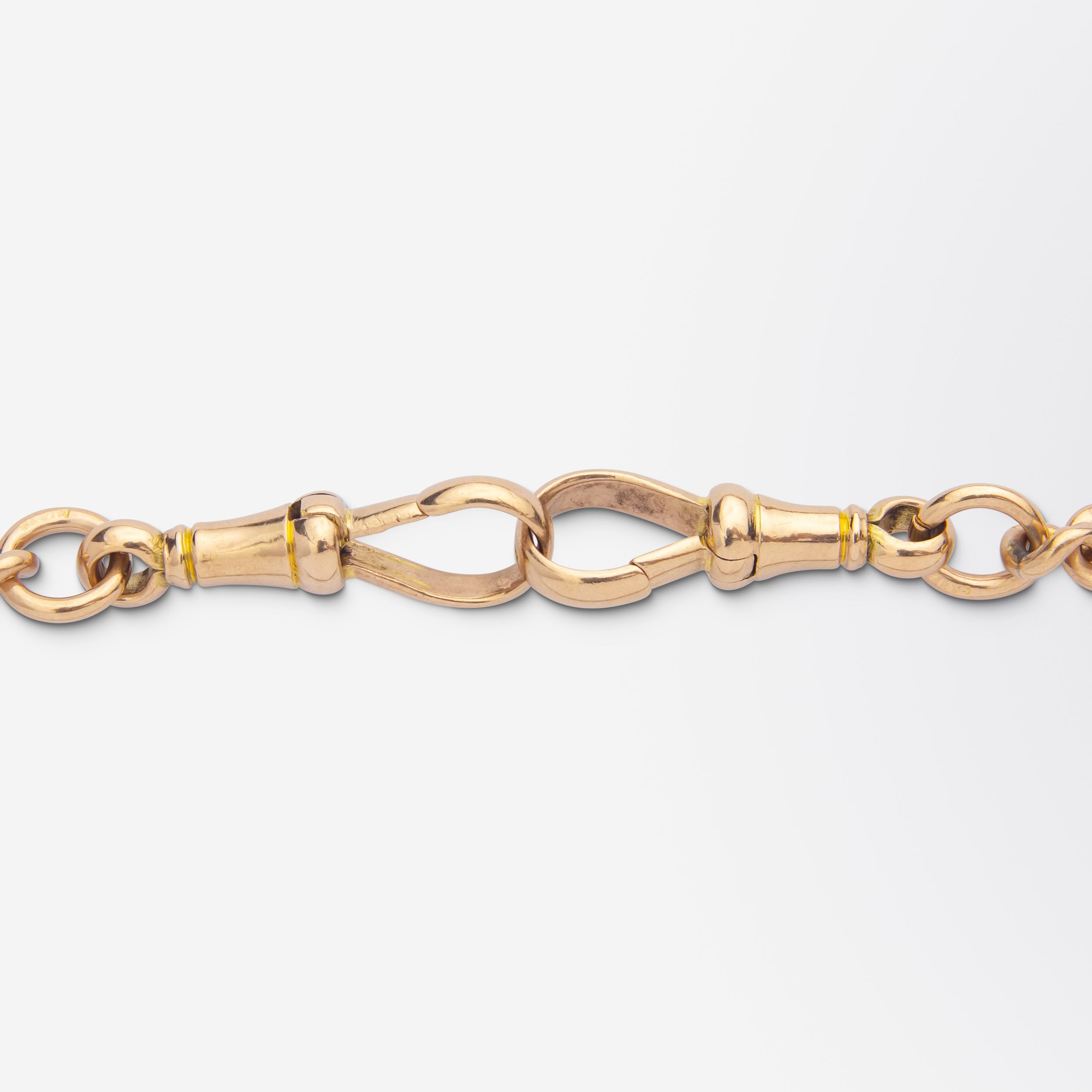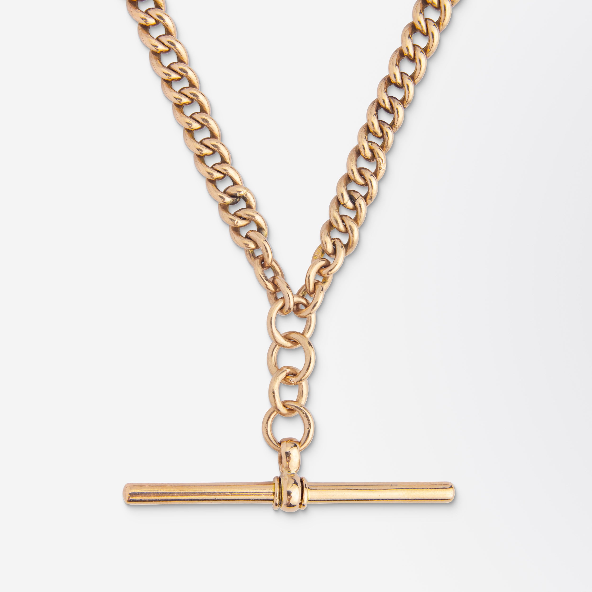 Cette chaîne gousset en or jaune 9 carats a été fabriquée en Angleterre au début du XXe siècle. La chaîne à maillons gourmette est dégradée de part et d'autre et se termine au centre par une barre en forme de « T ». Presque chaque maillon porte le poinçon de l'or 9 carats et celui du fabricant, The Albion Chain Company, basé à Birmingham, en Angleterre. Malheureusement, la pièce ne porte pas de poinçon indiquant l'année de fabrication, mais le poinçon spécifique du fabricant nous permet de la dater des années 1920. À l'arrière, le collier est muni de deux fermoirs mousquetons en parfait état de fonctionnement et bien sécurisés. Un très bel exemple de chaîne gousset anglaise polyvalente, qui peut être portée avec d'autres colliers ou agrémentée de pendentifs pour un style plus original.