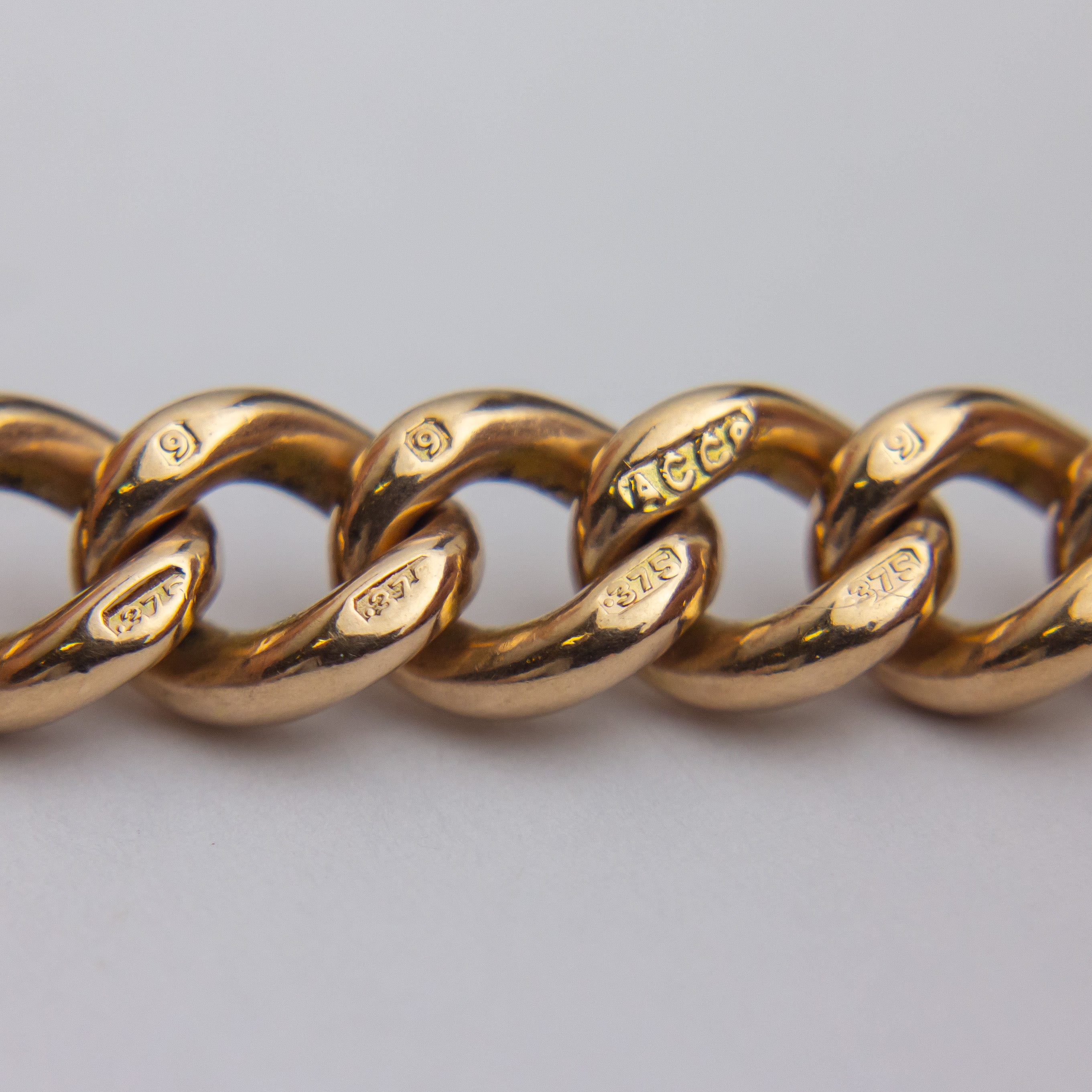 Poinçonné « 9 » et « .375 » pour la pureté de l’or, avec une ancre indiquant la fabrication à Birmingham et « ACCo » pour le fabricant.