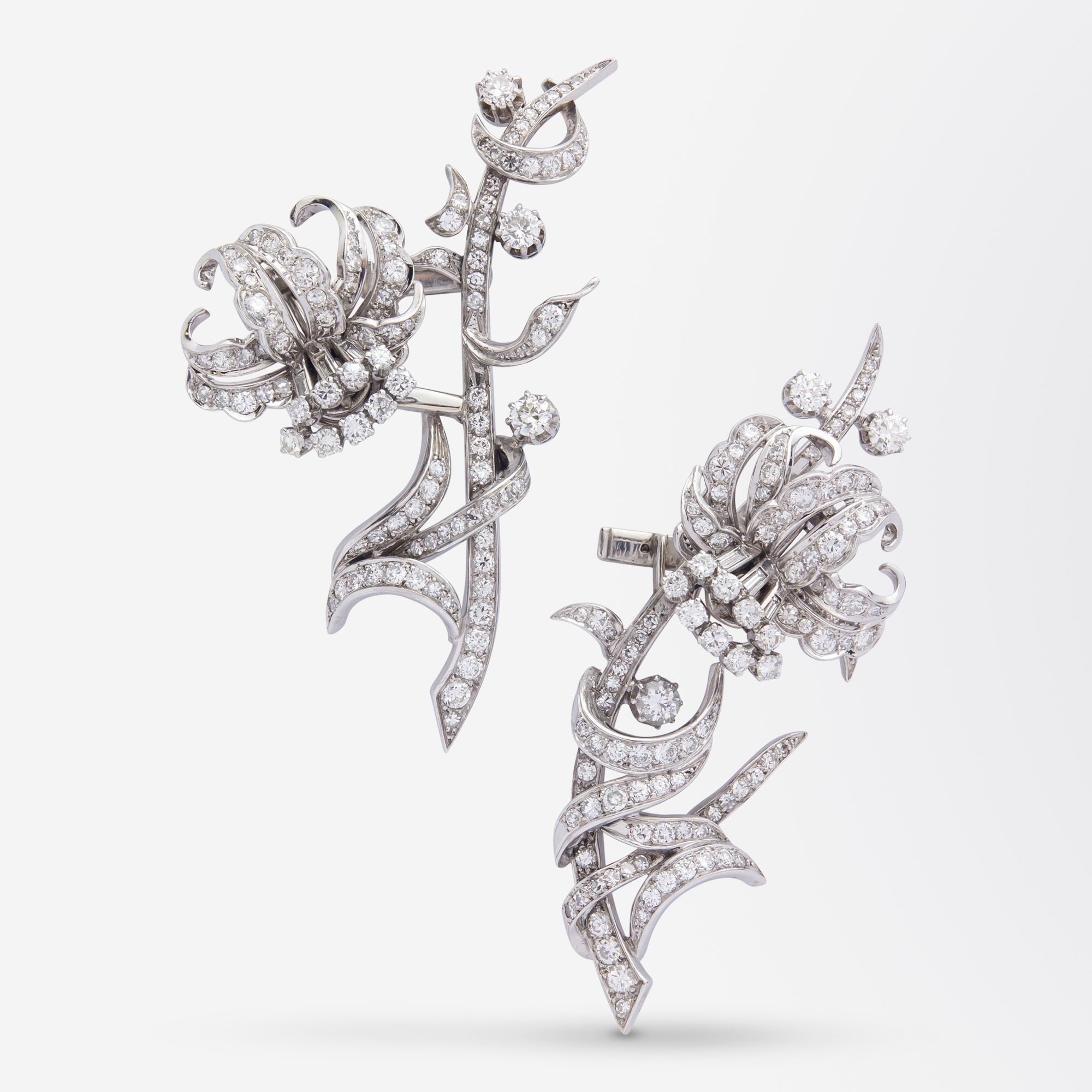 Une broche en platine française d'une grande finesse et d'une grande polyvalence, ornée d'épingles à vêtements et de clips d'oreilles détachables. L'épingle, représentant un bouquet de fleurs, porte les poinçons français attestant de sa qualité en platine et en or 18 carats. Conçue pour être portée de trois façons, elle peut être portée de trois manières différentes : les deux clips se fixent sur une armature pour former une grande broche, ou bien les orchidées centrales peuvent être détachées et portées en boucles d'oreilles clips. Entièrement sertie de diamants taille brillant et baguette, cette pièce resplendit de mille feux. Les diamants, de couleur G/H et de pureté VS-SI, sont sertis griffes ou millegrain. La fermeture à l'arrière est une épingle à charnière munie d'un fermoir coulissant pour plus de sécurité. Datant des années 1950, cette pièce est un magnifique exemple de la joaillerie « cocktail » produite à cette époque, notamment en France.