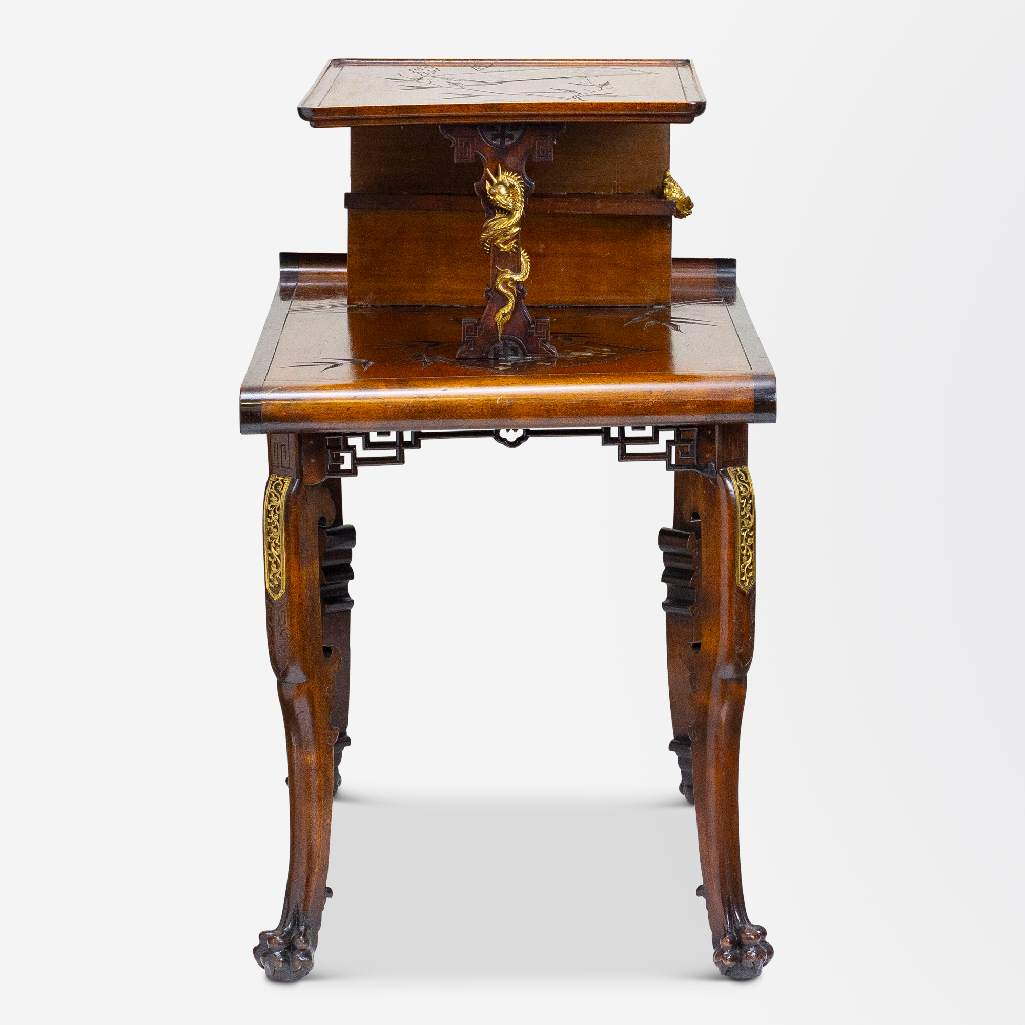 Table à thé de style japonais à deux niveaux attribuée au designer français Gabriel Viardot (1830-1904) avec plateaux sculptés, incrustés de décorations en nacre sur des pieds cabriolets et des pieds en forme de boule et de griffe, vers 1890.