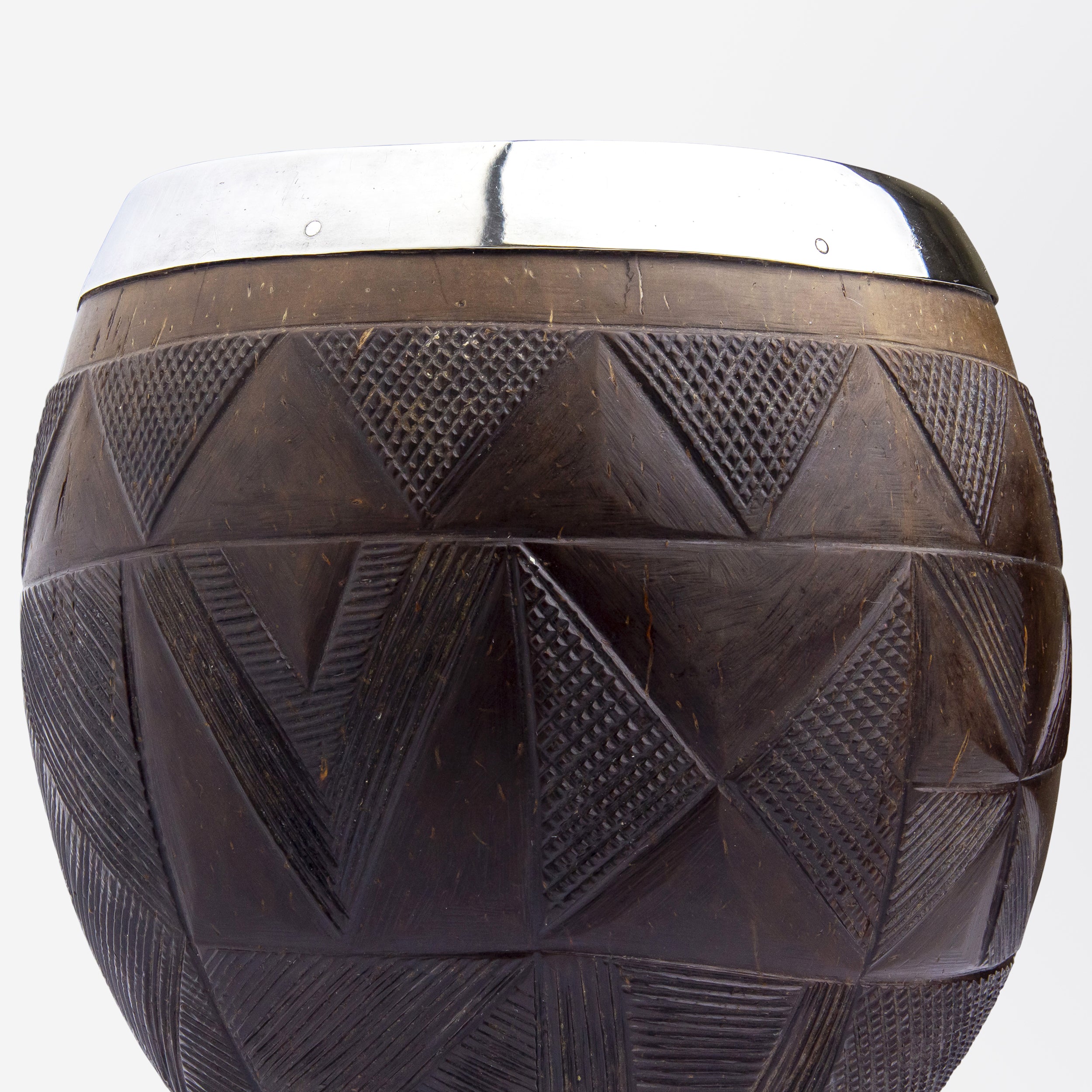 Cette magnifique noix de coco sculptée du XIXe siècle repose sur un pied et un bord en argent. Le corps de la noix de coco, d'un brun profond, a été incisé d'un motif géométrique tribal avant d'être serti d'argent au Royaume-Uni. Fait intéressant, la pièce ne porte qu'un seul poinçon, « HW », probablement celui de l'orfèvre victorien Horace Woodward & Co, actif entre 1874 et 1877. La correspondance de ce poinçon avec celui de cette coupe, et la découverte qu'il a serti d'autres noix de coco en argent, nous permettent de l'attribuer avec certitude à cet orfèvre. Malheureusement, la date de fabrication est absente, mais son entreprise a produit d'autres objets datés de 1874 à 1877 ; il est donc probable que cette coupe ait été sertie dans les années 1870. En superbe état pour son âge, cette pièce est un rare témoin du XIXe siècle et trouverait parfaitement sa place dans un cabinet de curiosités.