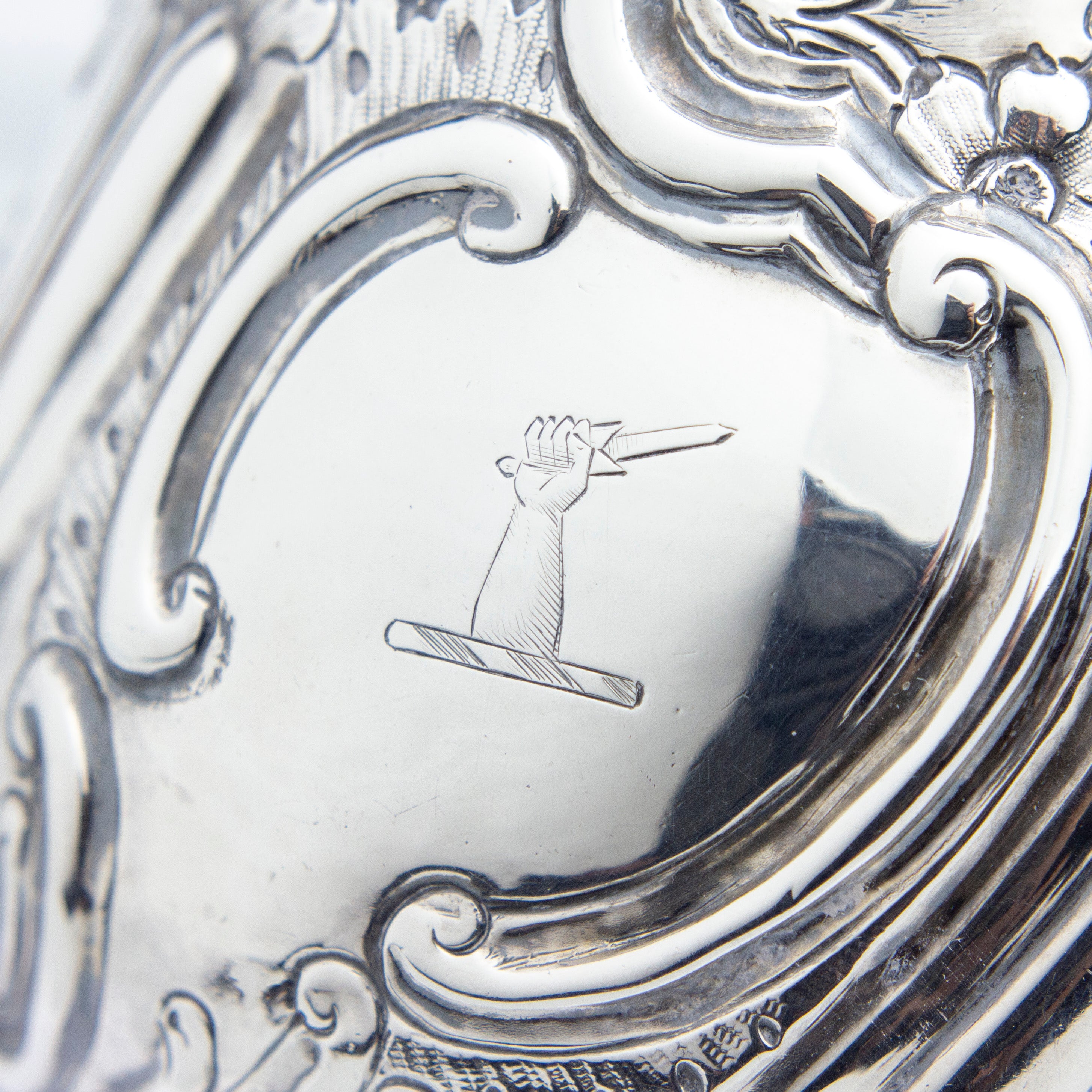 Une élégante cafetière en argent massif d'époque George II, à anse en bois, ornée de motifs floraux repoussés et d'un blason portant la marque d'orfèvre effacée, probablement celle de William Skeen. Cette cafetière est typique du style rococo du début et du milieu du XVIIIe siècle, avec ses guirlandes asymétriques et ses motifs floraux repoussés recouvrant presque entièrement sa surface. Le col de la cafetière porte des poinçons londoniens attestant de sa fabrication en 1757, ainsi qu'une marque d'orfèvre effacée, vraisemblablement celle de William Skeen. Sur le devant, un blason gravé pourrait être celui de la famille Alexander, figurant dans l'édition de 1905 du « Fairbairn's Book of Crests ». La cafetière est en excellent état, présentant les marques d'usure normales pour une pièce de 250 ans. Un magnifique exemple d'orfèvrerie anglaise du règne de George II.