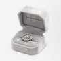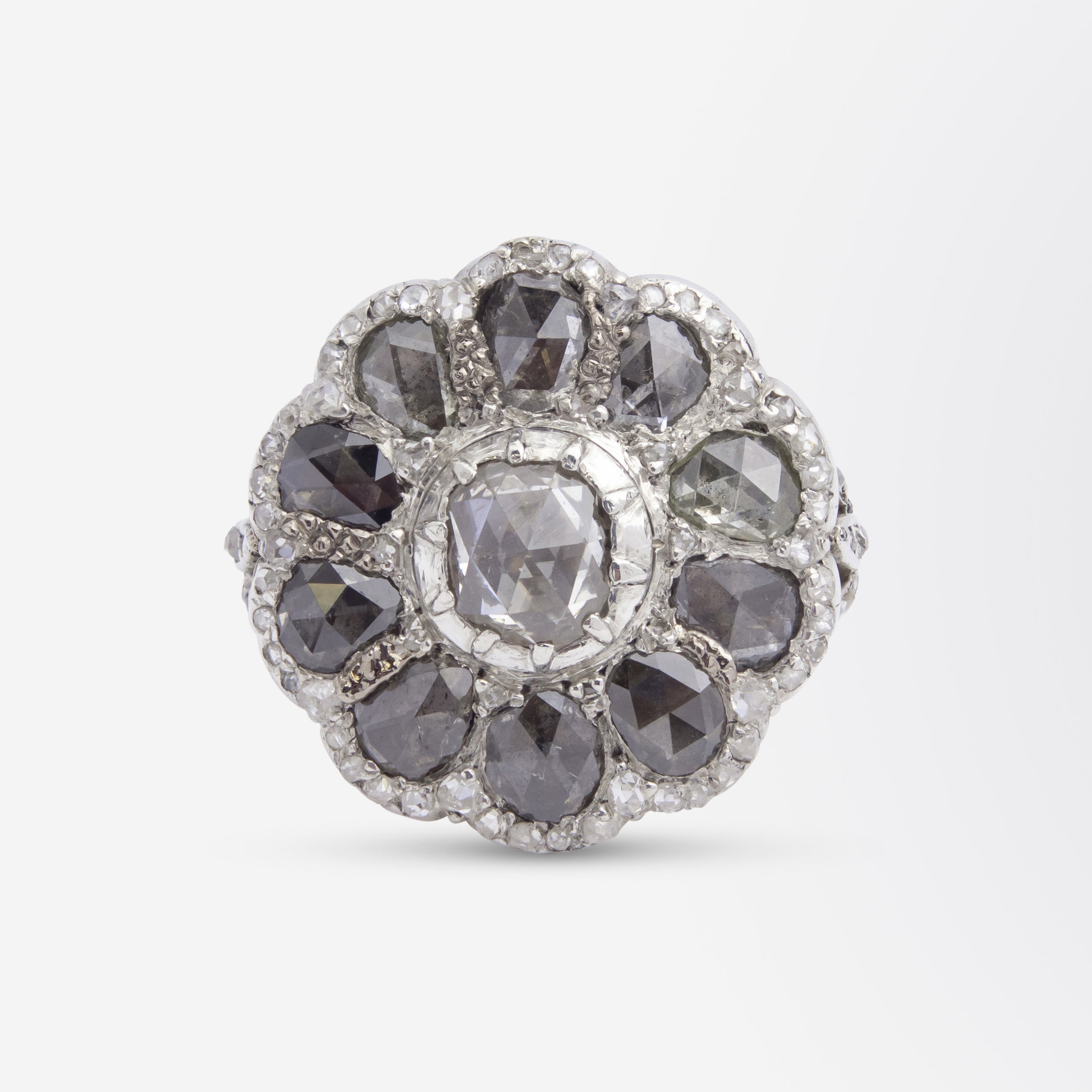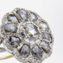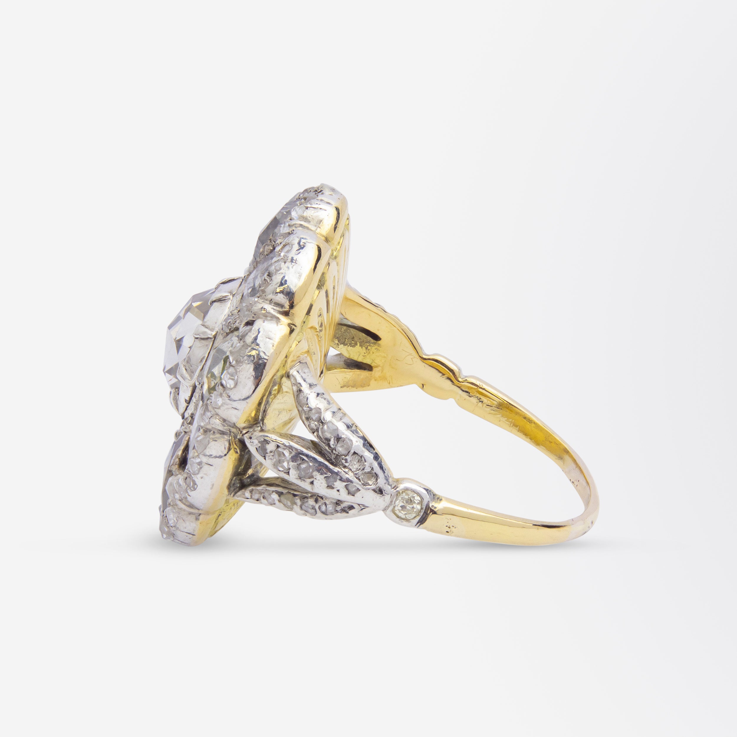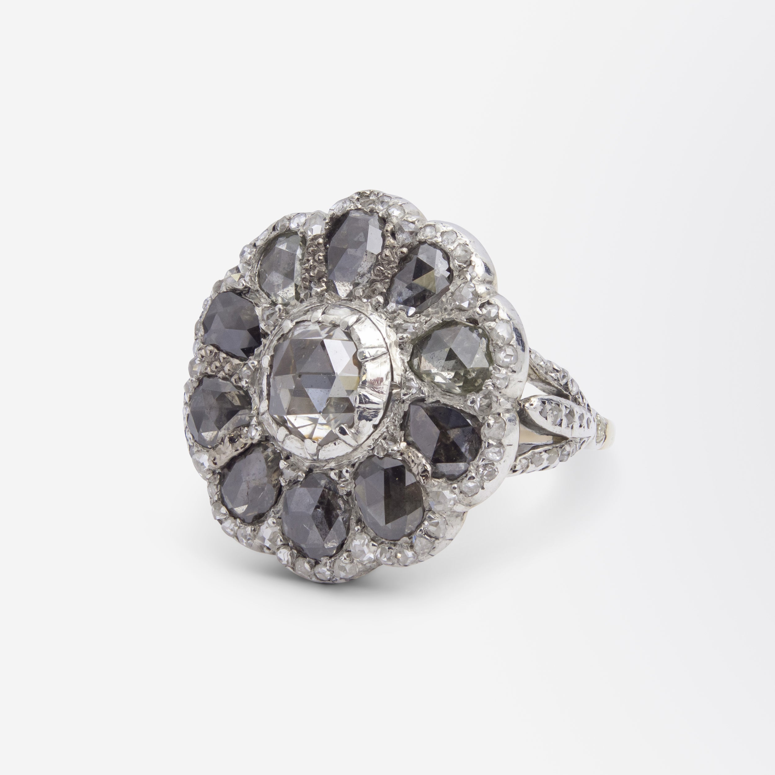 Ce bijou d'une rareté exceptionnelle a été transformé en bague à partir d'un bouton de diamant géorgien du XVIIIe siècle. Un bouquet de diamants sertis dans de l'or jaune 14 carats et de l'argent complète la monture. Ce bouton a été délicatement modifié au XIXe siècle pour devenir une bague, grâce à l'ajout d'un anneau en or jaune surmonté d'argent et serti de petits diamants taille rose. Le bouton d'origine est centré sur un diamant rond taille rose, serti sur une feuille métallique, d'une couleur K et d'une pureté SI2, pour un poids total estimé à 0,60 carat. Ce diamant central est entouré de dix « pétales » de diamants ovales taille rose, sertis sur une feuille métallique, de couleur gris clair et de pureté P3, pour un poids total estimé à 1,00 carat. Le pourtour des pétales est orné de 90 petits diamants taille rose qui descendent le long des épaules de la bague, pour un poids total d'environ 0,20 carat. Le bouton de cette bague aurait probablement appartenu à un aristocrate ou à un membre fortuné de la société et ornait peut-être autrefois, avec d'autres boutons identiques, un gilet raffiné. Généralement, ce type de bouton ornait les vêtements des messieurs plutôt que ceux des dames et était amovible pour faciliter le lavage. Lorsque ces boutons sont tombés en désuétude, ils ont souvent été transformés en bagues, comme en témoignent les collections de galeries et de bijoutiers spécialisés dans les bijoux anciens du monde entier. L'ancien propriétaire de cette bague l'a acquise auprès de la prestigieuse maison nord-américaine Park Avenue Antiques, et elle conserve son écrin d'origine. Les pierres étant serties sur une feuille métallique, il est déconseillé de plonger la bague dans l'eau, même pour se laver les mains. C'est donc une bague de cocktail à réserver aux grandes occasions. Un rare et superbe témoin de l'époque géorgienne, prêt pour une nouvelle vie au XXIe siècle.
