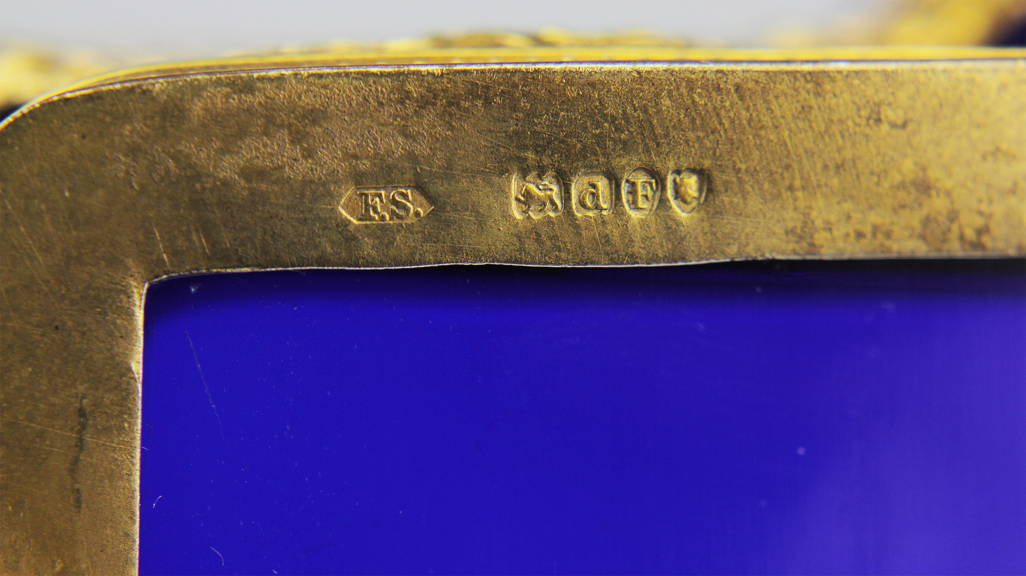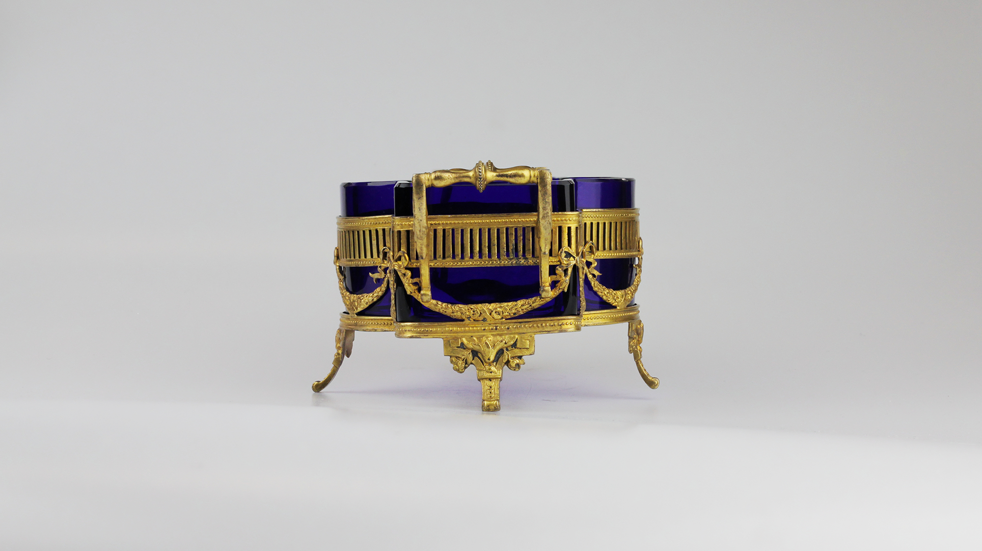 Un impressionnant panier sur pied en argent massif doré, avec sa doublure d'origine en verre bleu cobalt. La structure en argent repose sur quatre pieds en argent massif doré et présente à l'extérieur des guirlandes ornées de nœuds et des détails de style néoclassique. L'intérieur du panier en argent doré conserve sa doublure d'origine en verre bleu cobalt, en parfait état. Les poinçons apposés sous le panier indiquent qu'il a été testé à Londres en 1899, mais la signification du poinçon de maître « FS » nous est inconnue. Outre les poinçons anglais pour l'argent massif, on trouve également le poinçon « 930 », ce qui suggère qu'il a probablement été fabriqué sur le continent, puis importé et vendu au Royaume-Uni. Malgré son âge de plus de 100 ans, ce panier est dans un état impeccable, ne présentant que très peu de traces d'utilisation ou de manques. On peut aisément imaginer qu'il serait du plus bel effet garni de kumquats ou de délicieux chocolats emballés dans du papier aluminium.
