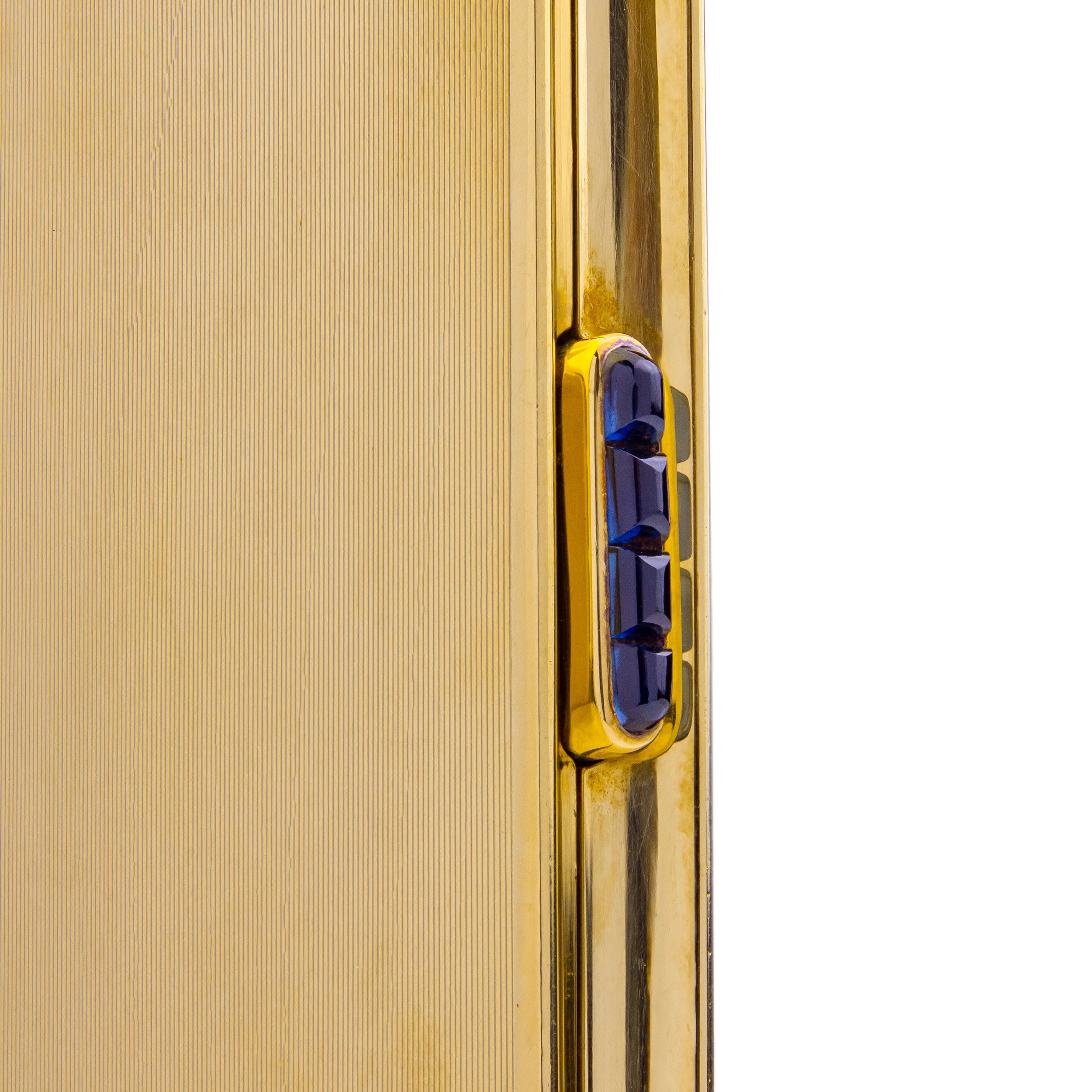 Il existe un nom que les passionnés de bijoux adorent entendre : Cartier, et plus particulièrement « Cartier Londres ». Ajoutez à cela le terme « Art déco », et c'est l'extase assurée. Cet étui à cigarettes des années 1930, réalisé en or jaune 18 carats massif par Jacques Cartier pour Cartier Londres, vaut son pesant d'or. L'étui présente un extérieur usiné et un intérieur poli miroir. Il se ferme par un fermoir serti de saphirs cabochons. À l'intérieur, une barre articulée, ajourée d'un motif Art déco, maintient les cigarettes en place. Au XXIe siècle, cette barre pourrait servir à ranger cartes de crédit, pièce d'identité et mouchoirs, transformant ainsi l'étui en une petite pochette de soirée. Les saphirs cabochons taille fantaisie du fermoir, au nombre de quatre, sont probablement d'origine ceylanaise, compte tenu du style Art déco de cette pièce Cartier. À l'intérieur d'un côté de l'étui se trouve un monogramme Art déco original, probablement « NWN » ou une variante de ces lettres. On y trouve également des poinçons d'or londoniens nets, avec une lettre date correspondant à 1934, apogée de l'Art déco, ainsi qu'un petit poinçon « JC » pour Jacques Cartier. L'étui est également signé en très petits caractères cursifs : « Cartier London », ce qui authentifie davantage la pièce comme provenant de la célèbre maison.