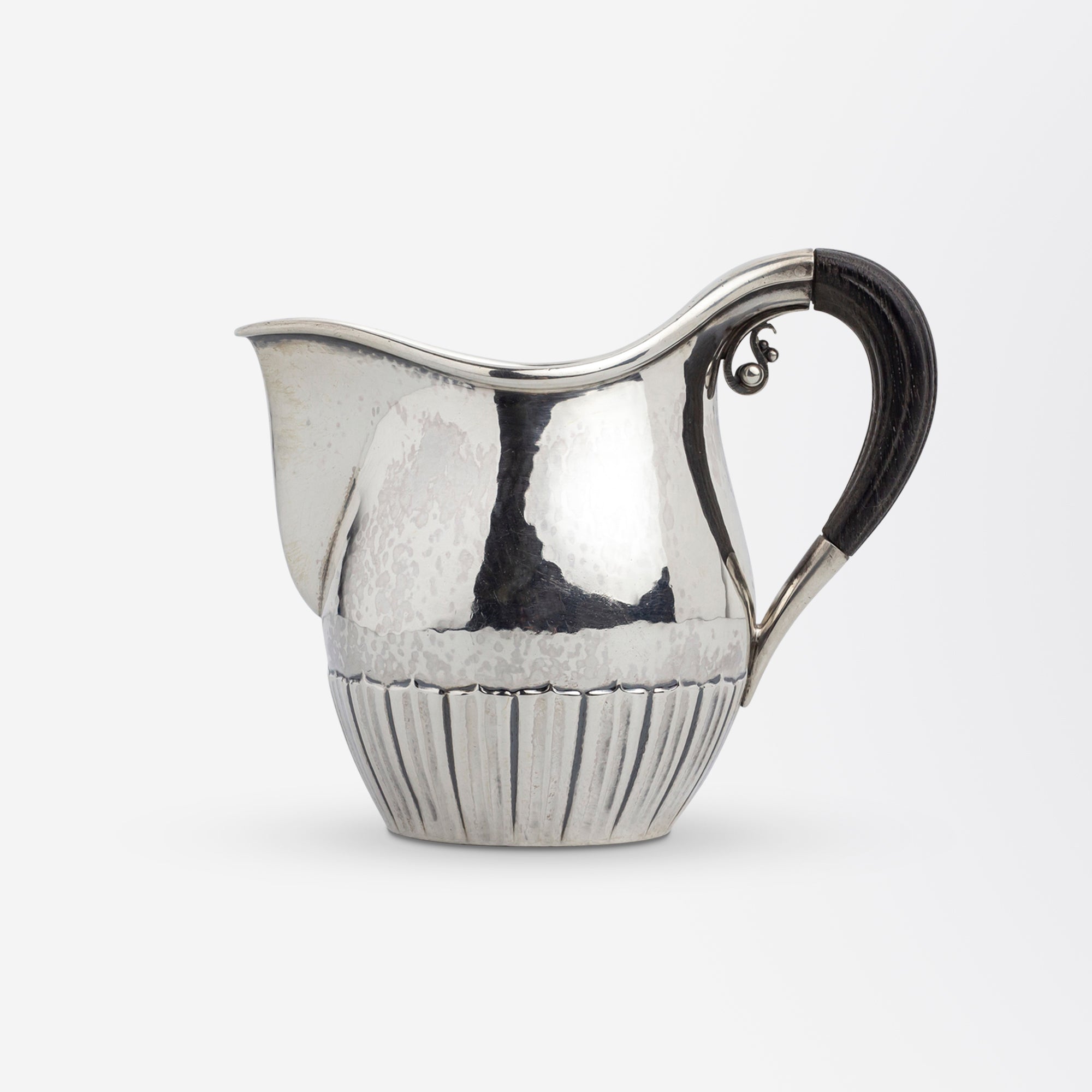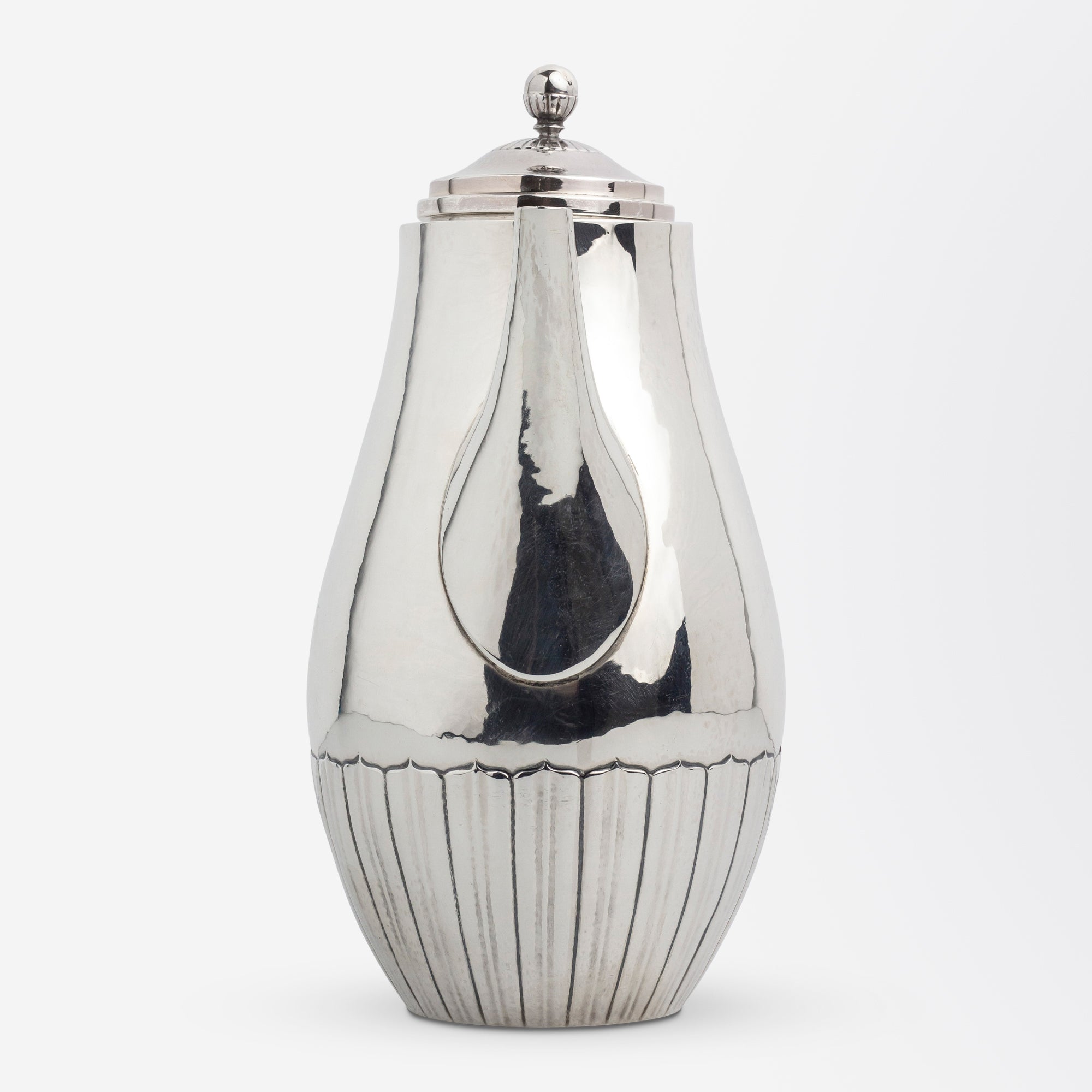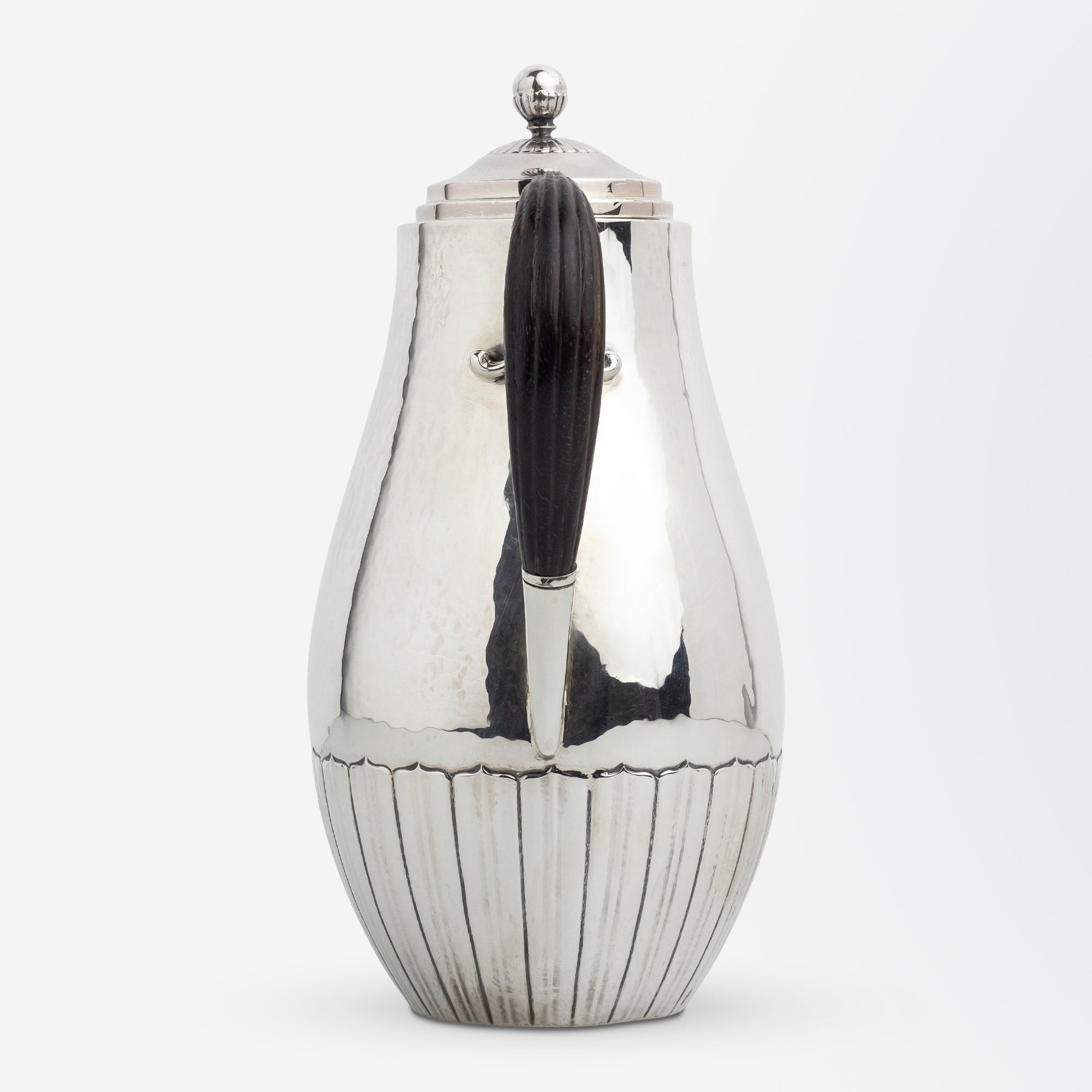 Ce ravissant service à café ou à moka a été réalisé par Georg Jensen d'après un dessin de Johan Rohde (1856-1935) intitulé « Cosmos ». Il se compose de trois pièces en argent martelé à la main : une cafetière ou une cafetière à moka, un petit pot à lait et un sucrier avec couvercle. Chaque pièce présente une partie cannelée évoquant un melon et un dessus martelé lisse, orné d'un simple bouton semi-cannelé sur le couvercle de la cafetière et du sucrier. Les poignées d'origine, en bois ébénisé et cannelé, de la cafetière et du pot à lait, sont décorées de motifs de vigne en argent massif à l'intérieur. Le modèle Cosmos aurait été créé en 1915, pendant la Première Guerre mondiale, et a été produit sans interruption durant les nombreuses décennies d'activité de Jensen. Les poinçons apposés sous la pièce indiquent une fabrication par Georg Jensen après 1945, ce qui rend sa datation précise difficile, mais elle date probablement du milieu du XXe siècle. Johan Rohde, qui a conçu cet ensemble, était l'un des designers les plus talentueux de Jensen et est notamment connu pour avoir créé le motif « Gland », emblématique de la marque. Un magnifique ensemble, idéal pour un amateur de café ou un ajout précieux à une collection Jensen.