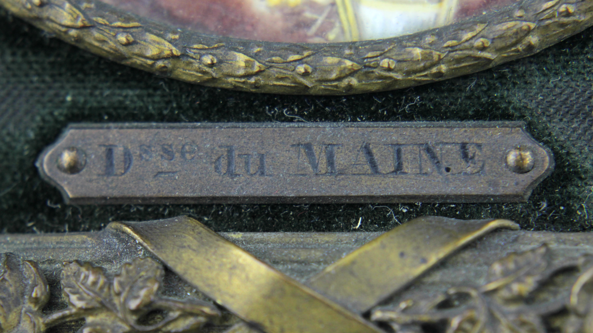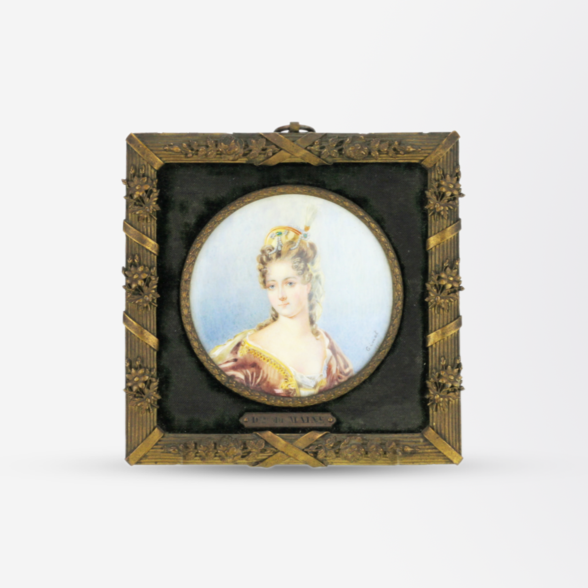 Un ravissant portrait miniature de Madame Du Maine, réalisé par l'artiste française Ginet au XIXe siècle. Malgré sa petite taille, ce panneau d'ivoire peint à la main, avec son cadre d'origine en bronze et velours, est d'une beauté exceptionnelle.