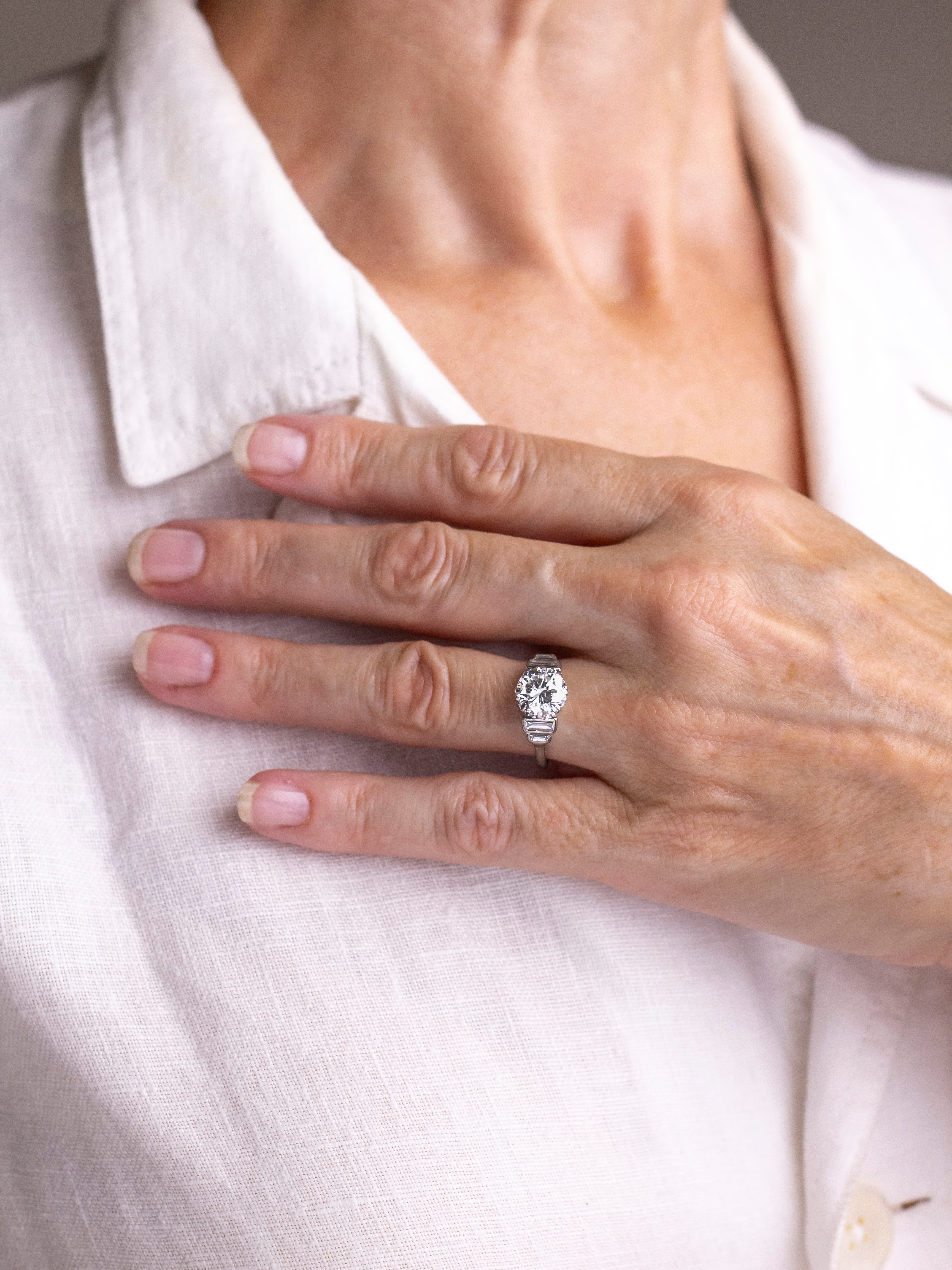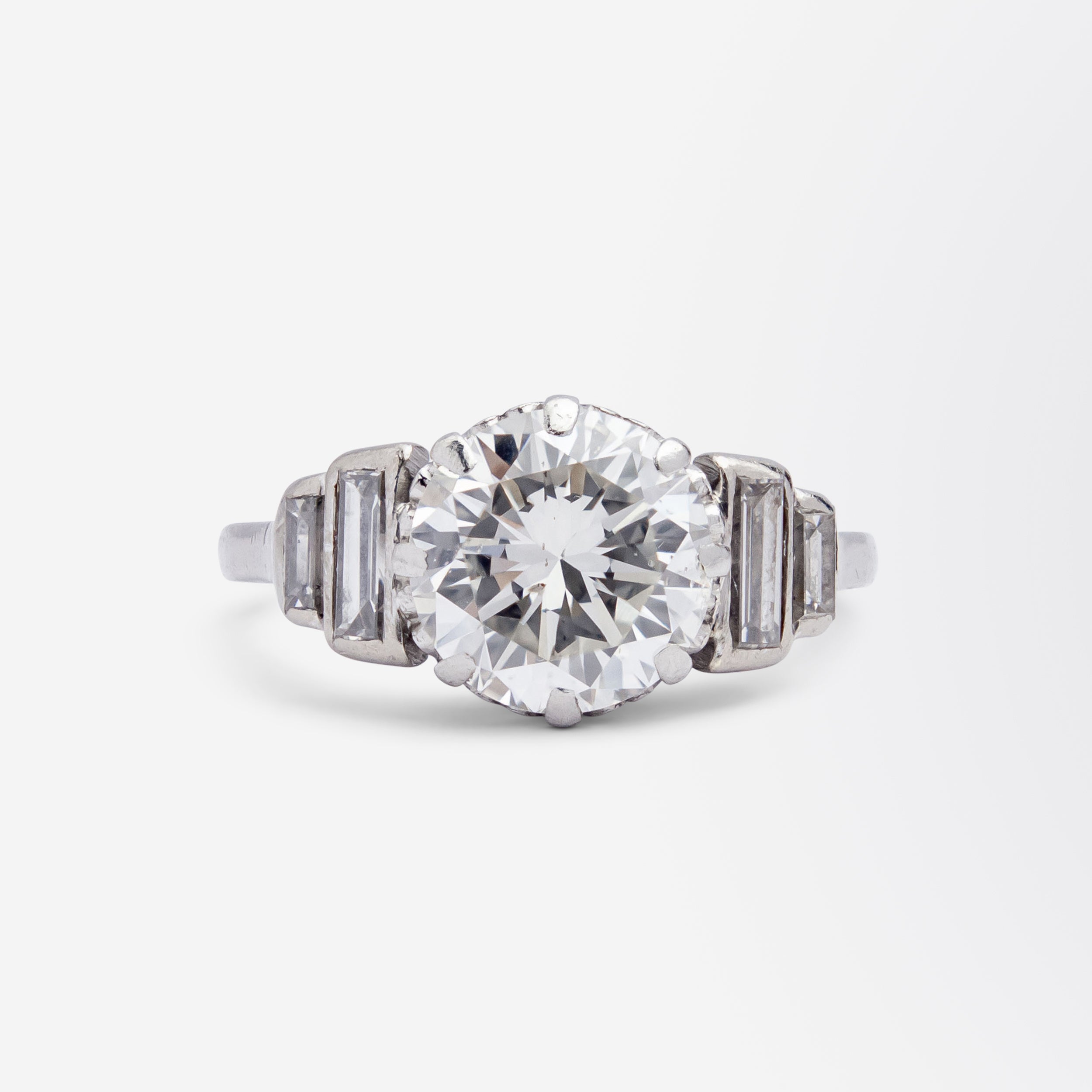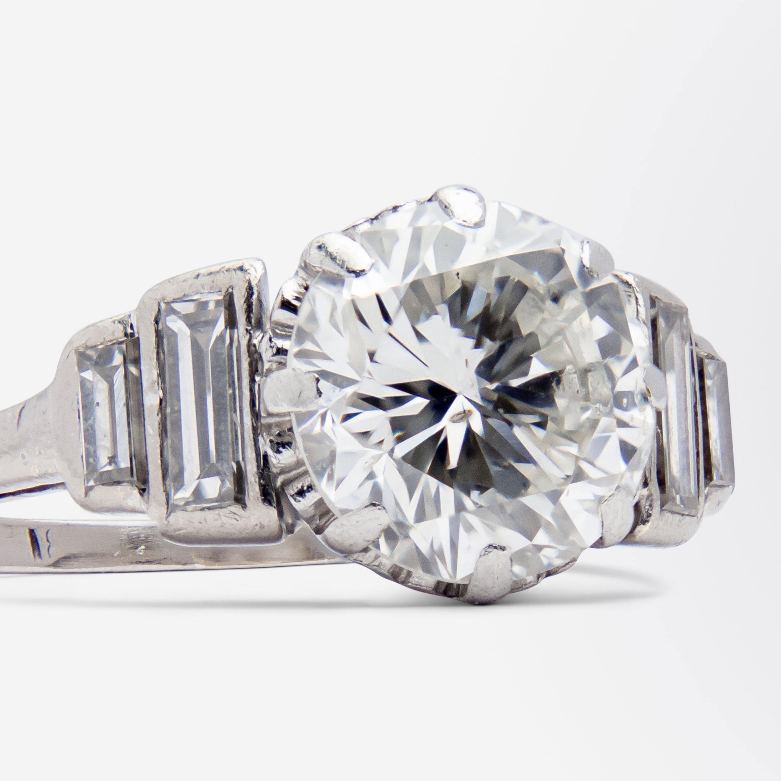 Cette magnifique bague en diamant est montée sur une monture artisanale en or blanc 18 carats. Le diamant central, rond brillant, est de couleur H et de pureté SI1, et pèse 2 carats. Sertie par huit griffes, cette monture est flanquée de deux diamants taille baguette de couleur G et de pureté VS, sertis clos. Bien que poinçonnée « PLAT » pour platine, la monture est en réalité en or blanc 18 carats et présente des traces d'ajustement pour une taille de doigt plus importante. Cette bague est d'une beauté exceptionnelle, malgré quelques micro-rayures dues à l'usure. Elle peut être portée avec des alliances en or simples ou des alliances serties de diamants pour un effet plus imposant. Une superbe bague de fiançailles pour une future mariée à la recherche d'une pièce vintage et éco-responsable.