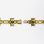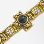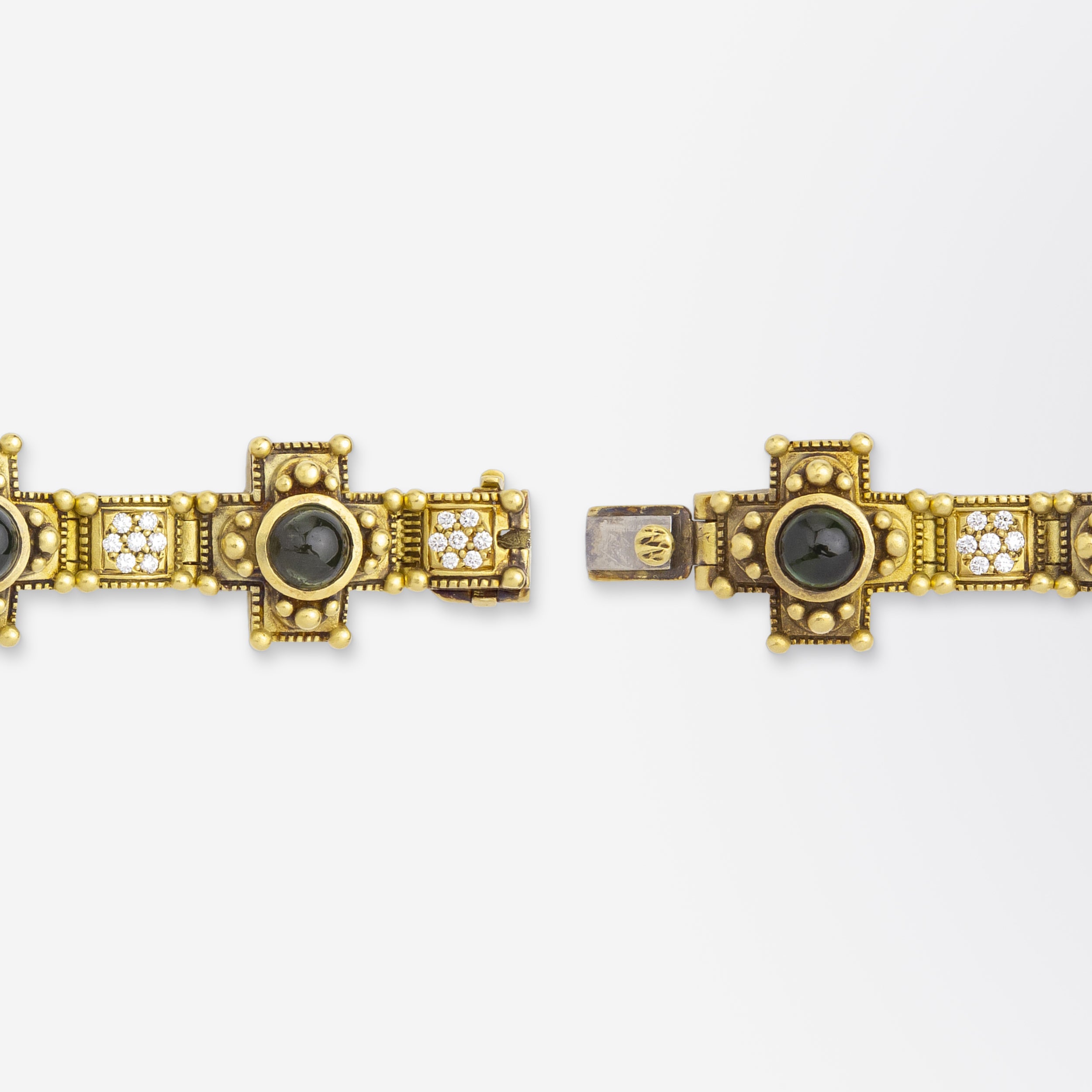 Ce bracelet, réalisé en or jaune 18 carats et serti de diamants et de tourmalines vertes cabochon, est une création du joaillier américain Barry Kieselstein-Cord. Il présente une série de motifs en forme de croix de Malte, chacun centré sur une tourmaline verte cabochon (six pièces au total). Entre chaque croix se trouve un maillon serti de sept diamants ronds taille brillant, de couleur G et de pureté VS, soit 42 diamants au total et 0,74 carat. Chaque maillon du bracelet est orné d'une granulation d'or qui, associée aux autres éléments, confère à la pièce une allure gothique. Le bracelet se ferme par un fermoir à cliquet avec un cran de sécurité intégré. On note quelques légères abrasions sur certaines tourmalines et de petites fissures superficielles sur deux diamants, signes d'usure normaux pour son âge. En très bel état général, ce bracelet est un exemple exceptionnel du travail de Kieselstein-Cord, créateur culte aux États-Unis et dans le monde entier.