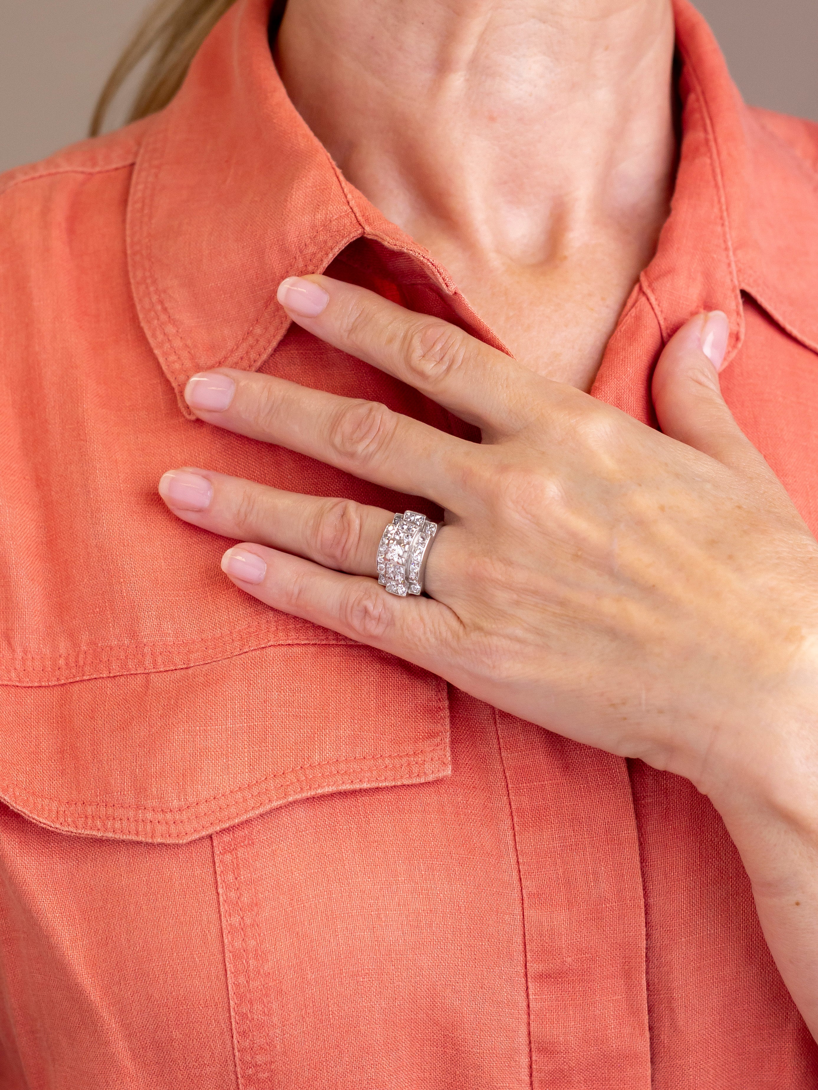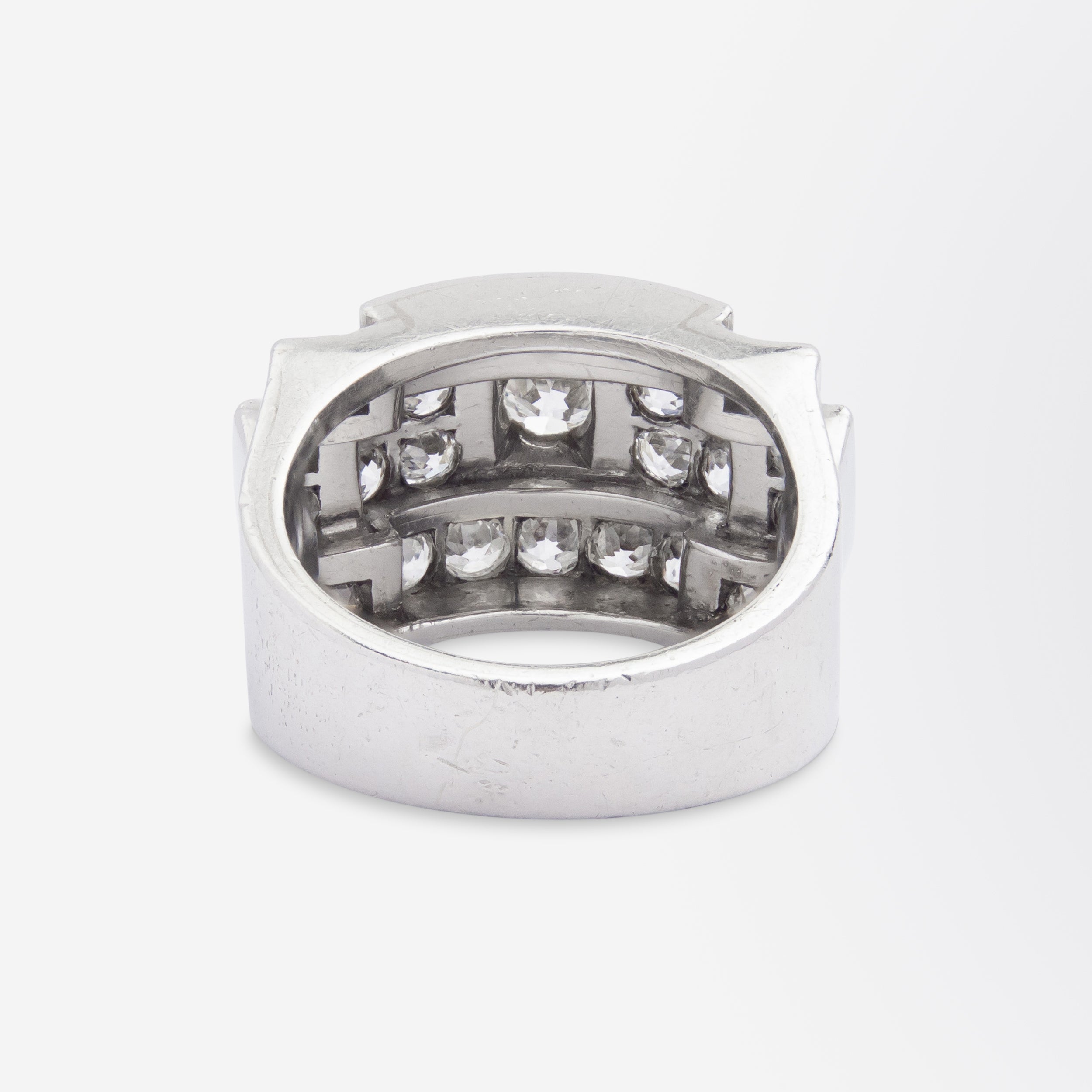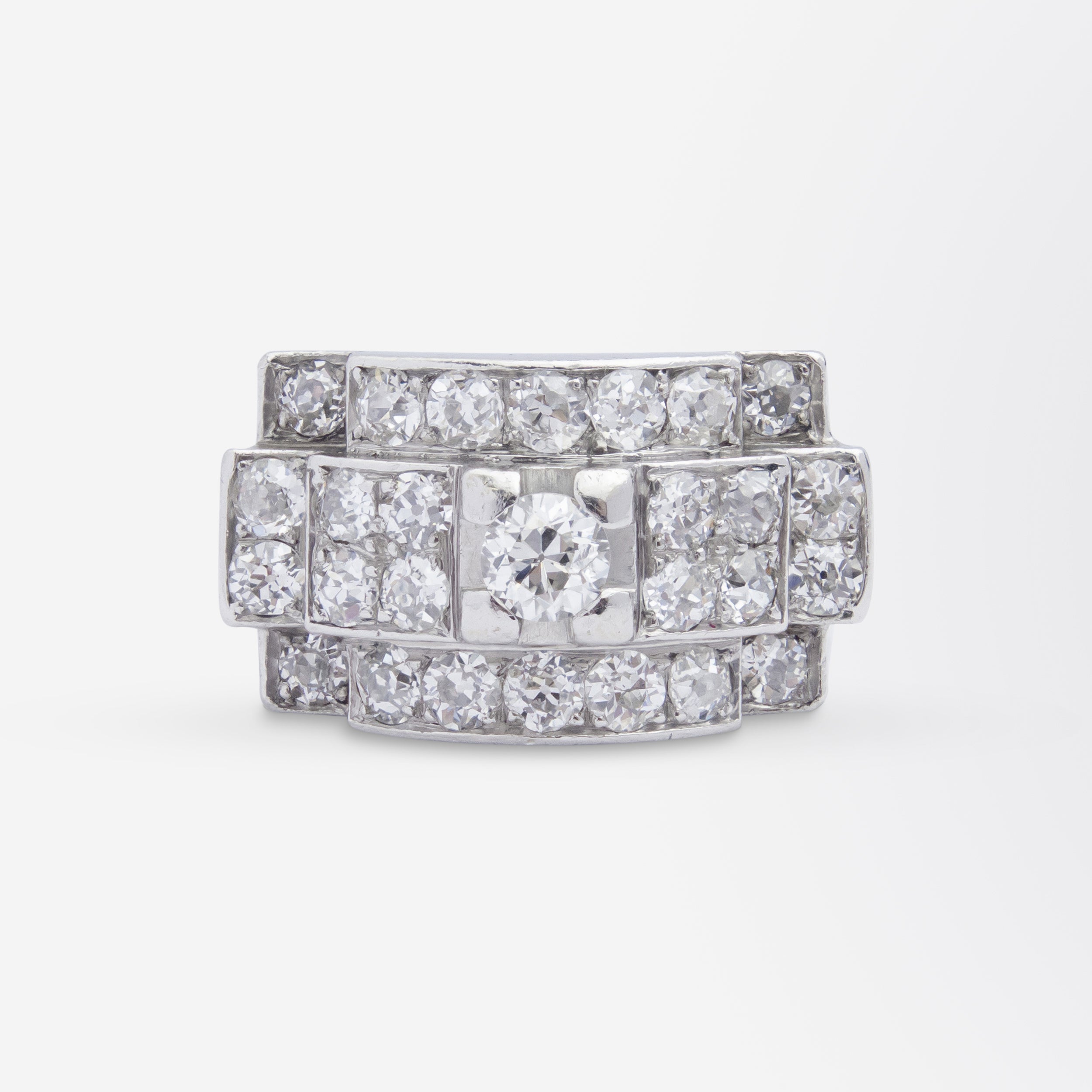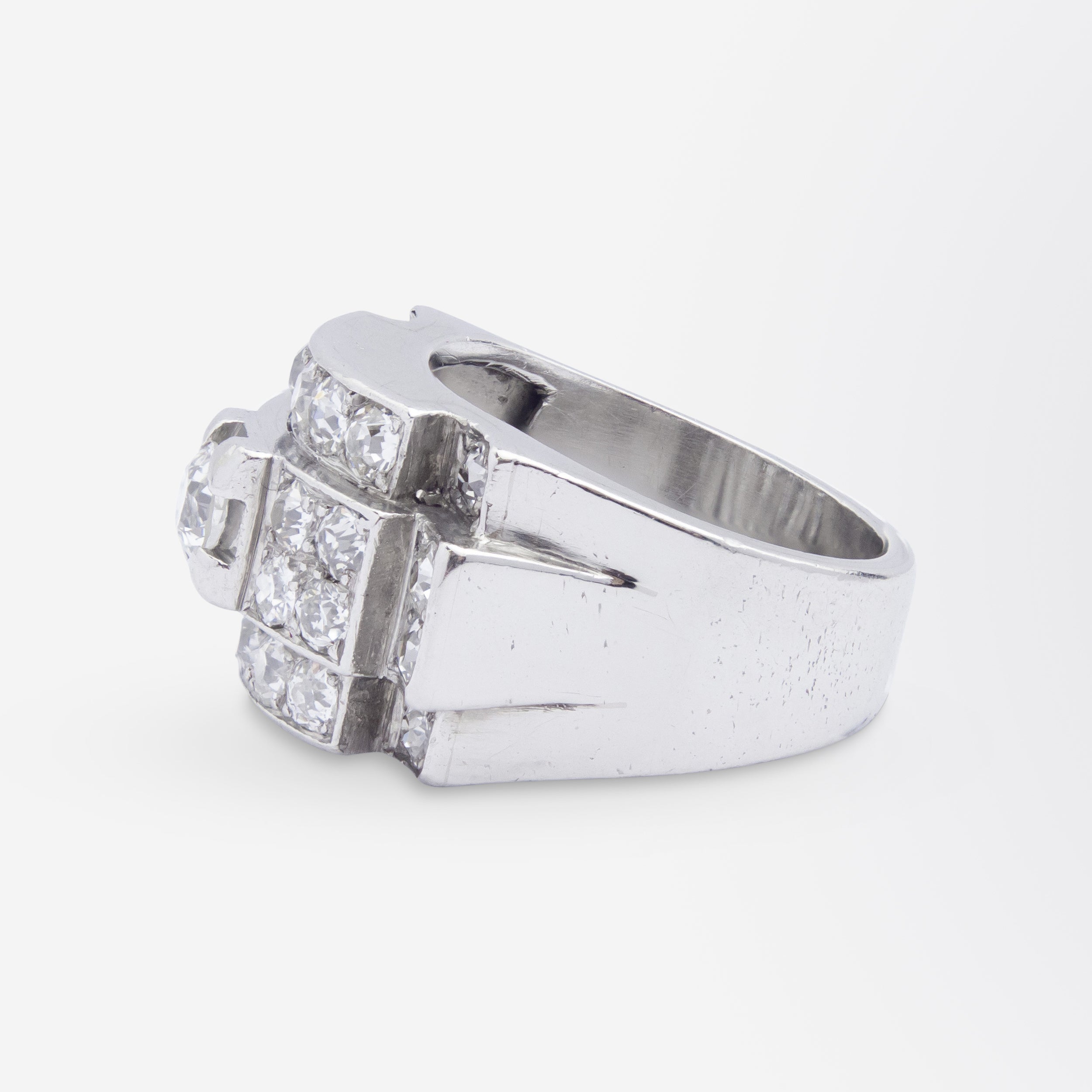 Cette bague Art déco tardive, en platine et diamants, est de style « tank » et a été fabriquée en France vers 1940. Magnifiquement réalisée à la main, elle présente des plateformes étagées qui lui confèrent une allure architecturale ou « mécanique », évoquant souvent les chars d'assaut, leurs chenilles et leur construction robuste. La bague est entièrement sertie de diamants taille ancienne européenne. La pierre centrale, de 0,24 carat, est de couleur G/H et de pureté SI1 ; elle présente une légère fracture superficielle. Les autres diamants sont de couleur G/H et de pureté VS-SI. Un gemmologue a noté que l'un d'eux présente un éclat au niveau du rondiste. Ces défauts sont imperceptibles, sauf à l'aide d'une loupe de bijoutier à fort grossissement. Sur l'anneau, on distingue un poinçon français effacé, probablement l'ancien poinçon du platine, devenu invisible avec le temps et l'usage. Un bel exemple de bijou de style « tank » fabriqué en France à la fin de la période Art déco.