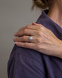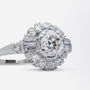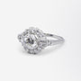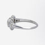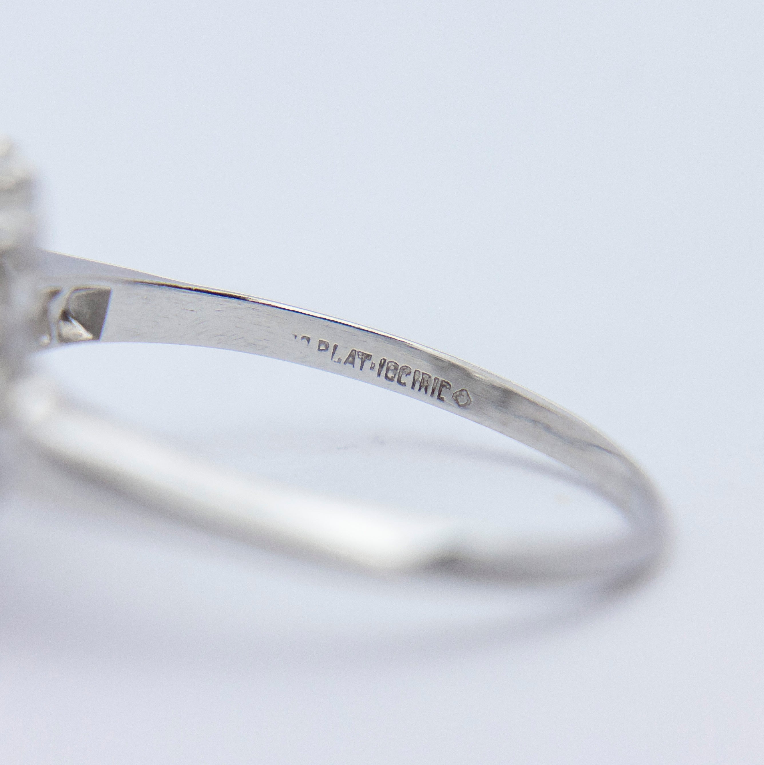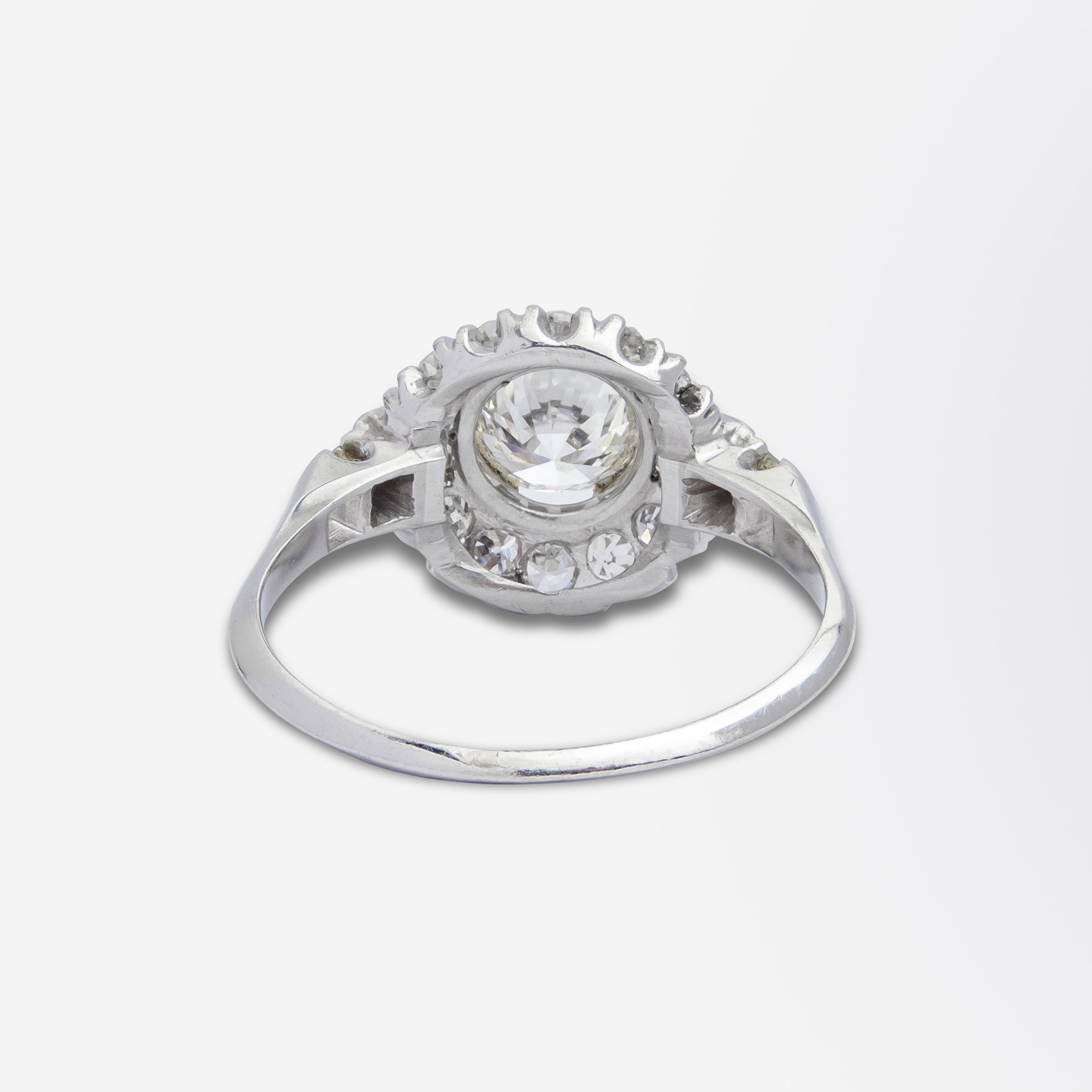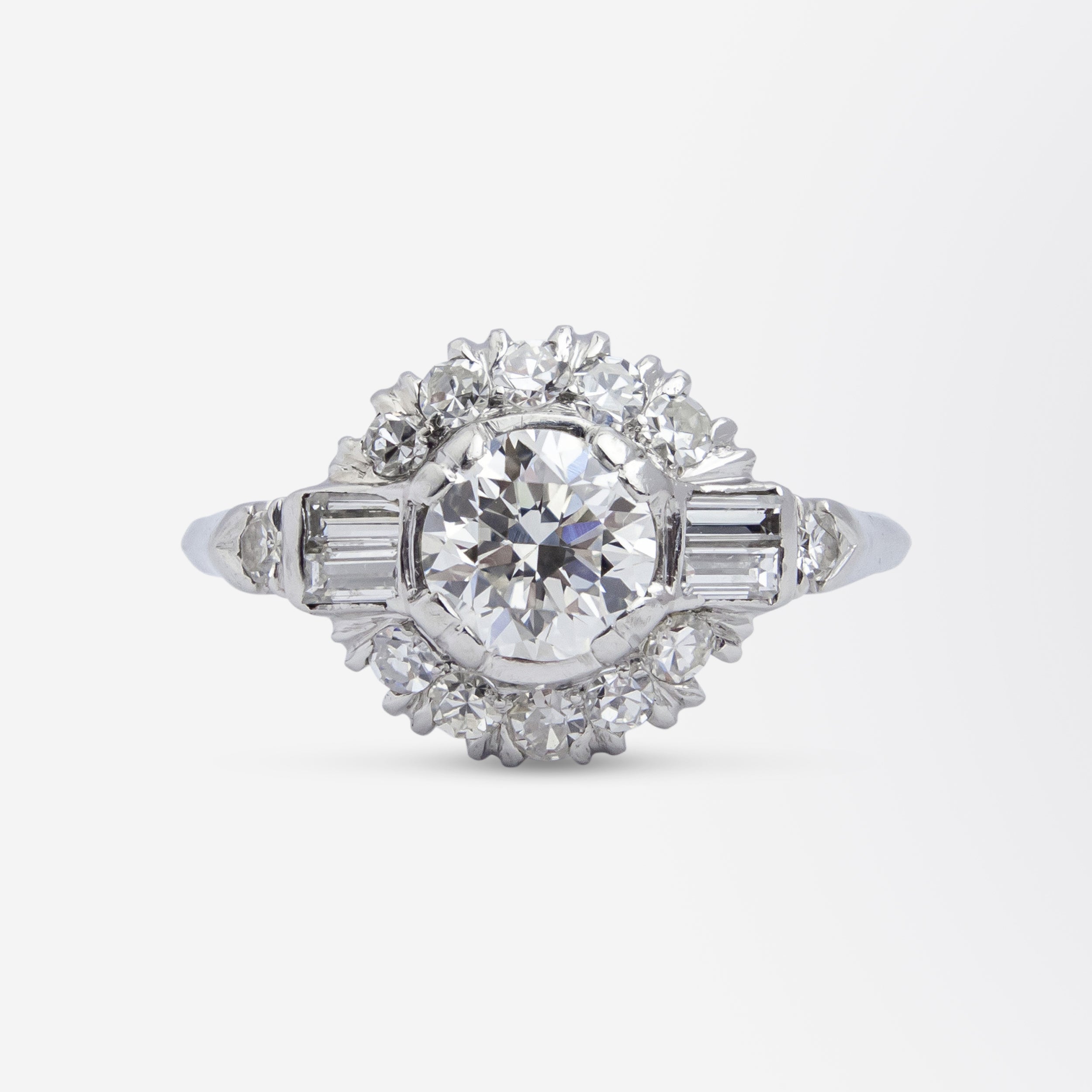 Confectionnée en platine et sertie de diamants, cette bague date de l'apogée de l'Art déco. La monture en platine, réalisée à la main, met en valeur un diamant taille brillant ancien de couleur H/I et de pureté VVS2, totalisant 0,75 carat. Ce diamant est entouré de demi-halos de diamants taille simple, interrompus par deux diamants taille baguette sur chaque épaulement. Un autre diamant taille simple est serti sur chaque épaulement de la monture en platine. L'ensemble des diamants, taille simple et baguette, est de couleur GI et de pureté VS-SI, pour un poids total de 0,51 carat. La fabrication de cette bague remonte à environ 1935, juste avant la Seconde Guerre mondiale, et son style évoque avec force les codes esthétiques de l'Art déco. Une bague absolument magnifique qui pourrait être offerte comme bague de fiançailles au XXIe siècle à une future mariée amatrice de bijoux anciens.
