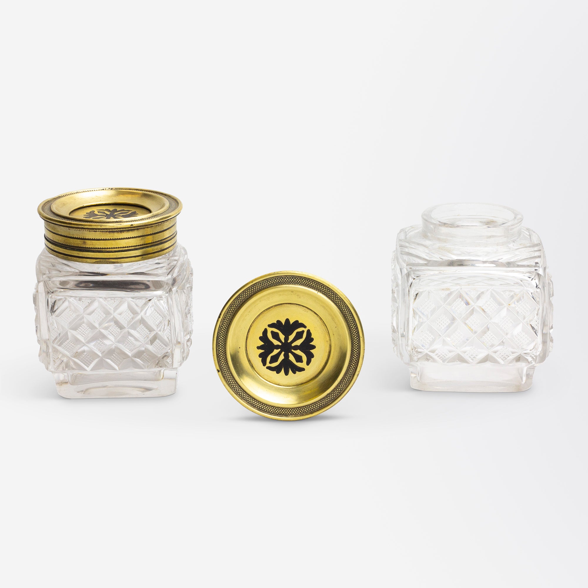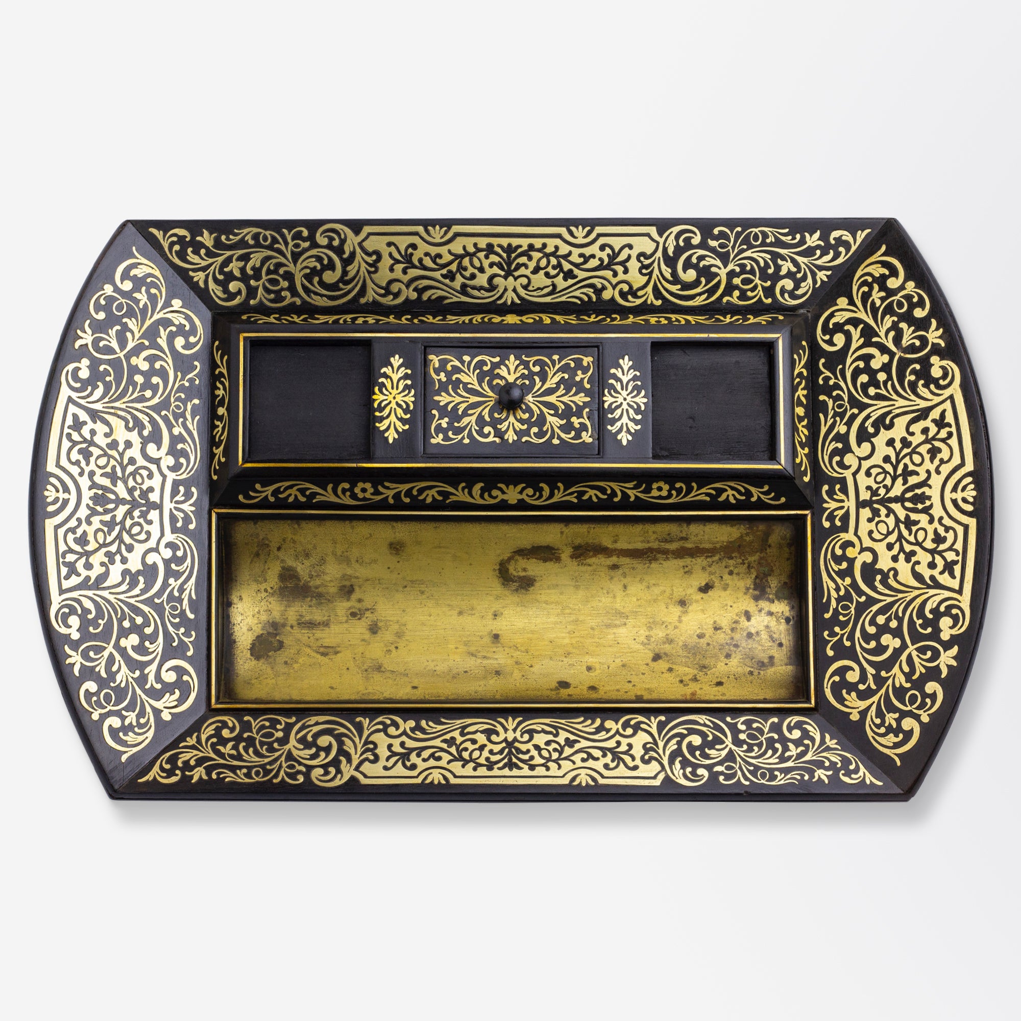 Un encrier Napoléon III en ébène, incrusté de marqueterie de laiton, un porte-plume en bronze doré et deux encriers en cristal. Le soin et le savoir-faire déployés pour la création de cette pièce sont manifestes.