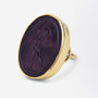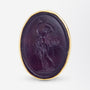 Cette bague inhabituelle renferme ce que l'on appelle souvent une intaille en verre de Tassie. Cette intaille en verre aubergine, représentant une nymphe au tambourin, date probablement de la fin du XVIIIe siècle et a été sertie dans une monture en or jaune 9 carats beaucoup plus récente. Cette intaille particulière semble être signée à l'envers « WHITLEY », probablement le nom de l'artisan qui a sculpté la nymphe dansante. Il est possible que la figure représente Bacchante, une ancienne déesse grecque, disciple de Bacchus, en état d'extase sous l'influence du vin, de la nature et de la musique. Le terme « verre de Tassie » désigne un style d'intailles en verre sculpté, généralement des copies d'œuvres antiques, rendues célèbres par James Tassie dans la seconde moitié du XVIIIe siècle. Bien que cette pièce ne soit pas de James Tassie lui-même, elle s'inspire probablement de son travail de la même époque. L'intaille est montée sur une monture en or jaune 9 carats, plus récente et réalisée à la main. La monture en or présente des marques d'usure dues à l'âge et à la taille imposante de la bague, mais met magnifiquement en valeur l'intaille. L'intaille en verre est intacte et présente quelques minuscules ébréchures et une usure superficielle normale pour son âge et son usage. Une bague véritablement unique qui, de par sa taille imposante et son histoire, ne manquera pas de susciter l'admiration de son nouveau propriétaire.
