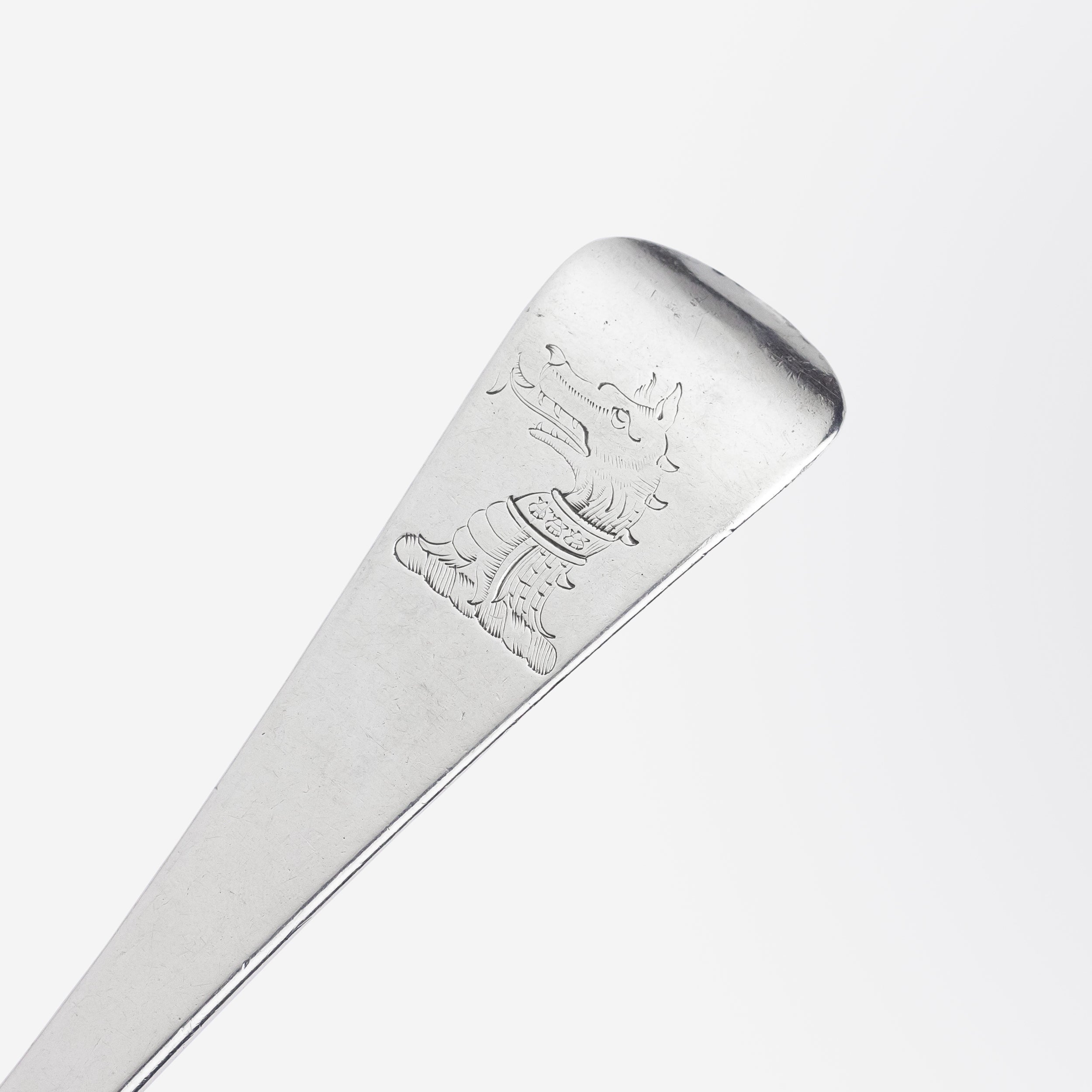 Fabriquée en argent massif, cette cuillère à soupe a été confectionnée à Dublin sous le règne de George III d'Angleterre. Le revers du manche présente un ensemble de poinçons permettant de dater sa fabrication à Dublin en 1786. Malheureusement, le poinçon du fabricant est effacé et illisible. L'argenterie géorgienne de cette période, en particulier les couverts, présente malheureusement souvent des poinçons effacés. Ainsi, bien que nous sachions quand cette pièce a été fabriquée, nous ignorons par qui. Au revers du manche se trouve un blason de dragon finement gravé, probablement celui de la famille du premier propriétaire. La cuillère est en bel état de conservation et, hormis quelques éraflures superficielles normales, elle ne présente que peu de signes d'usure. Ravissante pièce d'argenterie du XVIIIe siècle, elle serait un bel ajout à une table de Noël ou un cadeau idéal pour une pendaison de crémaillère, pour le plus grand plaisir des amateurs de belles choses.