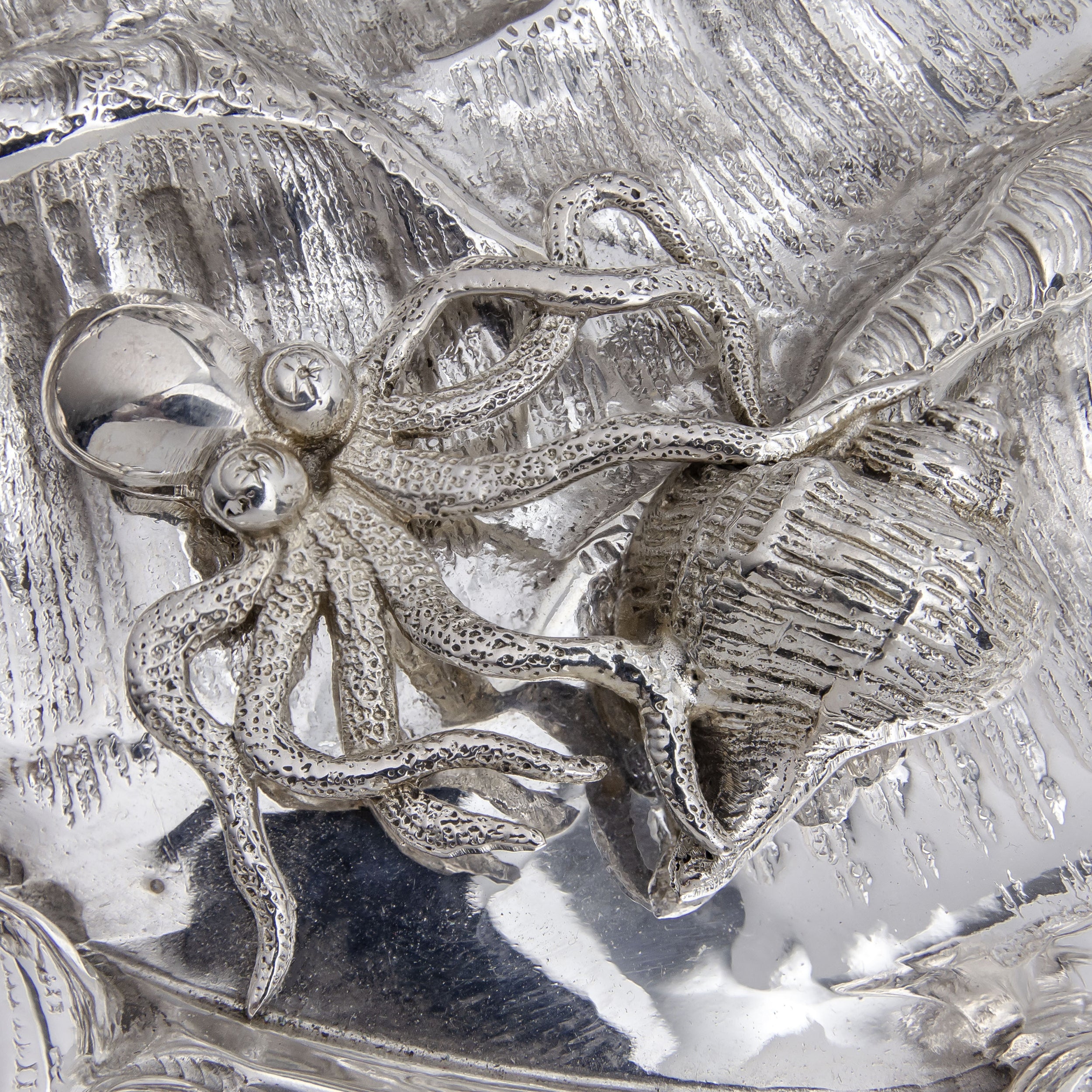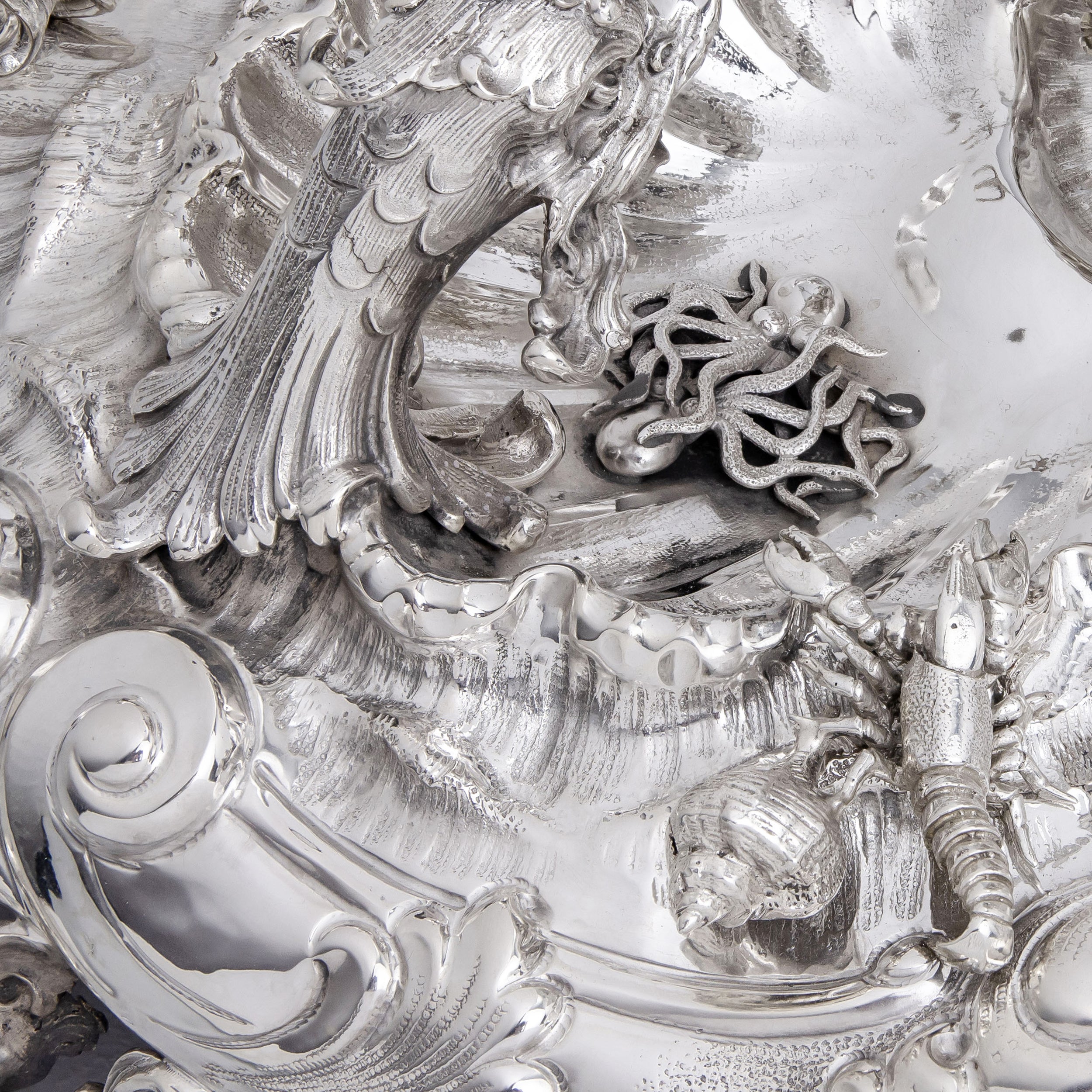 Cette fontaine de table monumentale a été fabriquée en Italie au milieu du XXe siècle et est réalisée en argent. Forgée à Milan en argent 800 millièmes (norme italienne), probablement à la fin des années 1960, elle porte le poinçon de la maison « Eugenio e Angelo Orefice », dont l'atelier était actif de 1955 à 1971. Le poinçon de Milan, présent sur cette pièce, n'a été introduit qu'en 1968, et la collaboration d'Eugenio et Angelo Orefice s'est terminée en 1971, ce qui nous permet de dater avec certitude sa fabrication entre 1968 et 1971. La partie centrale de la fontaine représente Neptune assis, dominant d'autres représentations de Neptune, des coquillages, des roseaux, des hippocampes, des crabes et des pieuvres. Cette pièce a récemment été polie et révisée par notre orfèvre. Cependant, la pompe n'a pas encore été câblée ni testée ; ses nouveaux propriétaires devront donc effectuer ces opérations pour que la fontaine fonctionne. Plusieurs autres fontaines de table signées Eugenio et Angelo Orefice ont été vendues par des antiquaires et des maisons de vente aux enchères prestigieuses. Toutefois, il est fort probable que cet exemplaire soit unique en Australie. Objet monumental, il suscitera l'admiration chez un collectionneur d'argenterie ou deviendra la pièce maîtresse d'un intérieur raffiné.