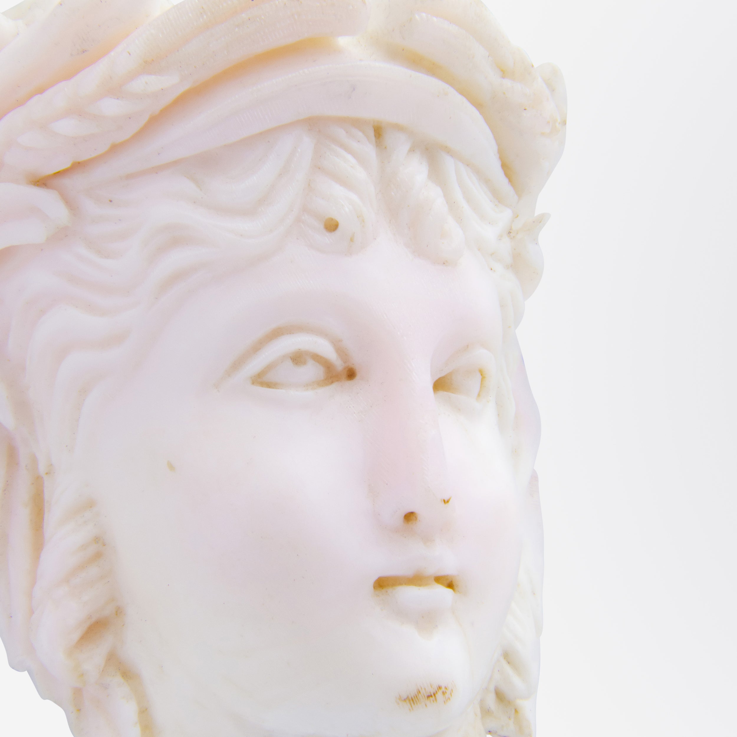 Cet ensemble de boucles d'oreilles et de broche du XIXe siècle est probablement un souvenir du Grand Tour en Italie, vers 1870. Finement sculptées, les pièces, de style néo-étrusque, représentent une femme classique et une urne suspendue à la broche. Cette urne est amovible, permettant ainsi de porter la broche seule. De petits anneaux à l'arrière des boucles d'oreilles indiquent qu'elles possédaient également des urnes amovibles, aujourd'hui disparues. Les boucles d'oreilles sont munies de fermoirs à vis, typiques de l'époque, mais il serait possible de les remplacer par des fermoirs à crochet. Le corail de cet ensemble, d'une magnifique couleur « peau d'ange », est si pâle qu'il ressemble presque à de la porcelaine. Un ravissant ensemble du Grand Tour qui fera le bonheur d'une amatrice de corail.