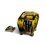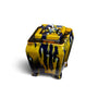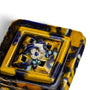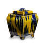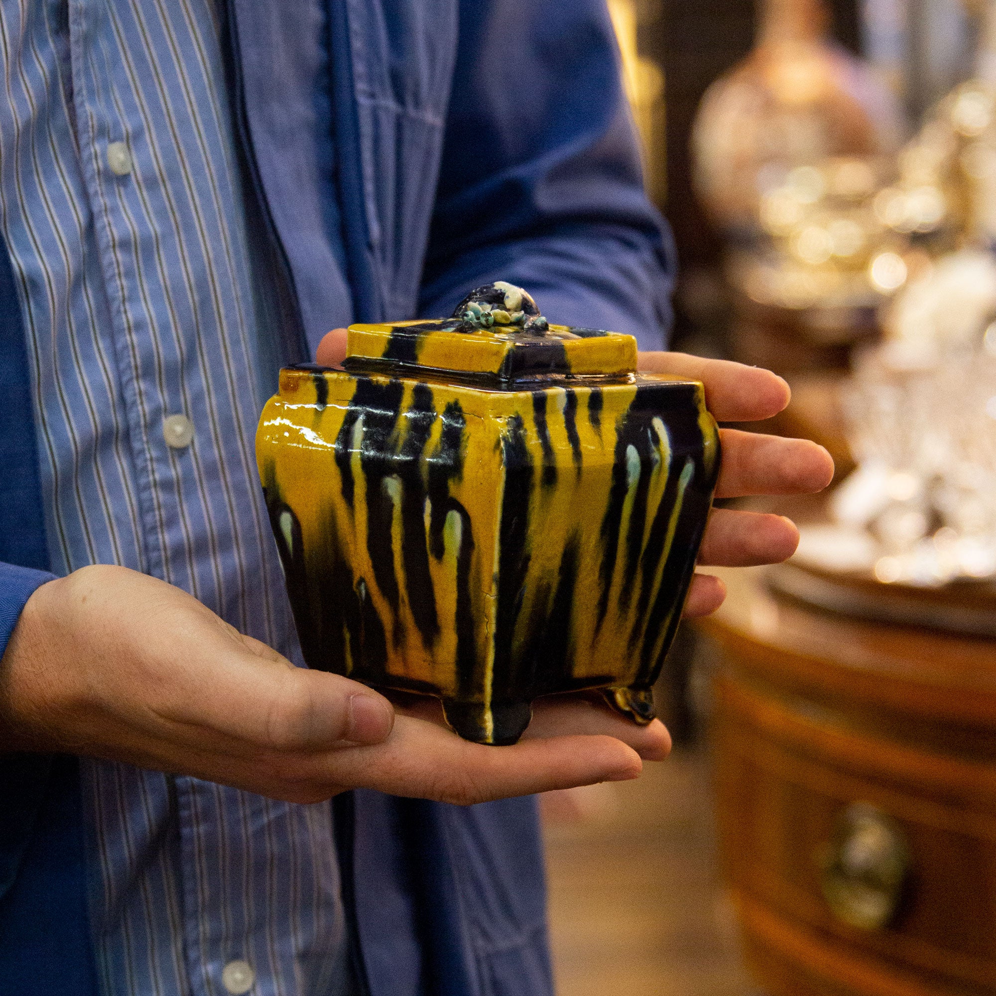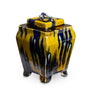 Un bel encensoir en céramique japonaise de l'ère Meiji (1868-1912), à glaçure coulante jaune, cobalt et blanche, orné d'un fleuron de cerisier sur le couvercle. L'intérieur, non émaillé, a conservé sa couleur d'origine de faïence. En excellent état, la pièce présente quelques fines craquelures dans la glaçure, typiques des céramiques de cette époque.