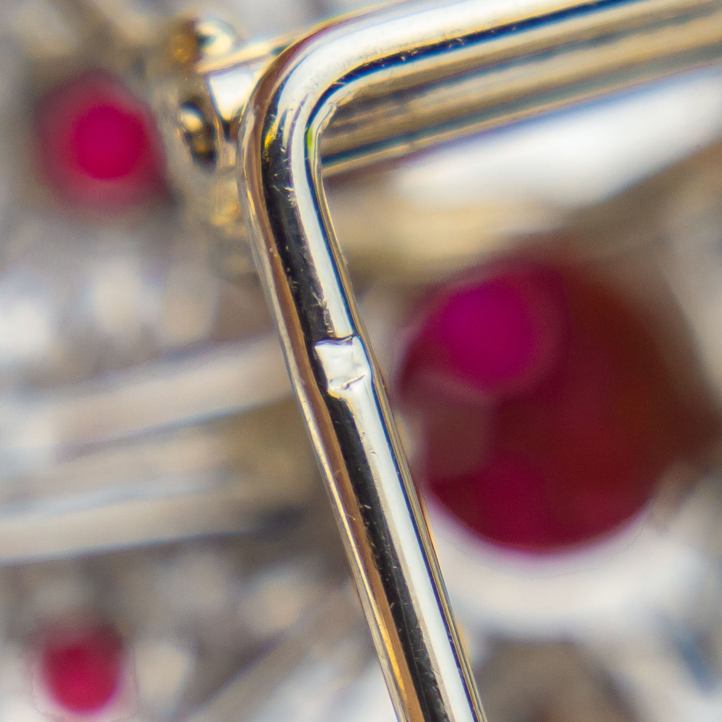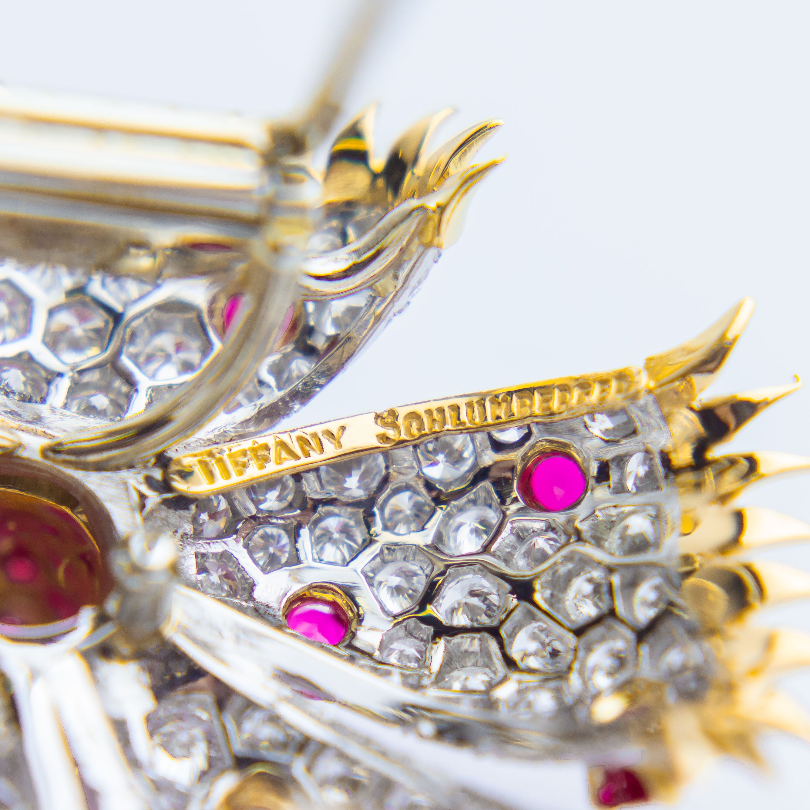 Cette broche rare, dite « Sombrero », est une création de Jean Schlumberger, fabriquée par Tiffany & Co. en France. Cette pièce remarquable représente une fleur de sombrero, également appelée « fleur de chapeau mexicain », originaire d'Amérique du Nord. La broche stylisée présente six pétales en platine et or blanc 18 carats, sertis de diamants ronds taille brillant et de rubis rouge profond. Le centre, en or jaune 18 carats, est serti de rubis rouge profond, formant la capsule de la fleur. La pièce est signée « France » et porte un petit poinçon de pureté français légèrement effacé, ainsi qu'une marque de maître orfèvre non identifiée. Au dos, une attache à double charnière avec fermoir de sécurité coulissant est en parfait état de fonctionnement. La broche est conservée dans son écrin d'origine « Tiffany & Co., design Jean Schlumberger ».