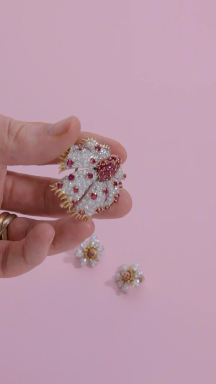 Jean Schlumberger (1907-1987) était un joaillier français qui a créé des pièces pour Tiffany & Co. au milieu du XXe siècle. Il est l'une des quatre seules personnes autorisées à signer ses créations chez Tiffany, aux côtés de Paloma Picasso, Frank Gehry et Elsa Peretti, la maison continuant de produire ses modèles aujourd'hui. Parmi les célèbres mécènes de Schlumberger figuraient Jacqueline Kennedy Onassis, Elizabeth Taylor et Rachel « Bunny » Mellon, qui fut sans aucun doute sa plus grande admiratrice et collectionneuse. Mme Mellon a légué plus de 140 pièces de sa collection Schlumberger au Virginia Museum of Fine Arts, où elles sont exposées chaque année. La broche Sombrero a été créée par Schlumberger en 1957 ; une version en saphir et diamants a été présentée dans un éditorial de Vogue, portée à la taille par un mannequin à l'époque. Cette version particulière en rubis et diamants date des années 1960, au début de la collaboration de Jean Schlumberger avec Tiffany & Co. Un exemple absolument époustouflant du travail de Schlumberger, datant de la période où il créait ses pièces les plus célèbres.