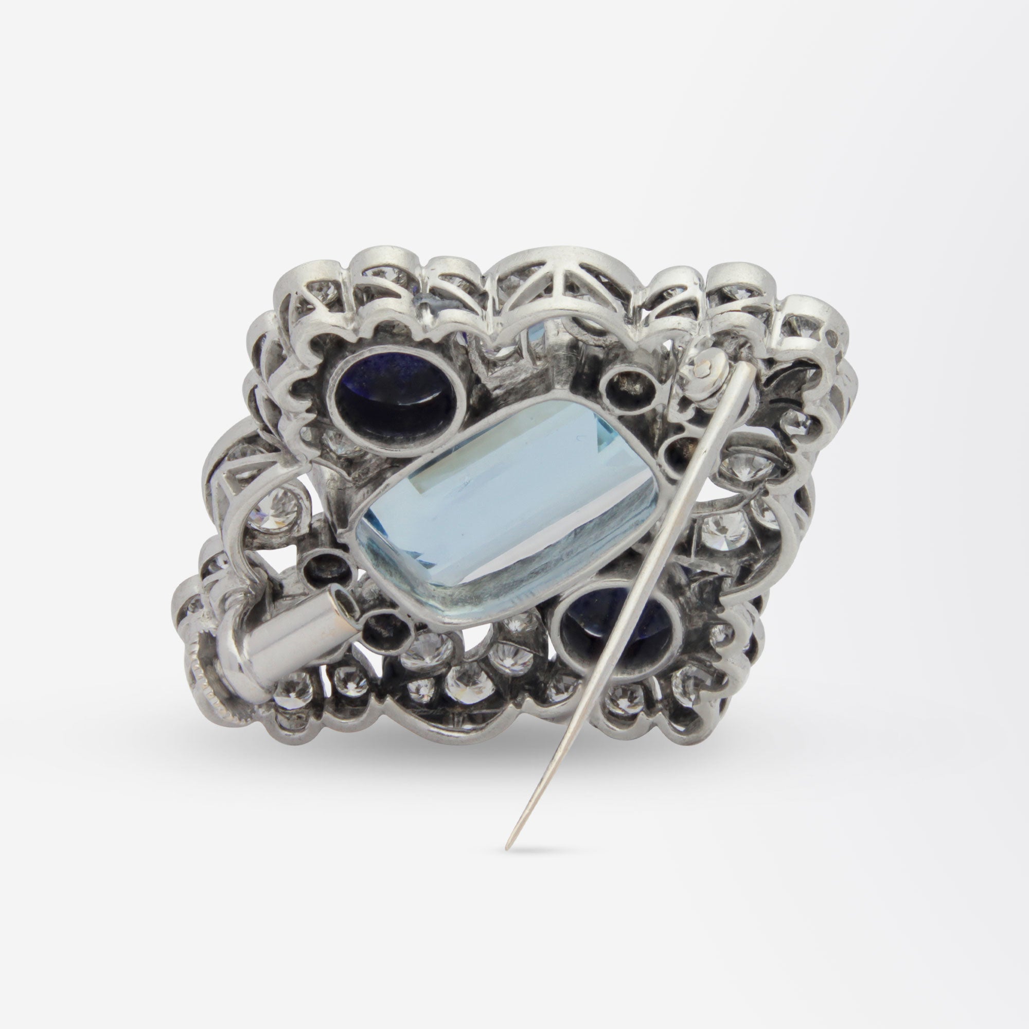 Broche exceptionnelle en argent, sertie de diamants, d'aigues-marines et de lapis-lazuli. La pièce maîtresse est une aigue-marine taille émeraude de 8,15 carats, d'un bleu clair à moyen éclatant. Deux cabochons de lapis-lazuli ronds encadrent la pierre centrale. Le pourtour de la broche est serti de 46 diamants ronds taille brillant de différentes tailles, de couleur F et de pureté VS-SI, totalisant 1,88 carat, et formant un motif en forme de cerf-volant. Bien que non poinçonnée, la broche a été testée à l'acide et s'avère être en argent, ce qui est rare pour une pièce de cette qualité, mais pas exceptionnel. Au dos, elle se ferme par une épingle à charnière et un fermoir trombone, parfaitement fonctionnels et sécurisés.
