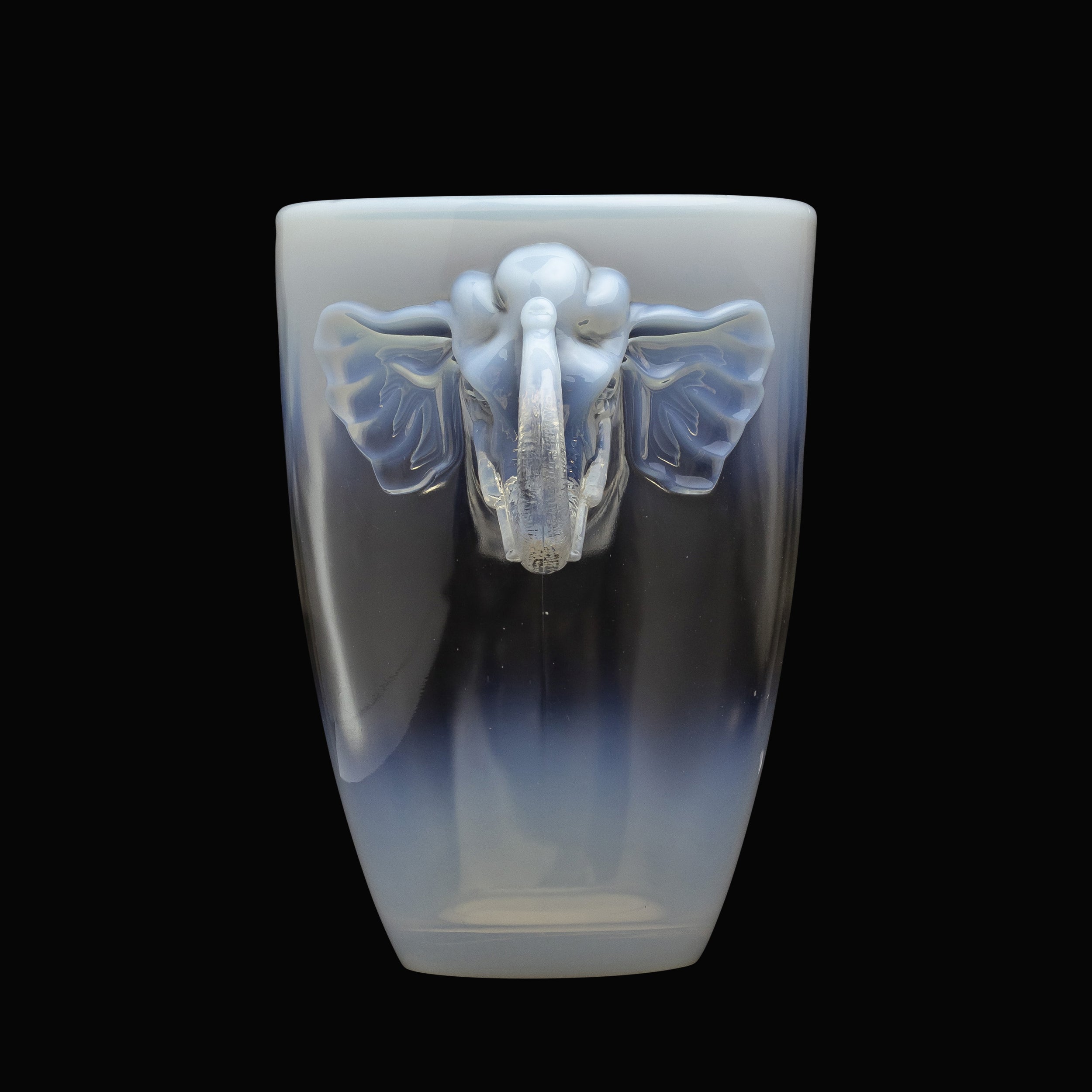 Un grand vase opalescent à anses en forme de tête d'éléphant, attribué à Barolac. La verrerie Barolac était produite en Tchécoslovaquie, à la verrerie Inwald, dans les années 1930, principalement pour l'exportation vers l'Angleterre.