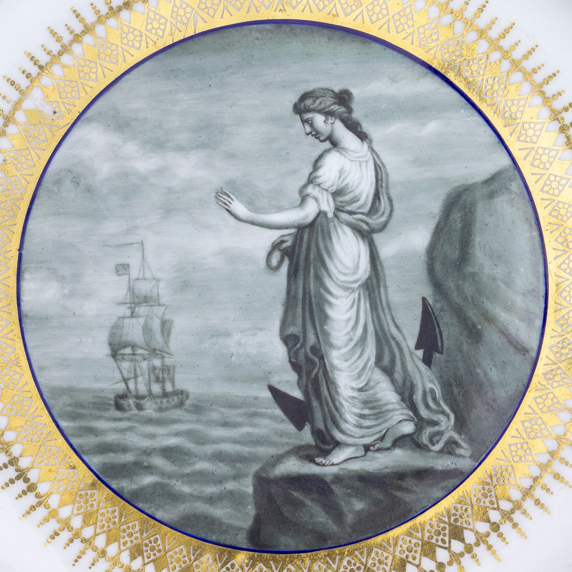 Dans l'ensemble, Hope est représentée dans diverses poses, tenant une ancre et souvent avec un navire à l'horizon. Sur cette œuvre, elle se tient sur une falaise rocheuse au bord de la mer, devant son ancre, et salue d'un geste mélancolique un navire qui passe. Chaque élément central a été peint à la main par John Pennington, considéré comme le plus grand artiste de Royal Worcester.