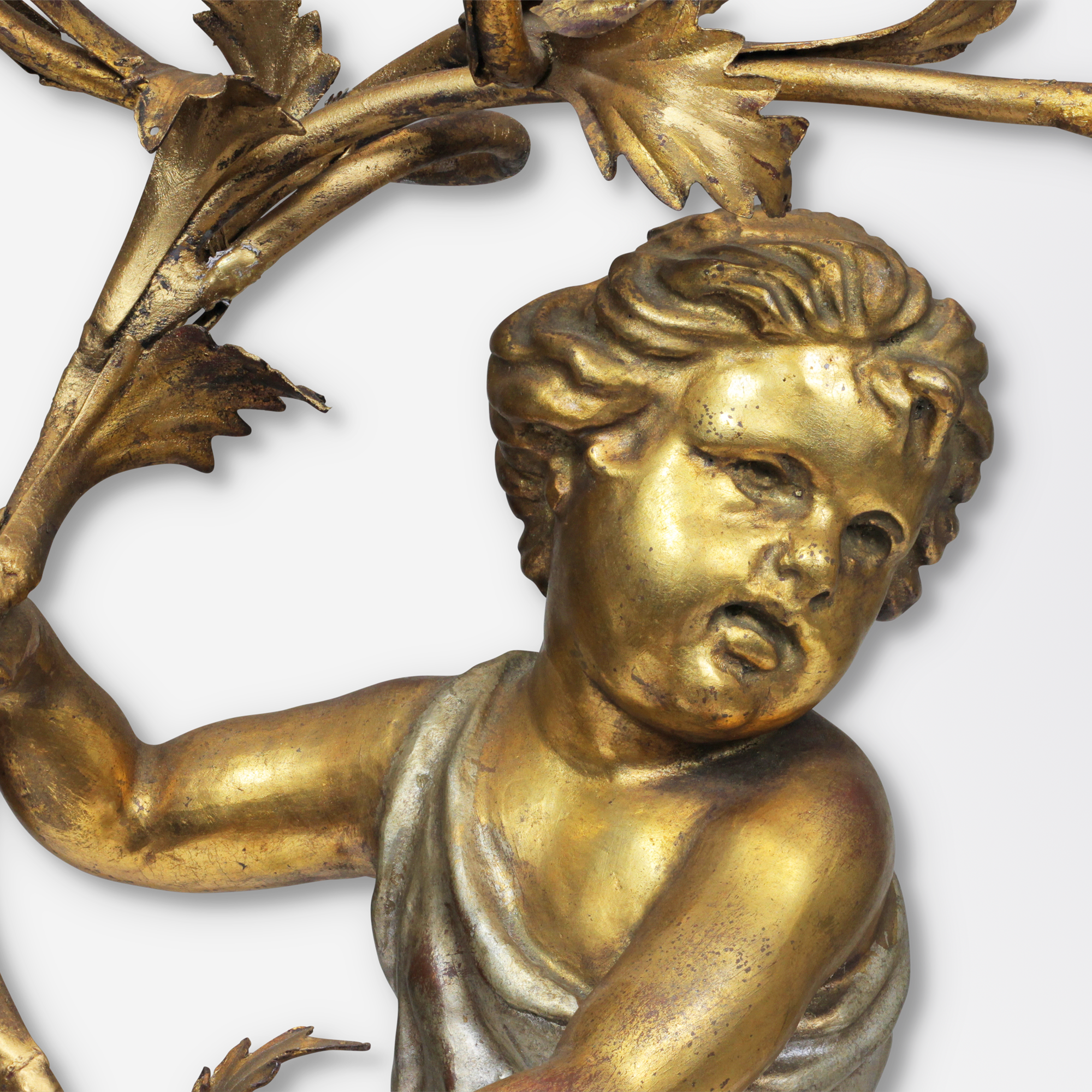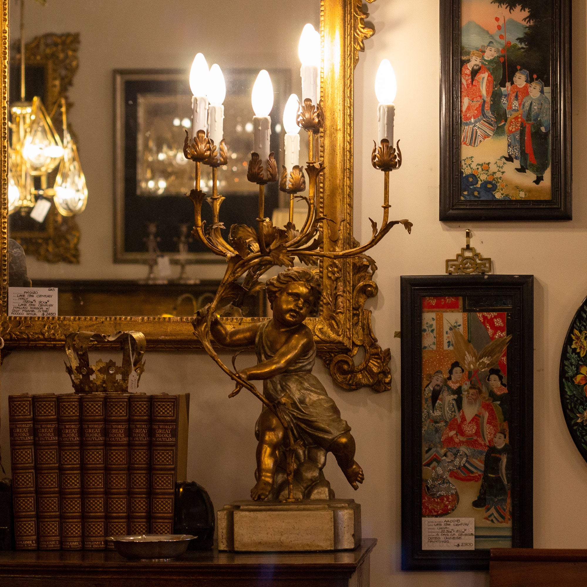 Un candélabre italien à quatre lumières, datant de la fin du XIXe siècle, orné d'un putti tenant une branche décorée de feuilles, monté sur une base carrée.