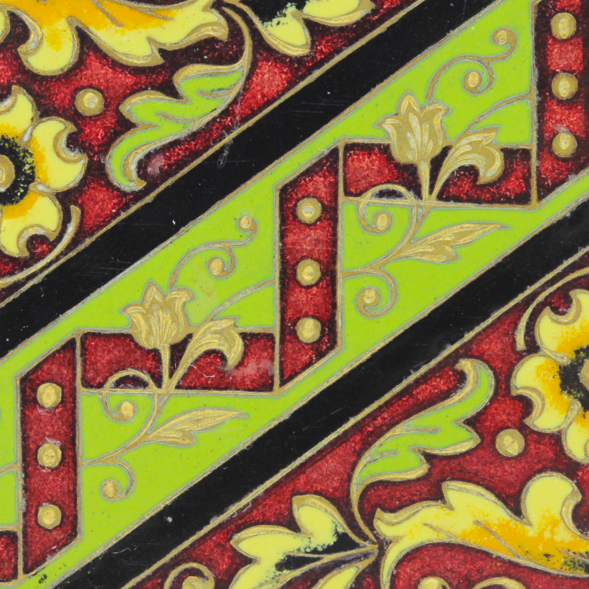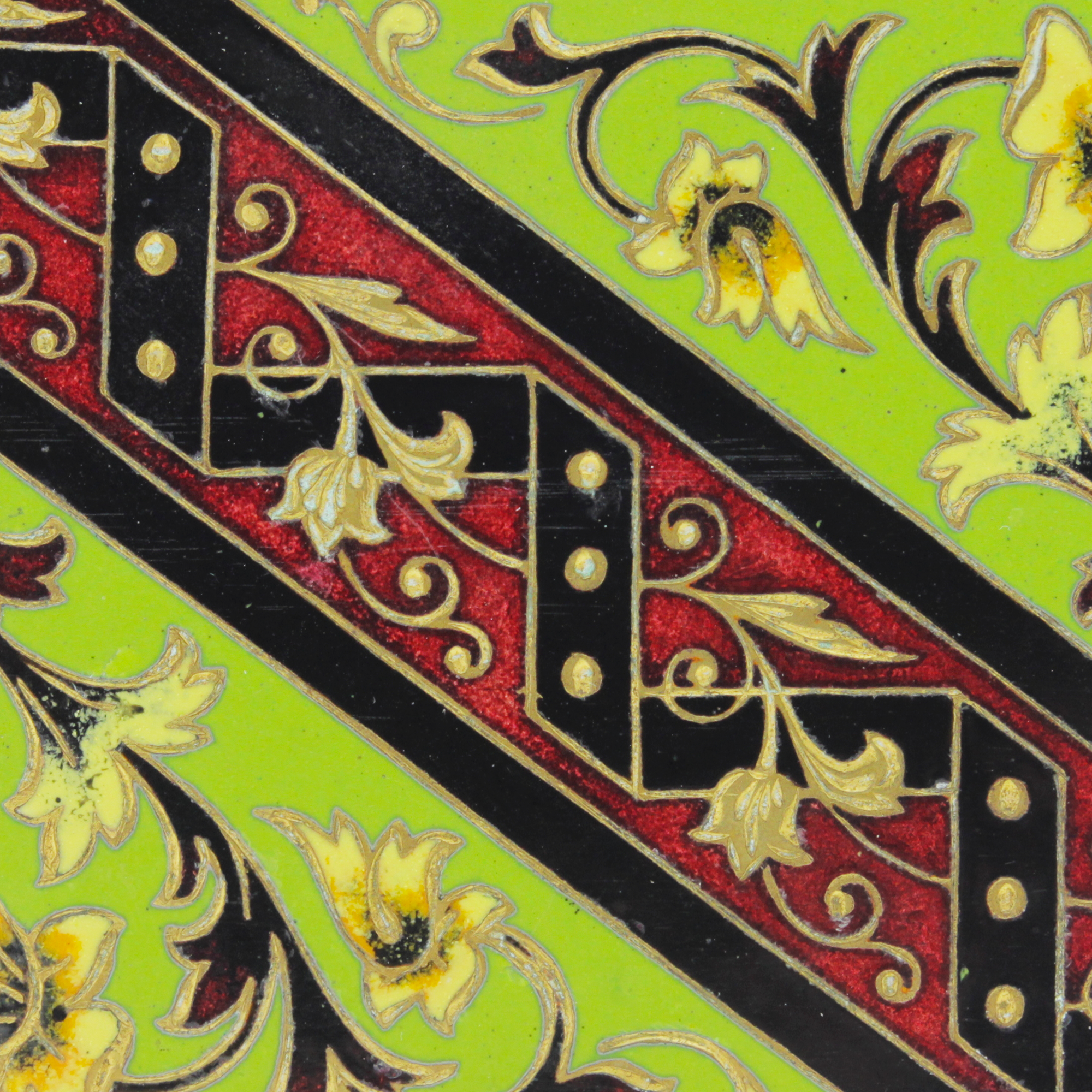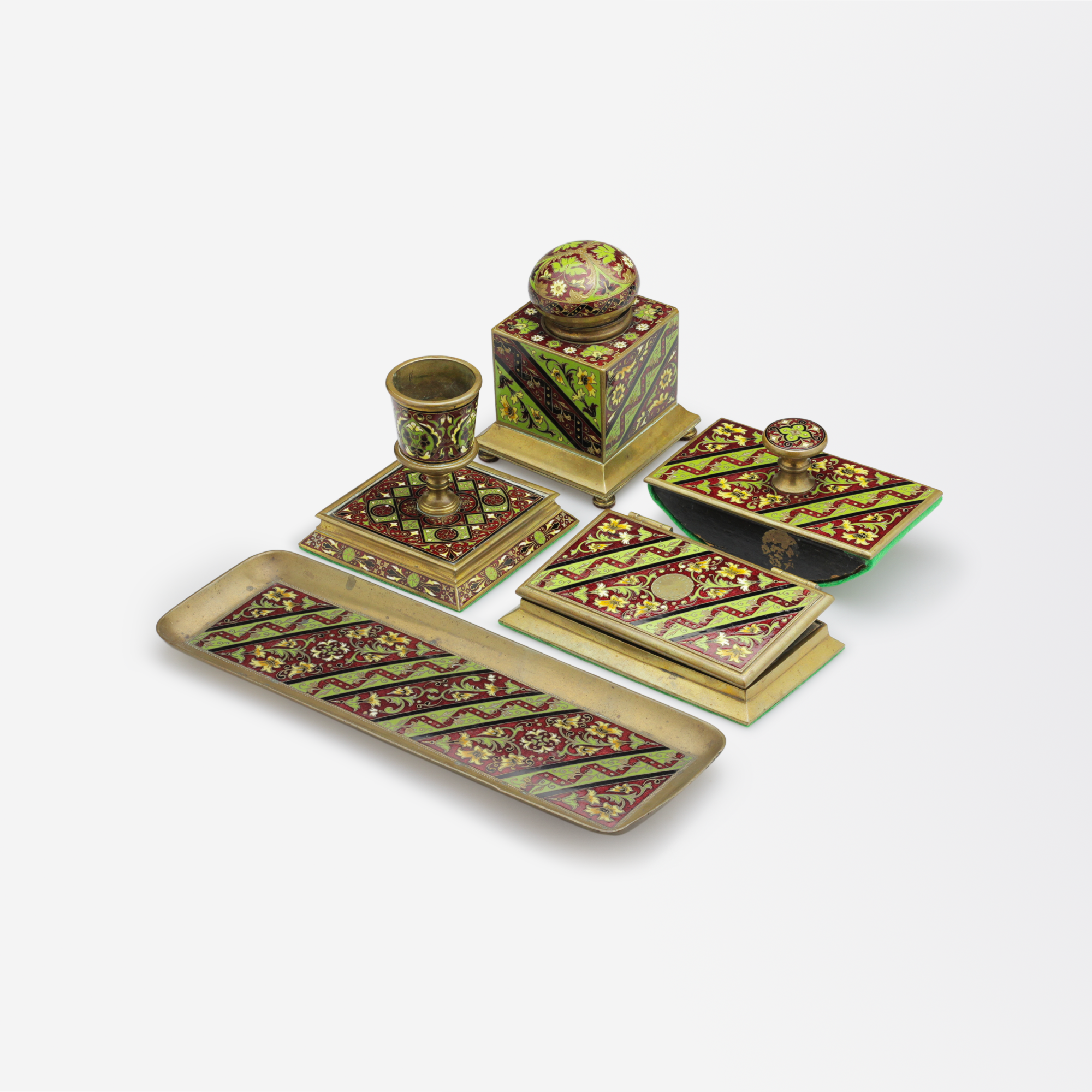Un ensemble de bureau en bronze à décor polychrome composé de cinq pièces : un porte-plume, un encrier, un buvard, un bougeoir et un trombone. Cet ensemble est russe, probablement de la fin du XIXe siècle.