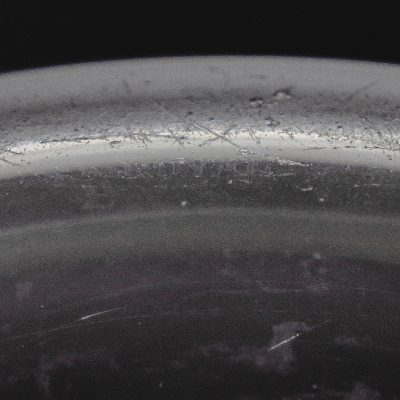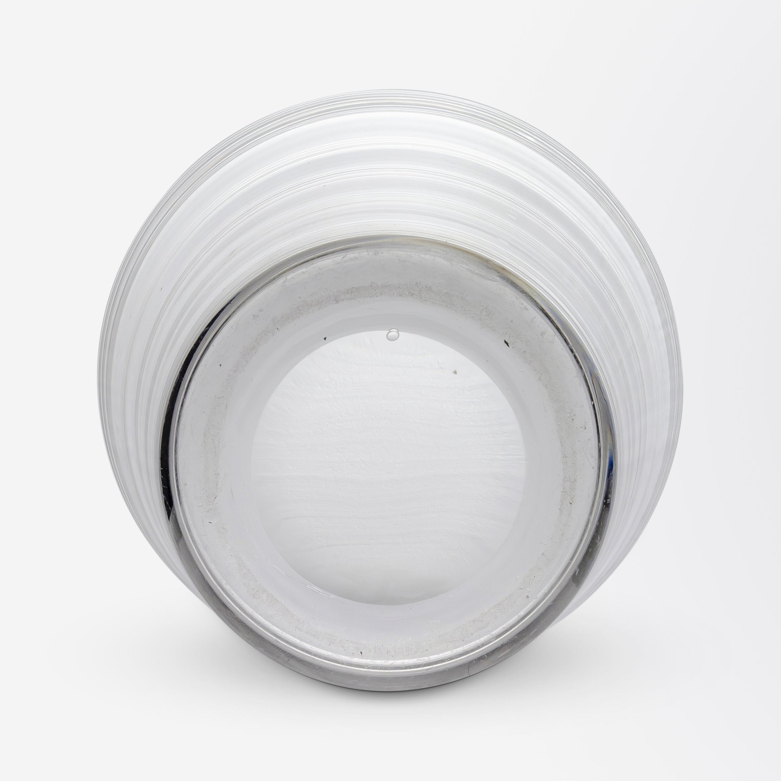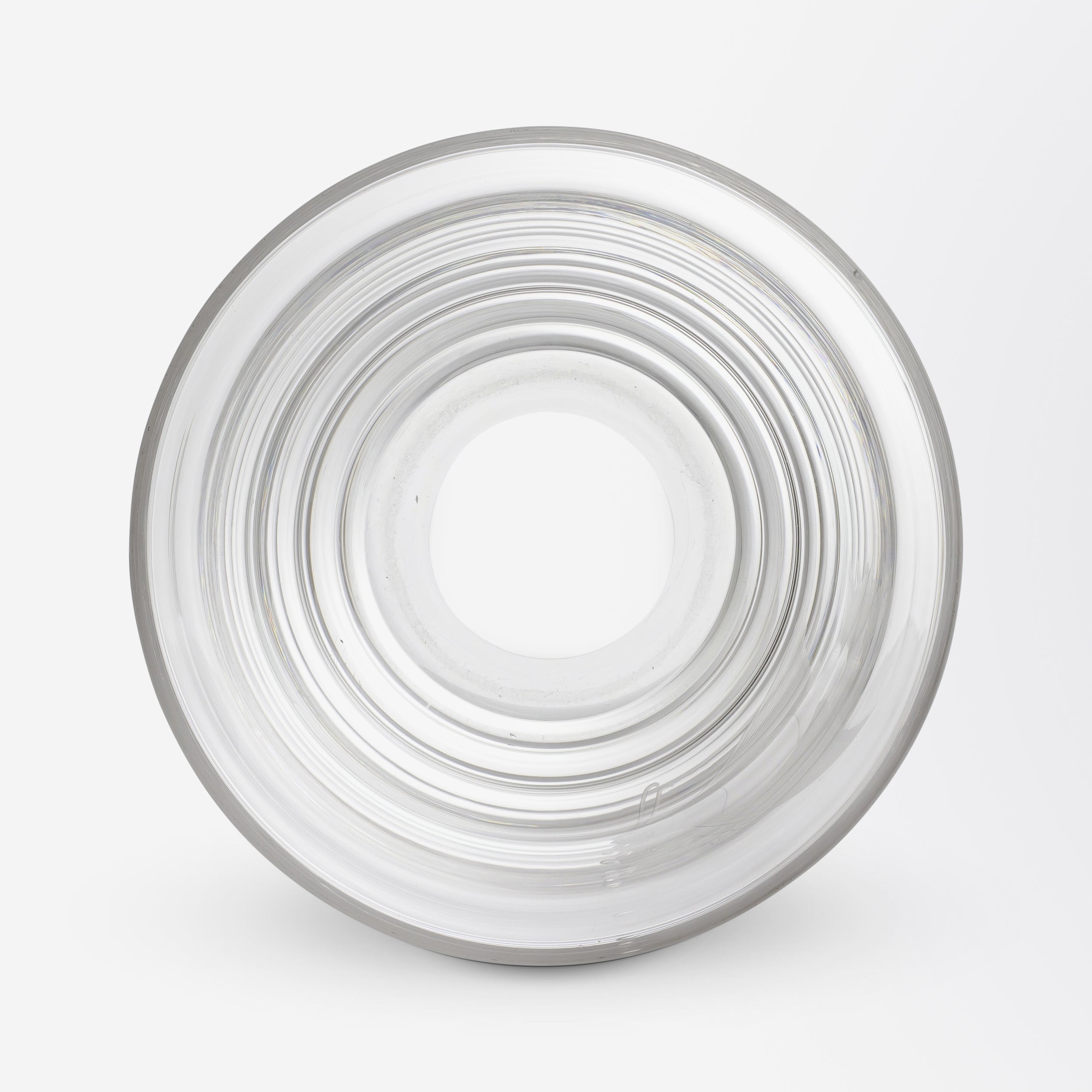 Vase Art Déco en cristal de Royal Brierley (Angleterre). Le verre, travaillé avec de larges nervures, crée un effet d'optique évoquant les ondulations de l'eau. Autre ingénieuse utilisation du cristal : l'inclusion de bulles de taille décroissante à l'intérieur du vase, se terminant par un poisson finement gravé à la roue de cuivre. L'ensemble de la pièce réunit avec brio ces trois techniques, tout en conservant une grande subtilité. Bien que non signée, cette pièce rappelle certaines collaborations entre Royal Brierley et Keith Murray.
