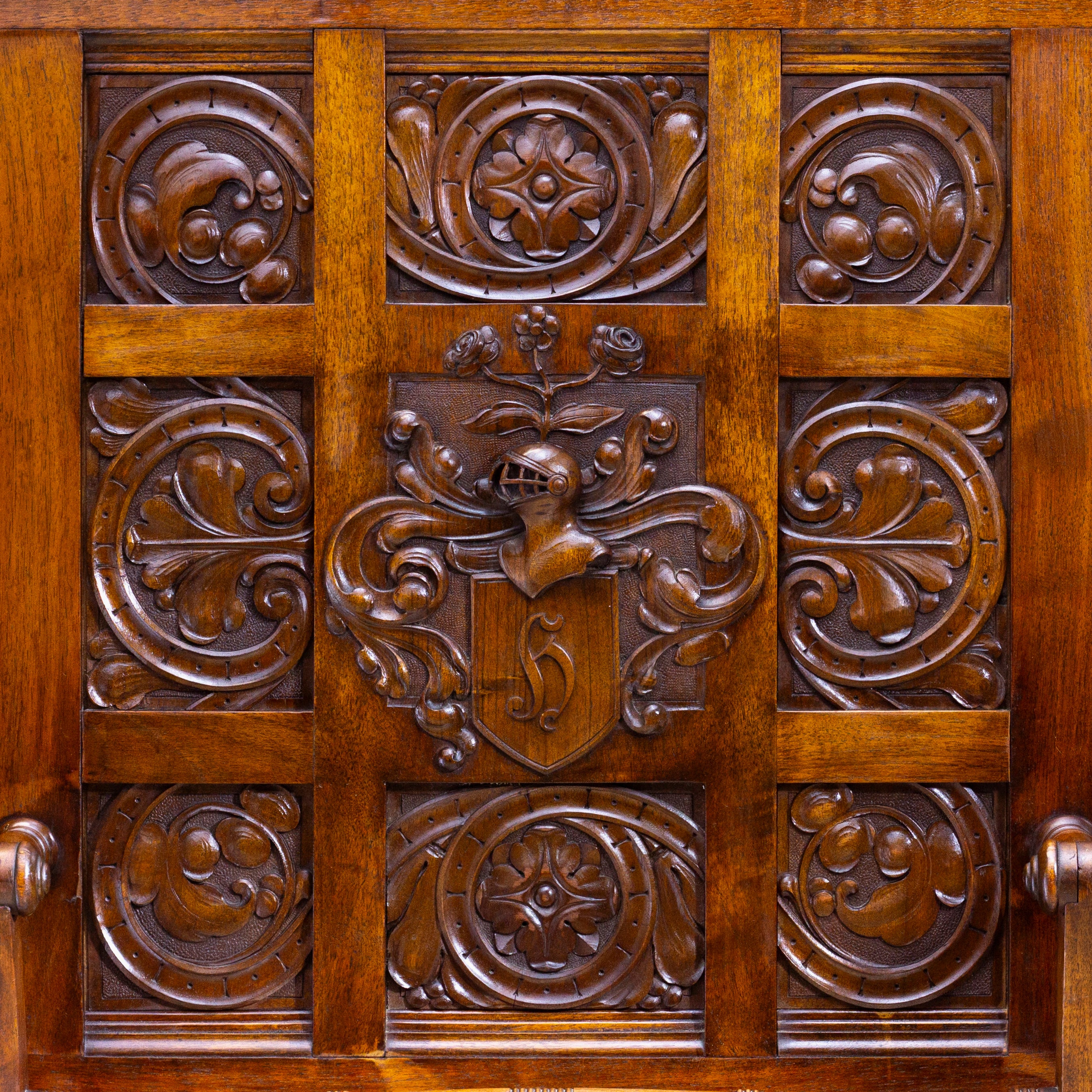 Un pupitre ou étui à cartes en noyer finement sculpté, avec charnières et ferrures en laiton. Le noyer présente une patine riche et chaleureuse, et le panneau avant, richement sculpté, arbore une bordure de trèfles et neuf panneaux centraux. Le panneau central représente un casque de chevalier surmontant un « h » monogrammé, entouré de fleurs et de volutes. Ce pupitre est destiné à une bibliothèque ou un bureau ; son rabat est doublé de feutre vert. L’ensemble repose sur roulettes.