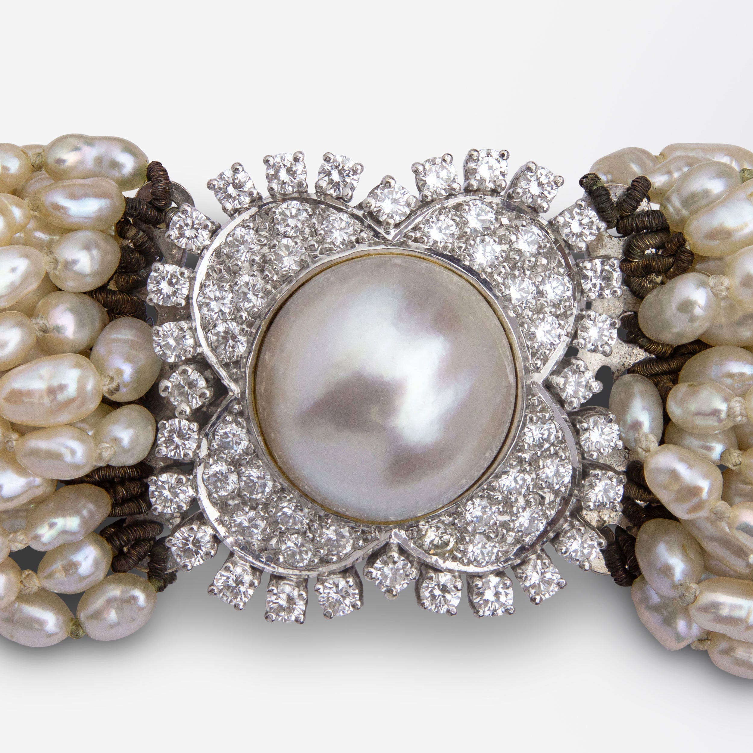 Torsade de perles mi-siècle avec fermoir en perle Mabe et diamants