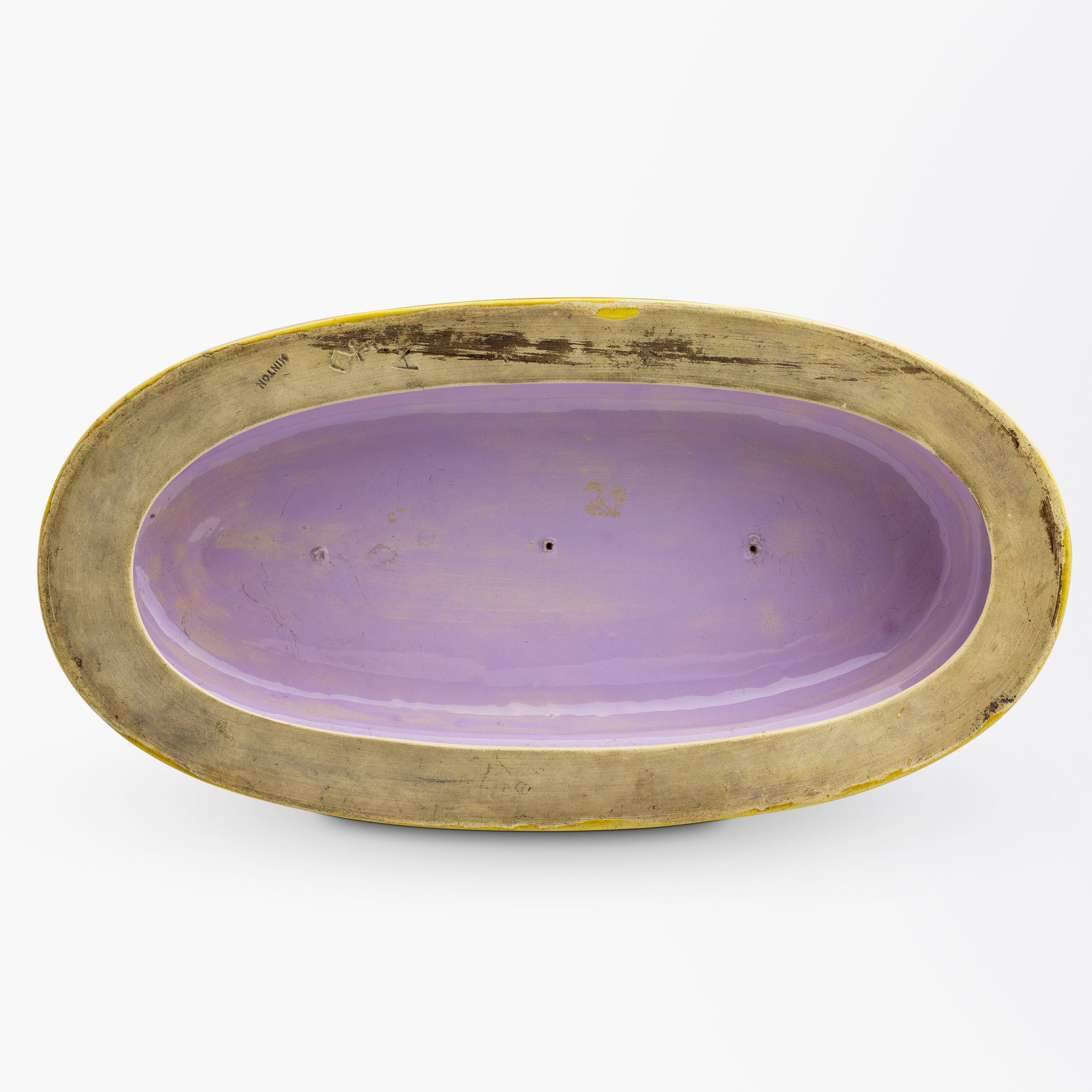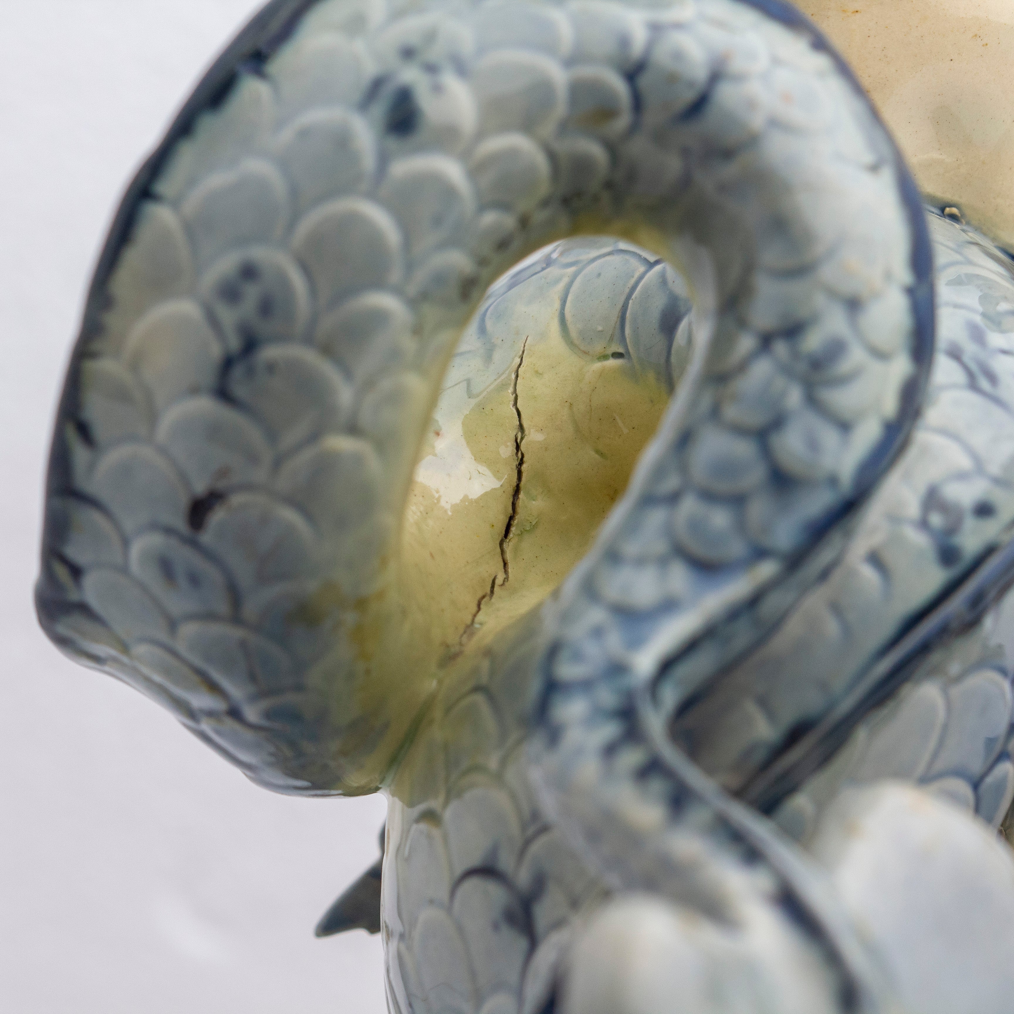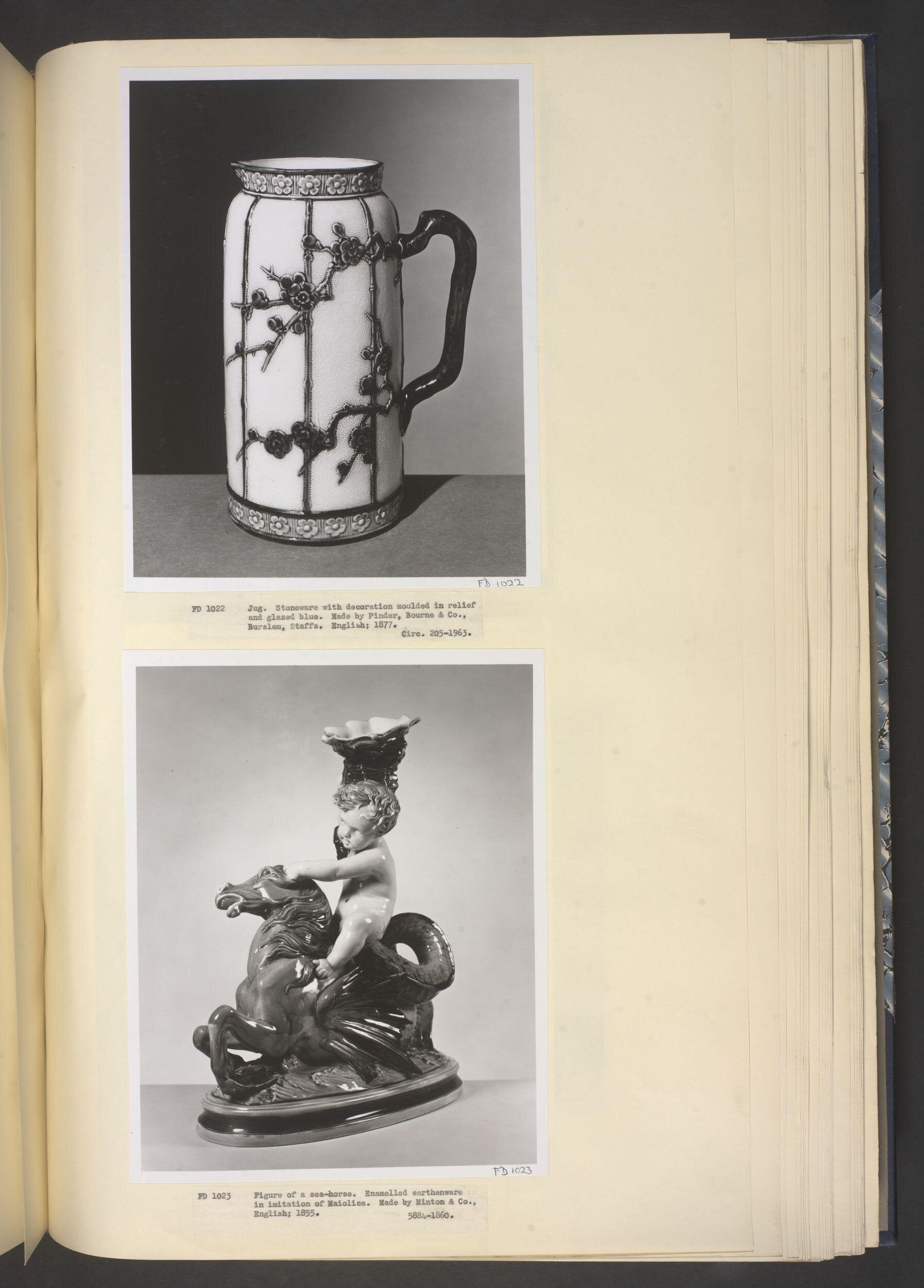Un groupe de figurines en faïence à glaçure plombifère représentant un hippocampe surmonté d'un cupidon portant un coquillage sur l'épaule. Ce grand centre de table en majolique, connu dans le Les archives de l'usine indiquent que la pièce intitulée « Hippocampe avec coquillage » a été modelée par le sculpteur français Albert-Ernest Carrier-Belleuse pour Minton, Stoke-on-Trent, dans les années 1850.