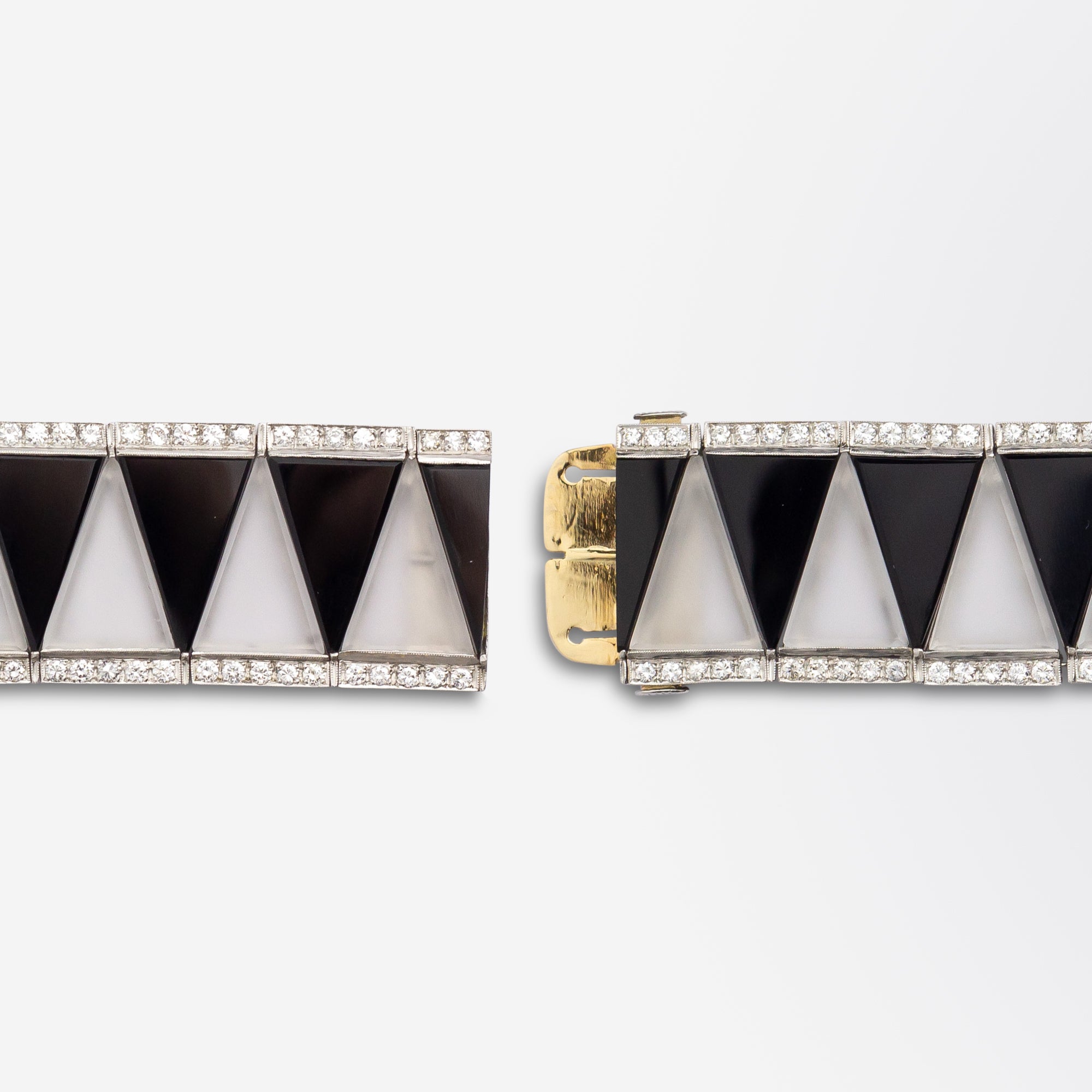 Ce bracelet exceptionnel en platine, or, diamants, cristal de roche et onyx, de style Art déco, est une véritable œuvre d'art. La monture en platine et or jaune est sertie d'une ligne en zigzag de tablettes triangulaires en cristal de roche, entrecoupées de tablettes triangulaires en onyx noir. Le pourtour du bracelet est orné d'un serti grain de diamants taille brillant, de couleur G et de pureté VS-SI, pour un total de 5,25 carats. Le fermoir invisible à cliquet en or jaune s'intègre parfaitement au design, conférant au bracelet une allure harmonieuse et continue. Bien que de style Art déco et non d'origine des années 1920, ce bracelet est sans conteste une pièce remarquable, réalisée avec des matériaux de grande qualité et un savoir-faire exceptionnel.