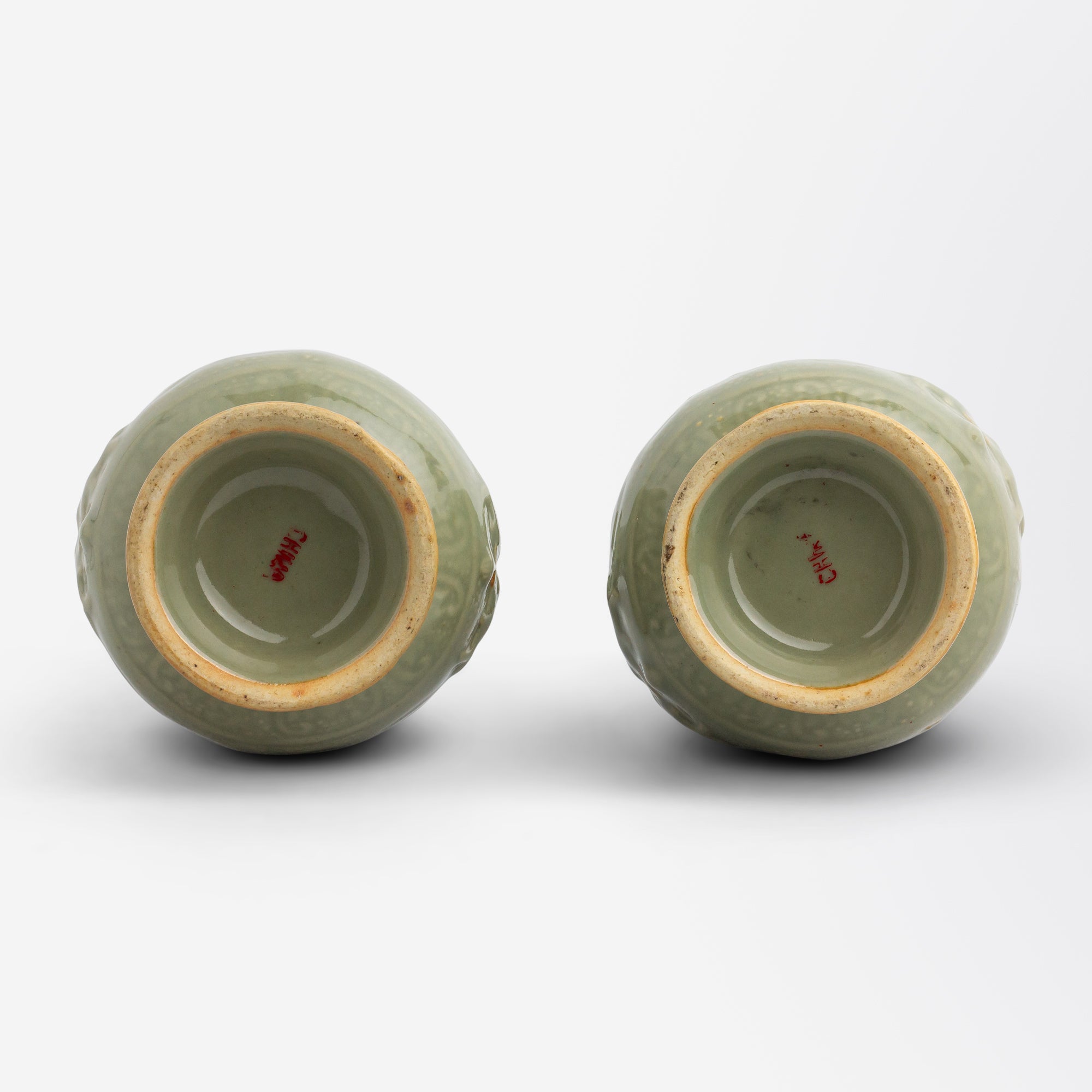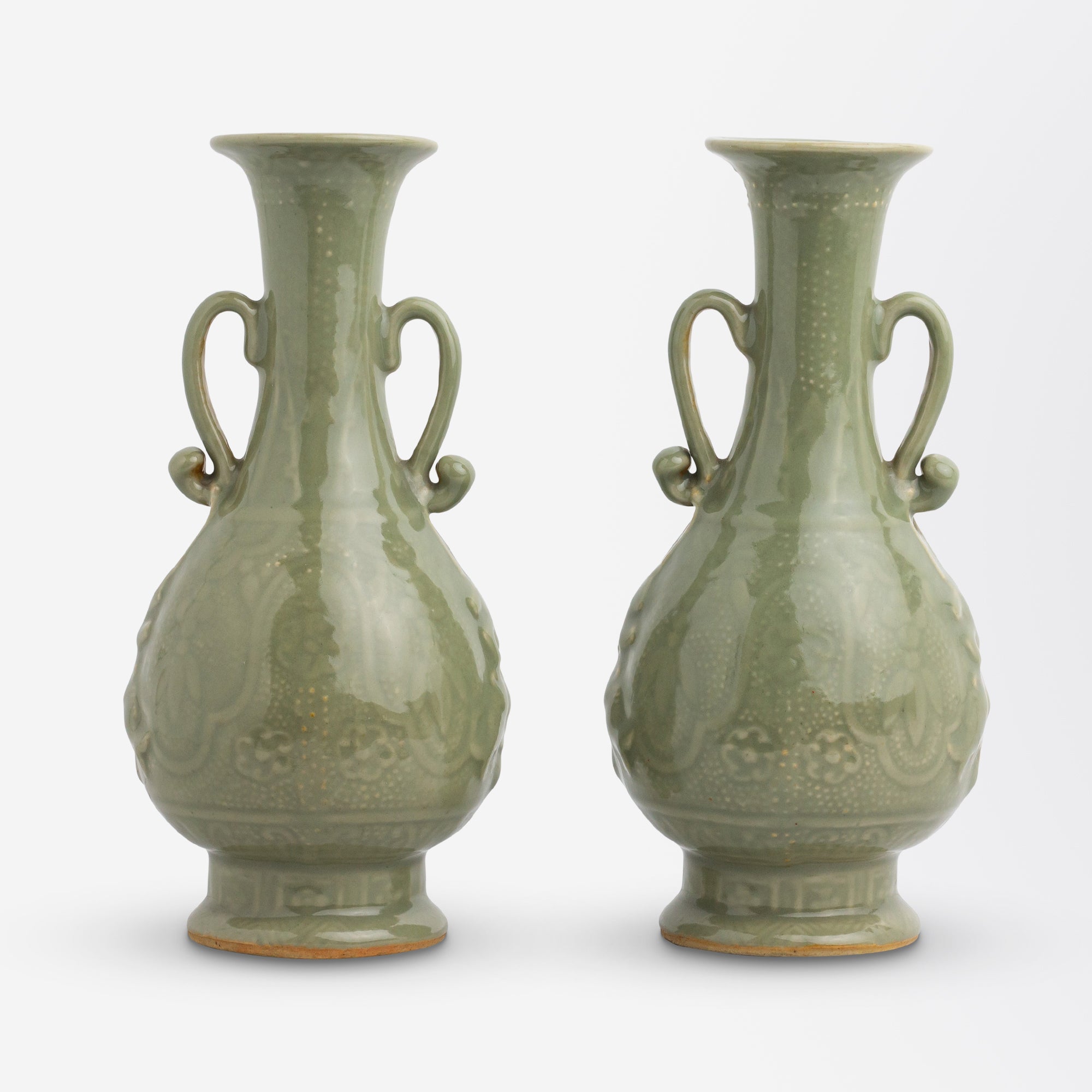 Paire de vases en céladon d'exportation, de forme Yuhuchunping ou poire, avec anses, vers les années 1920.