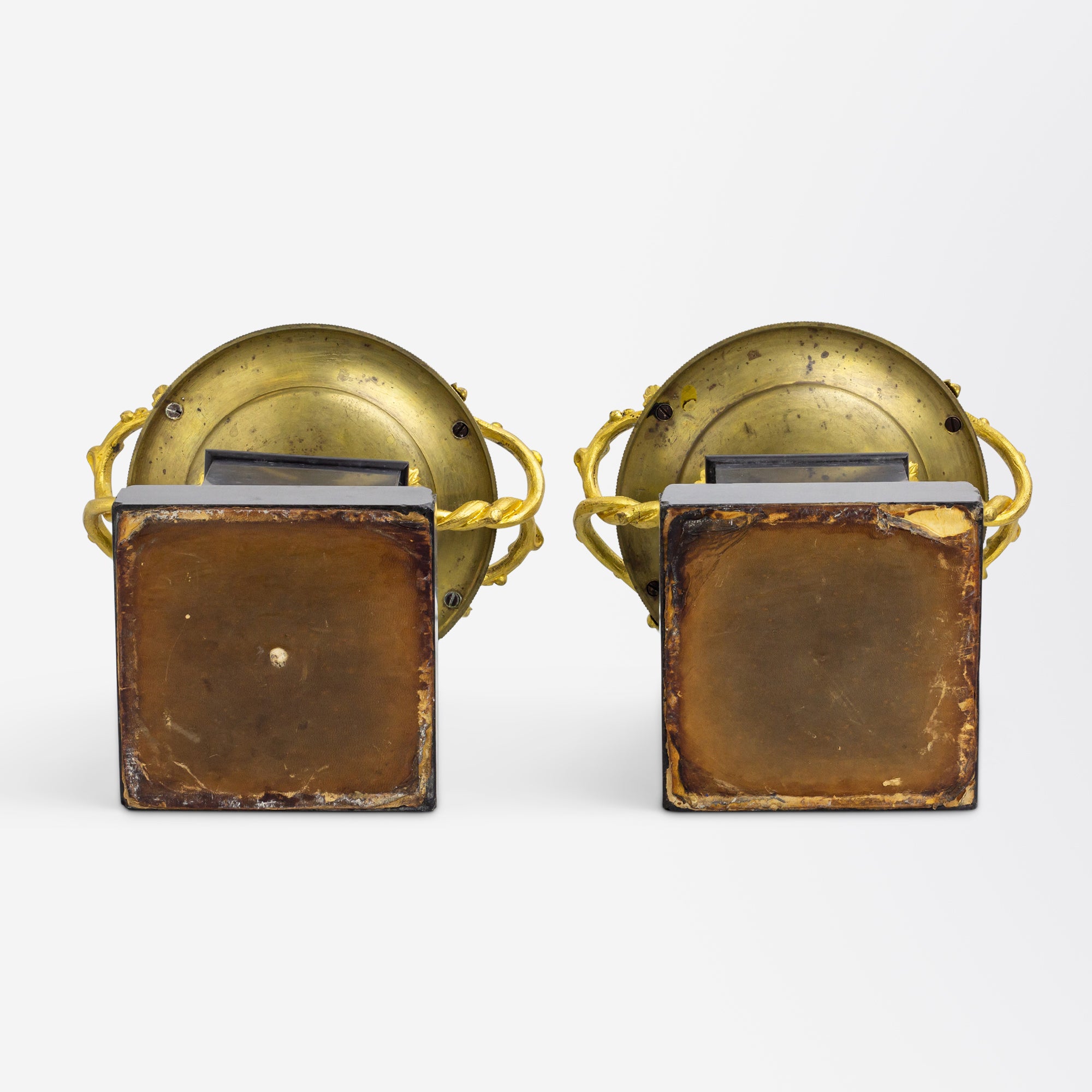 Cette paire de coupes françaises du XIXe siècle est réalisée en bronze, ardoise et bronze doré. Les colonnes prismatiques rectangulaires, taillées dans l'ardoise, supportent des coupes en bronze de forme néoclassique, fixées sur les colonnes. De chaque côté des coupes se trouvent des anses en bronze doré, évoquant des branches et des feuilles d'acanthe. Le socle des colonnes est orné d'une plinthe en bronze doré à motif classique qui s'harmonise parfaitement avec l'ensemble. Ces coupes ne portent aucune marque de fabricant ou de fonderie, mais il est probable qu'elles aient été fabriquées en France durant la première moitié du XIXe siècle. Elles trouveront une belle place sur une cheminée ou seront ravissantes garnies de chocolats et de bonbons emballés sur une table de Noël.