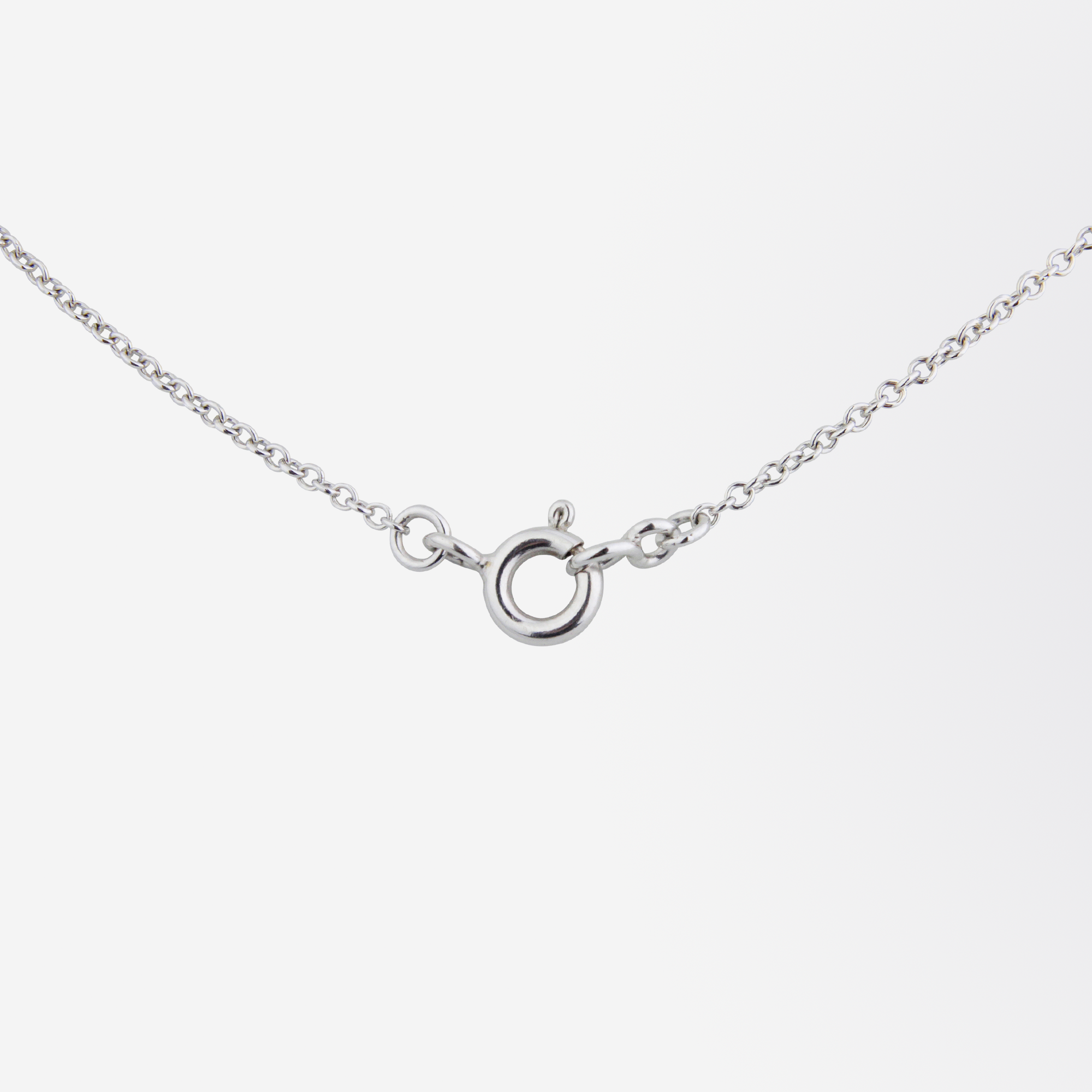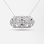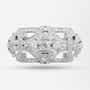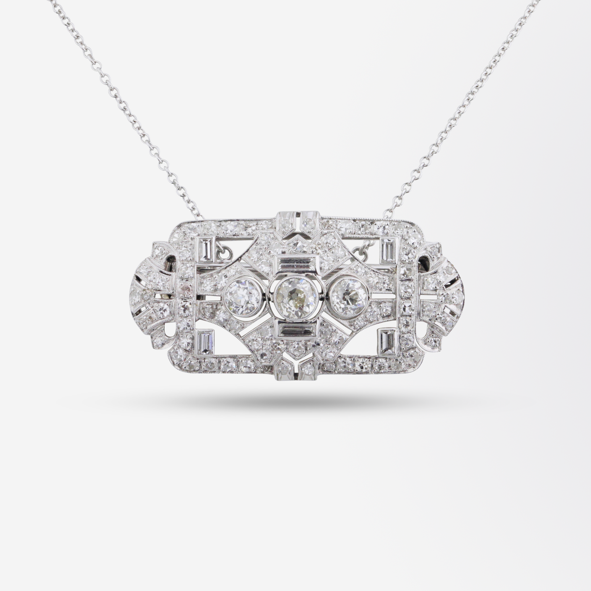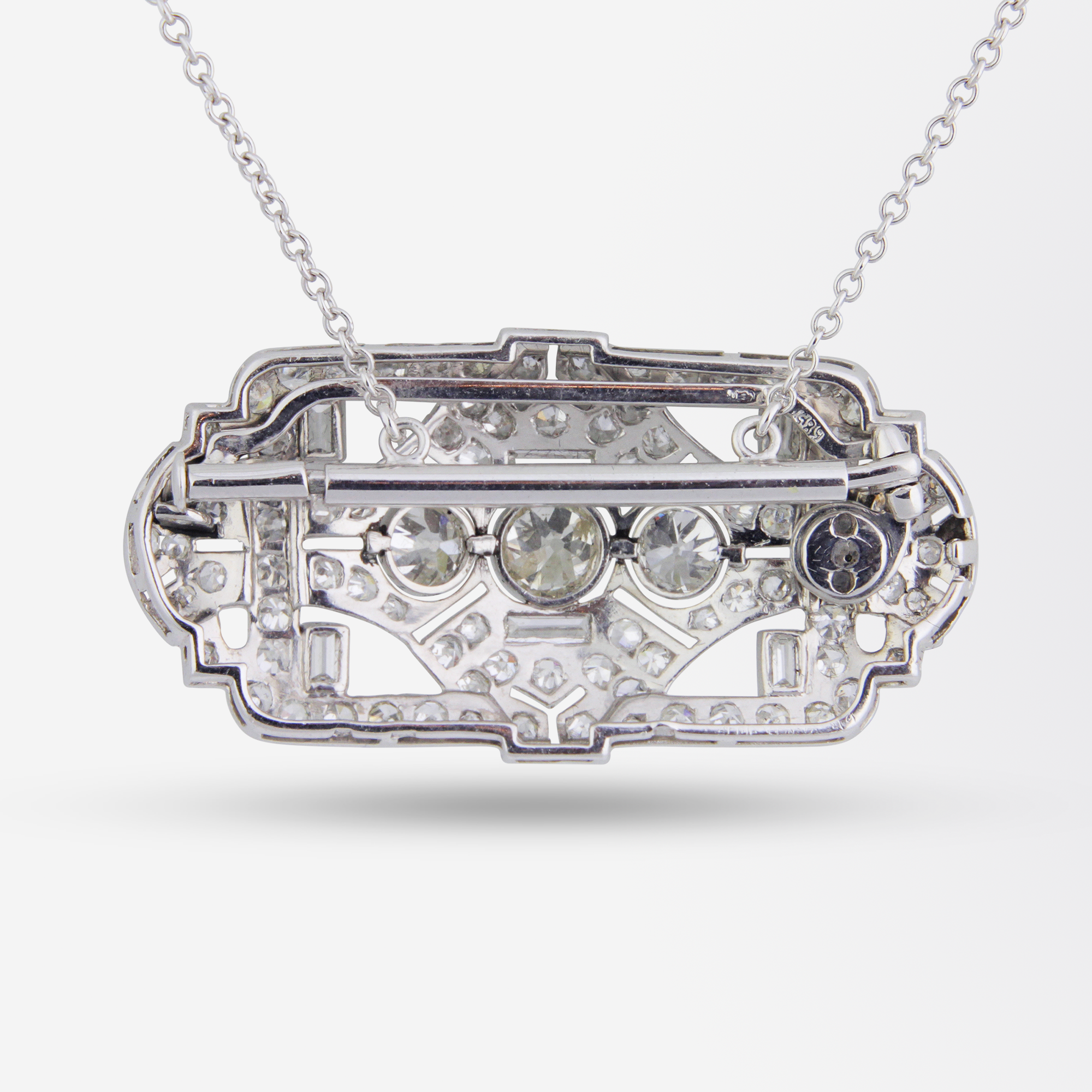 Une broche Art déco en platine d'une grande finesse, ornée de diamants, montée sur une chaînette amovible en or blanc 18 carats. Cette pièce exceptionnelle date de l'apogée de l'Art déco (vers 1930) et présente des diamants taille brillant ancienne sertis clos, ainsi que des diamants taille baguette. Conçue à l'origine comme une broche, elle a été récemment enrichie d'une chaînette en or blanc permettant de la porter en collier. La chaînette restant amovible, elle peut également être portée comme une broche.