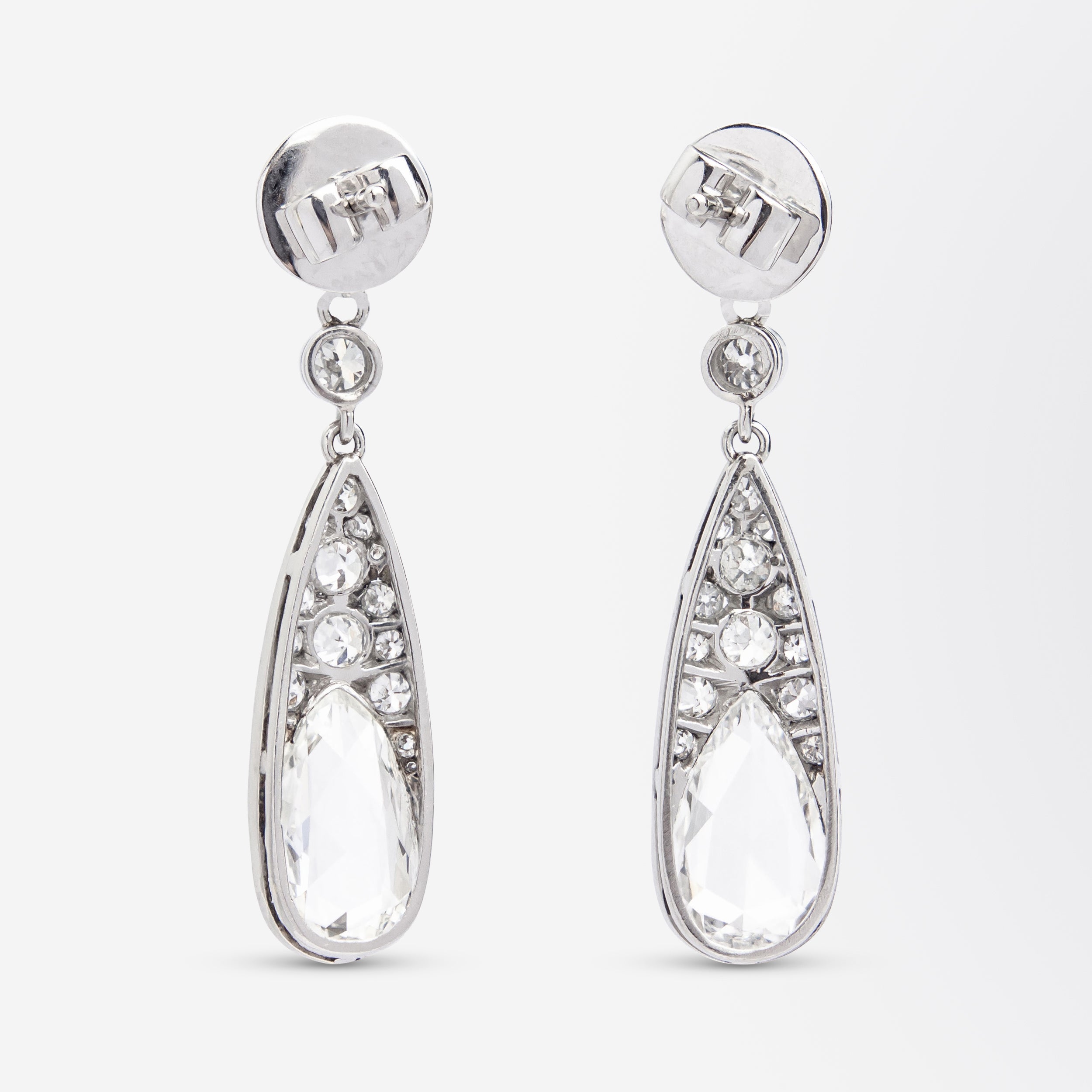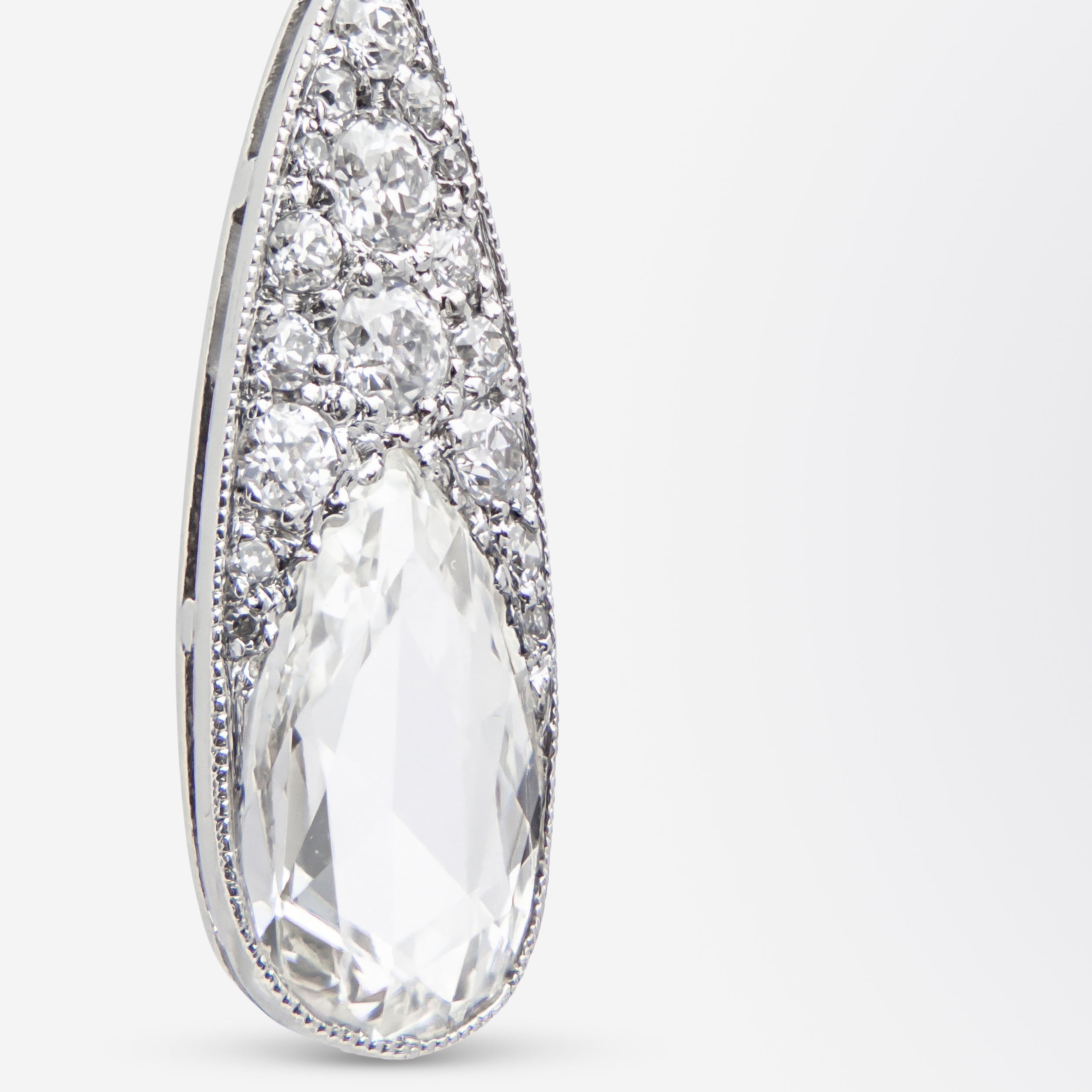 Fabriquées à la main en platine et serties de diamants, ces boucles d'oreilles s'inspirent du style Belle Époque tout en étant de fabrication relativement moderne. Les boucles d'oreilles pendantes sont ornées d'un mélange de diamants de différentes tailles, notamment la taille ancienne européenne et la taille poire rose, ce qui renforce l'idée qu'elles ont été conçues dans le style Belle Époque. Les plus gros diamants sont deux pierres de taille poire rose pesant respectivement 0,95 et 0,91 carat, de couleur H et de pureté comprise entre VS2 et SI1. Les autres pierres sont de couleur G et H et de pureté comprise entre VS2 et SI1. Le poids total des diamants est estimé à 3,24 carats. Ces boucles d'oreilles se fixent à l'oreille grâce à une tige et un fermoir papillon, ce qui signifie que la personne qui les portera a les oreilles percées. On pourrait les imaginer portées par une mariée le jour de son mariage, ou comme un magnifique cadeau d'anniversaire de mariage pour une amatrice de beaux bijoux.
