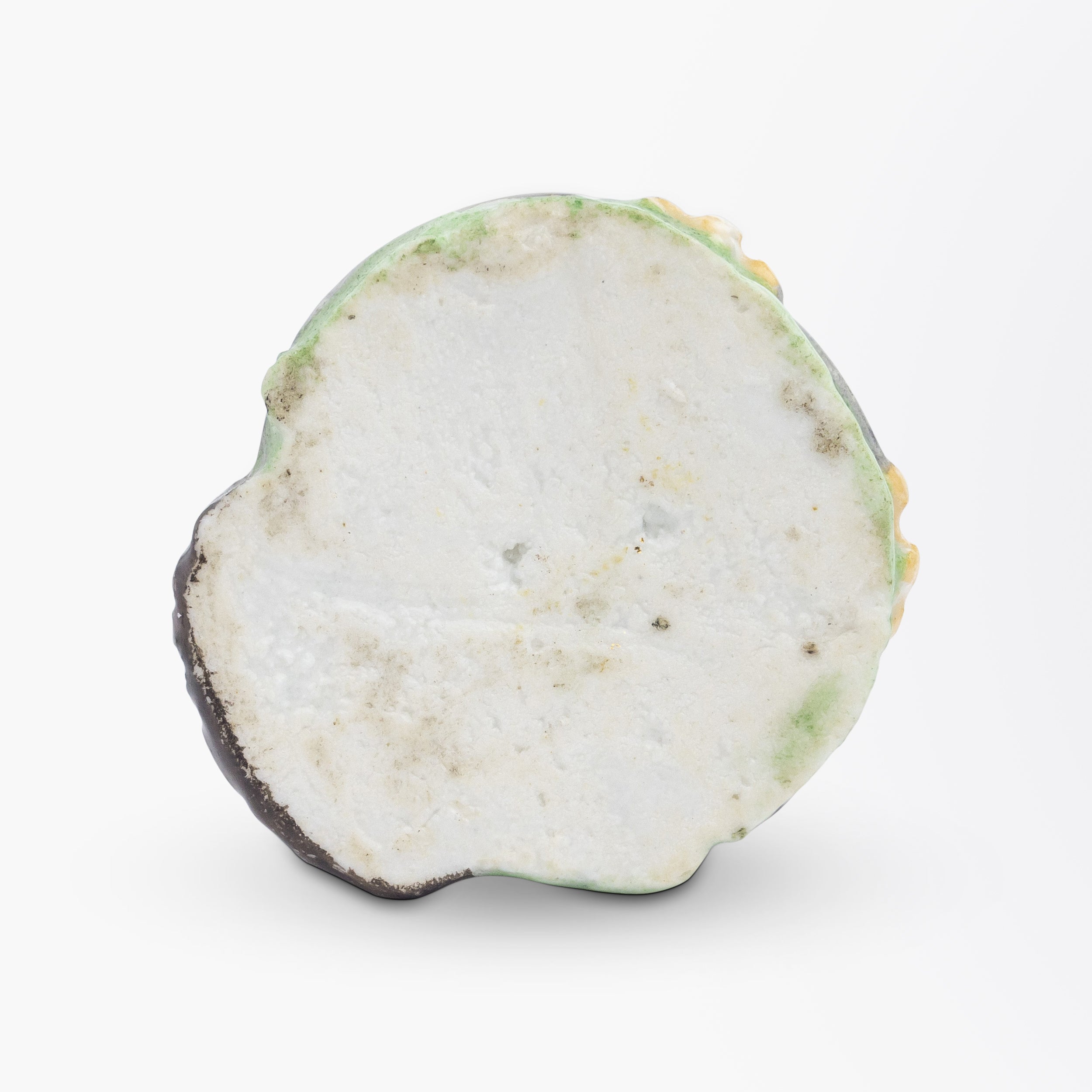 Petit flacon à parfum en céramique d'exportation chinoise, orné d'un hibou serrant un serpent et décoré d'émaux peints à la main en jaune, orange, gris et vert. La dorure sur le bord est légèrement usée.