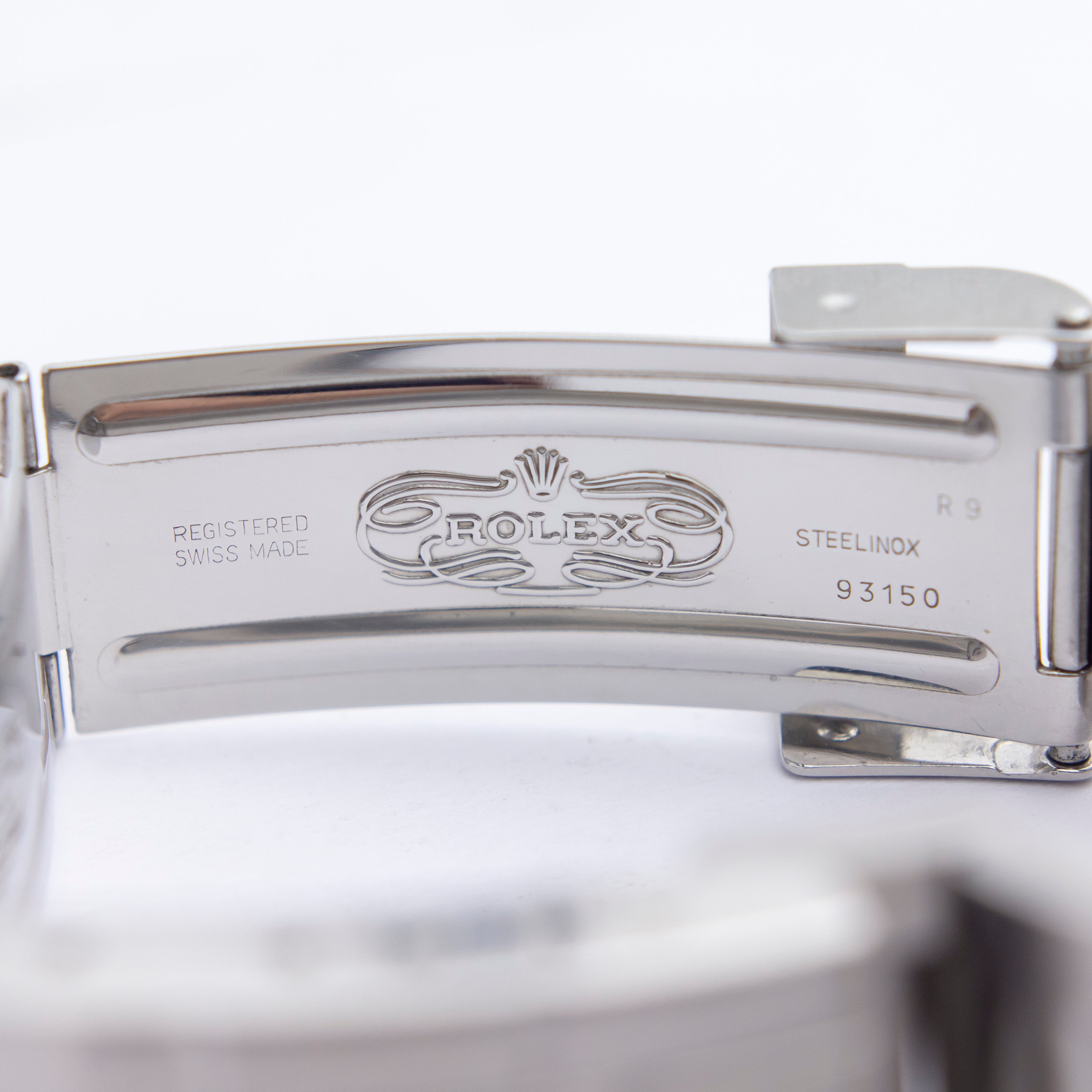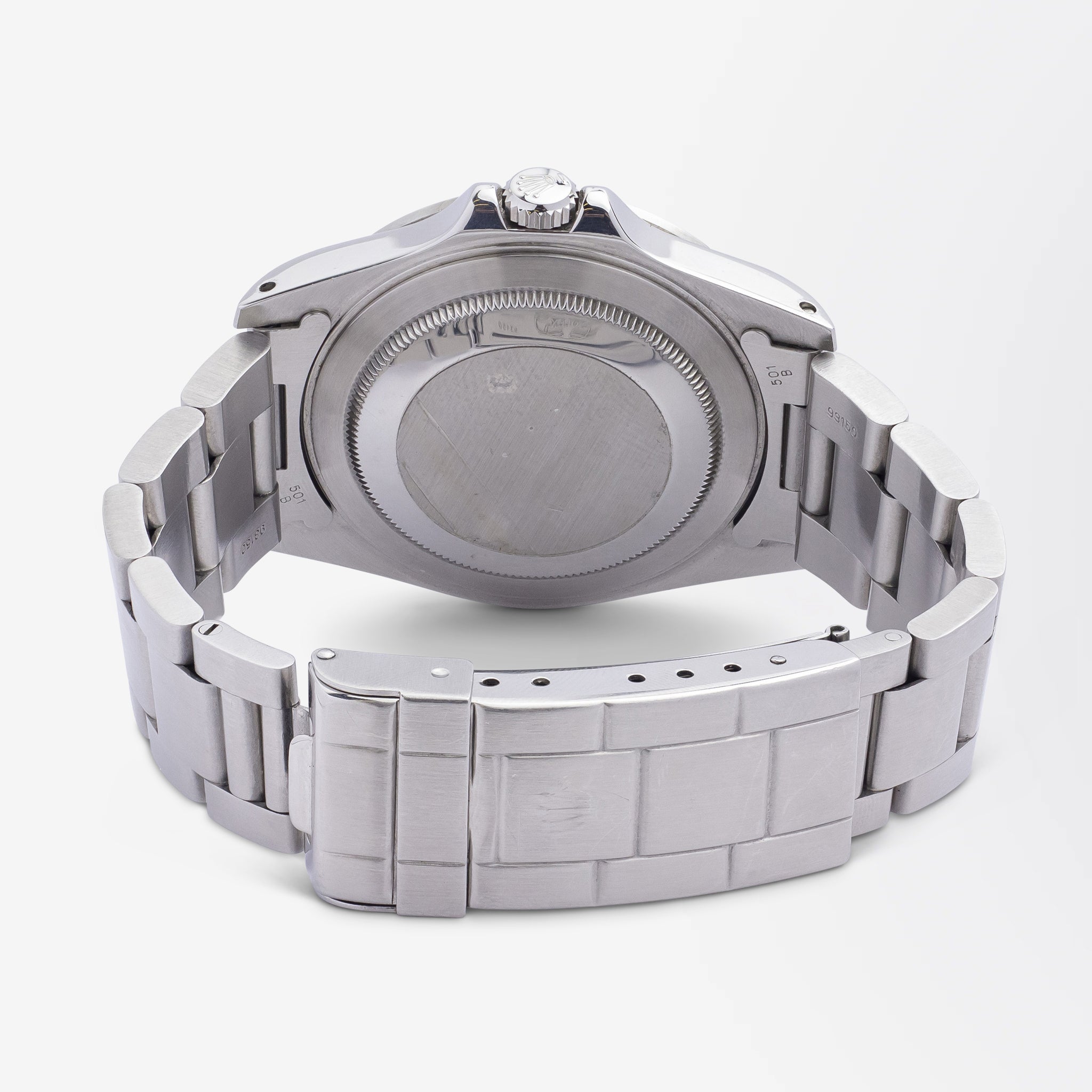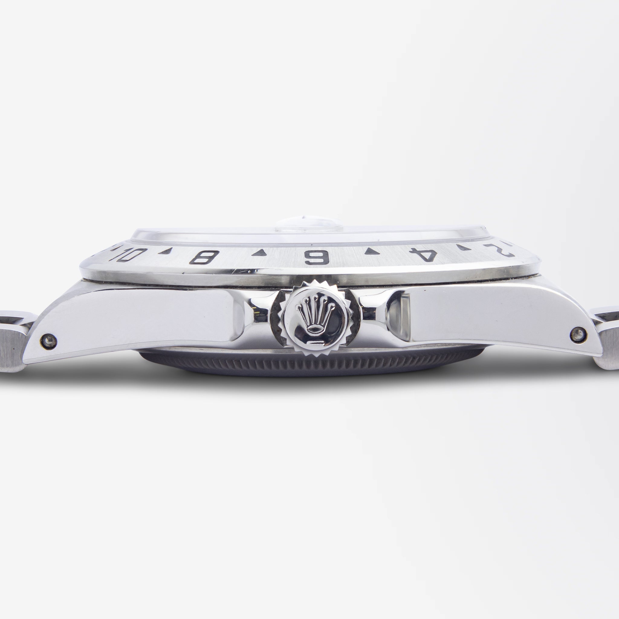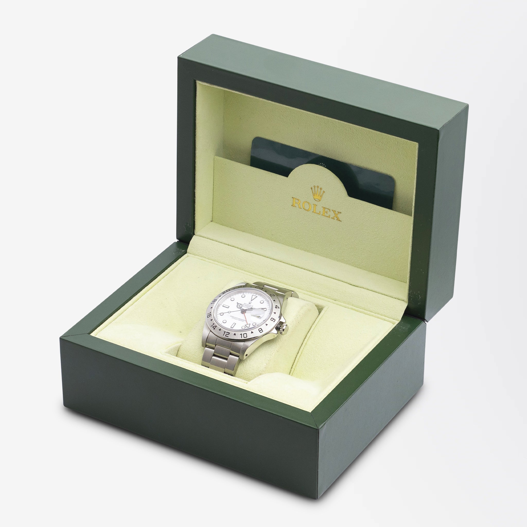 Cette Rolex des années 1990 est une Oyster Perpetual Polar Explorer II GMT. Fabriquée en acier inoxydable, elle conserve son bracelet d'origine également en acier inoxydable. Conçue par Rolex en 1991, elle est équipée d'un mouvement automatique calibre 3185 à 31 rubis, avec date et fonction GMT. Elle dispose d'une réserve de marche de 48 heures et d'index luminescents au tritium. Proposée avec son écrin d'origine, elle est accompagnée d'une carte de garantie Rolex attestant d'une révision effectuée en juillet 2022, lui conférant une garantie de 24 mois à compter de cette date. Le boîtier et le bracelet présentent de légères traces de polissage, probablement réalisées lors de la révision de 2022. La Polar Explorer a été lancée par Rolex dans les années 1970, puis déclinée dans les années 1980 en versions à cadran blanc, comme celle-ci. Ce modèle en particulier est en superbe état et, avec sa boîte et sa carte de garantie, il constitue un excellent ajout à une collection de montres ou peut-être une première pièce pour un passionné de Rolex.