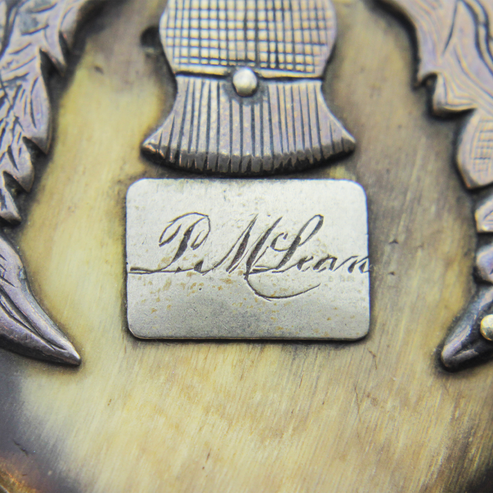 Une tabatière écossaise en corne de bélier, ornée de montures en argent et d'une plaque gravée « P. McLean ». Fabriquée en Écosse, elle date du début du XIXe siècle. L'intérieur présente une ancienne étiquette d'inventaire provenant d'une collection privée.