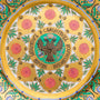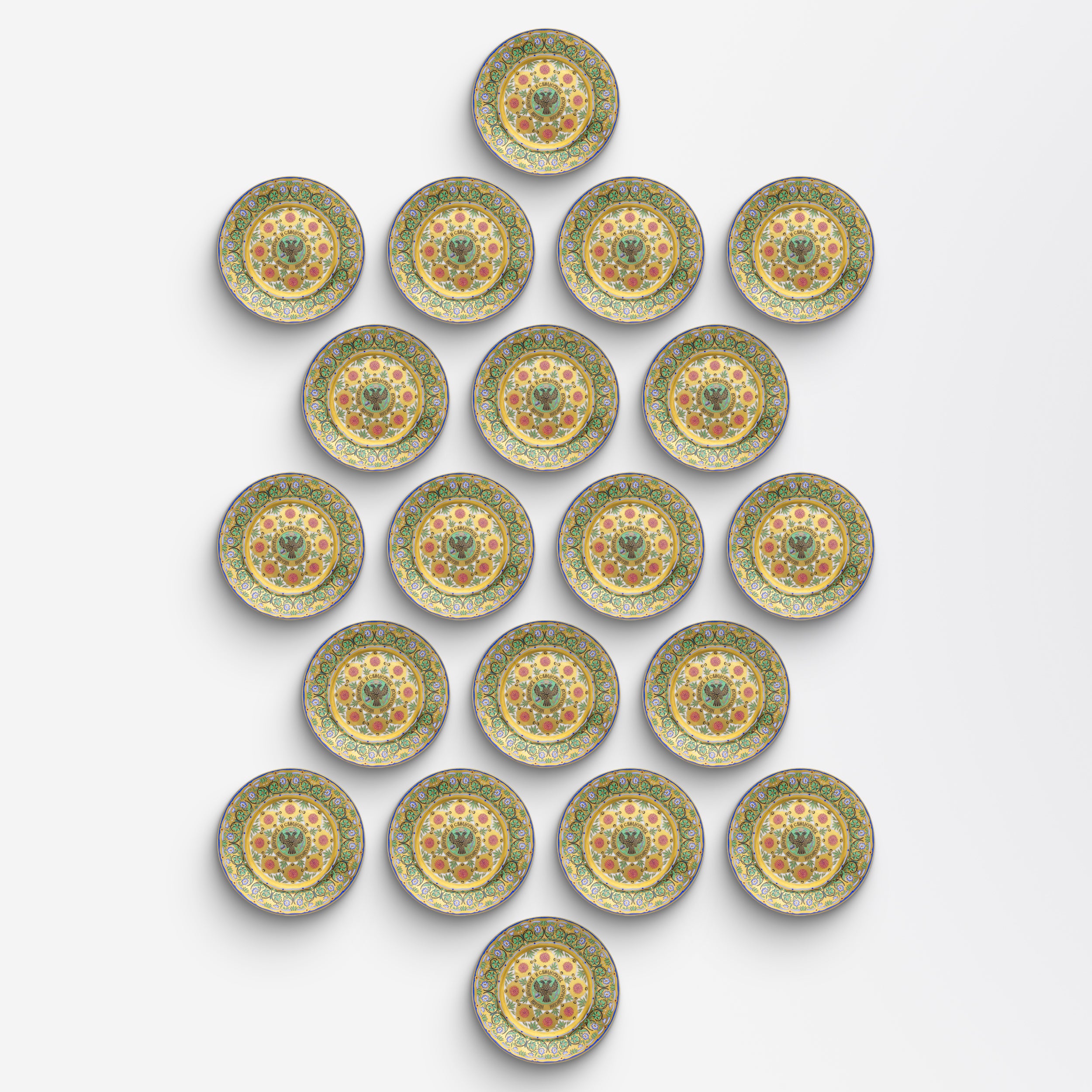 Ce remarquable service à dessert polychrome comprend 22 assiettes et quatre coupes, reproductions anciennes du Service du Kremlin. D'une incroyable finesse, cet ensemble imite le Service du Kremlin original, réalisé par la Manufacture Impériale de Porcelaine pour le tsar Nicolas Ier (1796-1855) et destiné au Grand Palais du Kremlin à Moscou. Le service original fut conçu par Fedor Grigorievitch Solntsev (1801-1892) et exécuté entre 1837 et 1838. Des pièces du Service du Kremlin sont conservées dans des musées et galeries du monde entier, notamment au British Museum et au musée de l'Ermitage. Au centre de chaque pièce figure l'aigle bicéphale, symbole de la Russie impériale, entouré d'une bande de texte dont la traduction du cyrillique est « NICHOLAS EMPEREUR ET AUTOCRAT DE TOUTE LA RUSSIE ». Le style dans lequel Solnstev a décoré le service pourrait sans doute être qualifié de russo-byzantin, il s'inspirant également de la vaisselle utilisée par les tsars du XVIIe siècle.