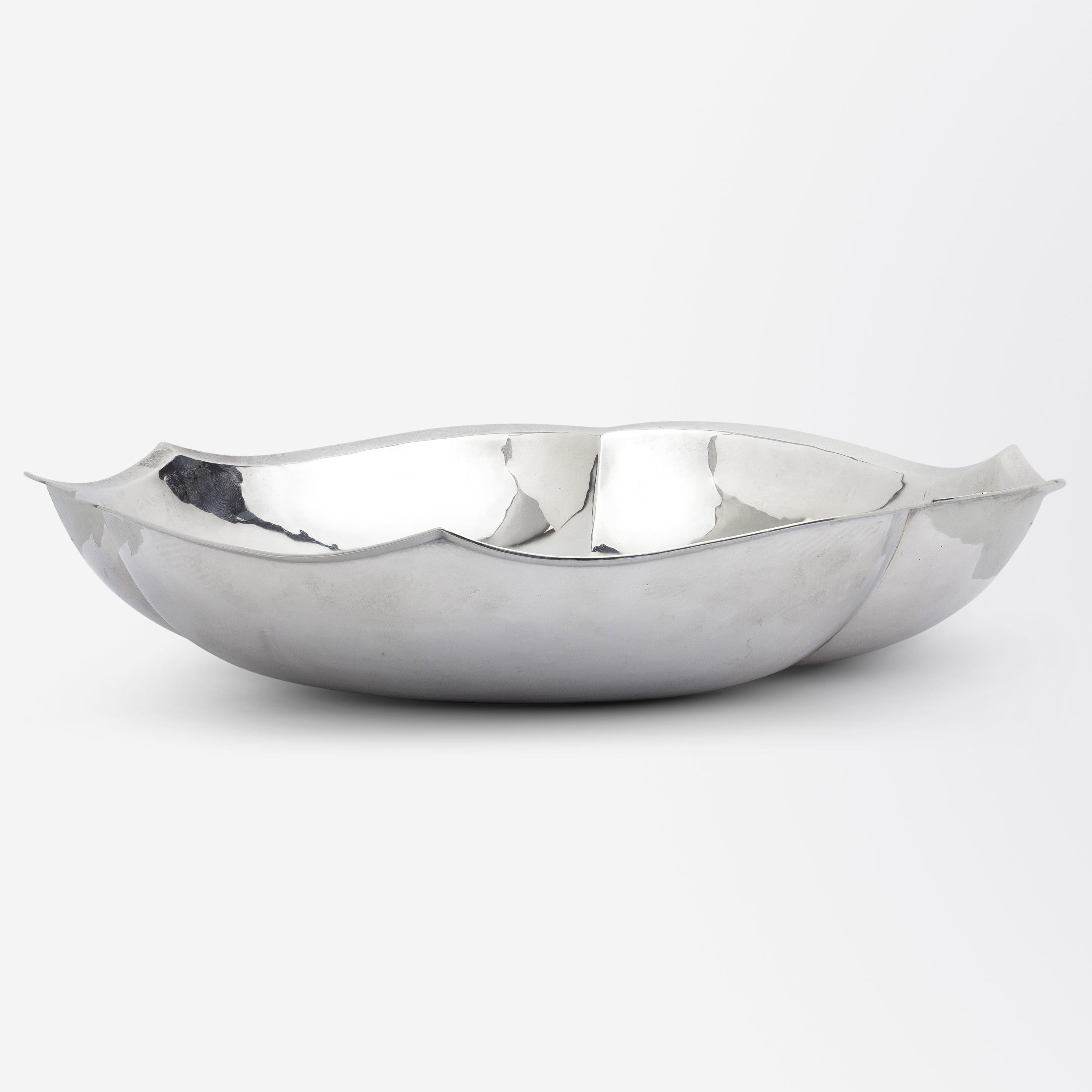 Ce ravissant centre de table en argent massif a probablement été fabriqué par la maison Cellini Crafts de Chicago à la fin des années 1930. Cette pièce artisanale présente trois lobes pointus et était vraisemblablement destinée à servir de plat de service ou de centre de table. Cellini Crafts, basée à Chicago, produisait avant la Seconde Guerre mondiale une large gamme d'objets en argent massif dans un style similaire à celui de Kalo Shop, également basée à Chicago. Initialement connue sous le nom de The Cellini Shop, l'entreprise a adopté le nom de Cellini Crafts en 1934. Pendant la Seconde Guerre mondiale et peu après, elle s'est concentrée sur la fabrication d'objets en alliage d'aluminium appelé « argental », ce qui nous permet de dater cette pièce entre 1934 et 1940 environ. Un très bel exemple d'artisanat américain en argent massif, qui semble tout droit sorti de l'imagination d'un créateur du mouvement Arts and Crafts.