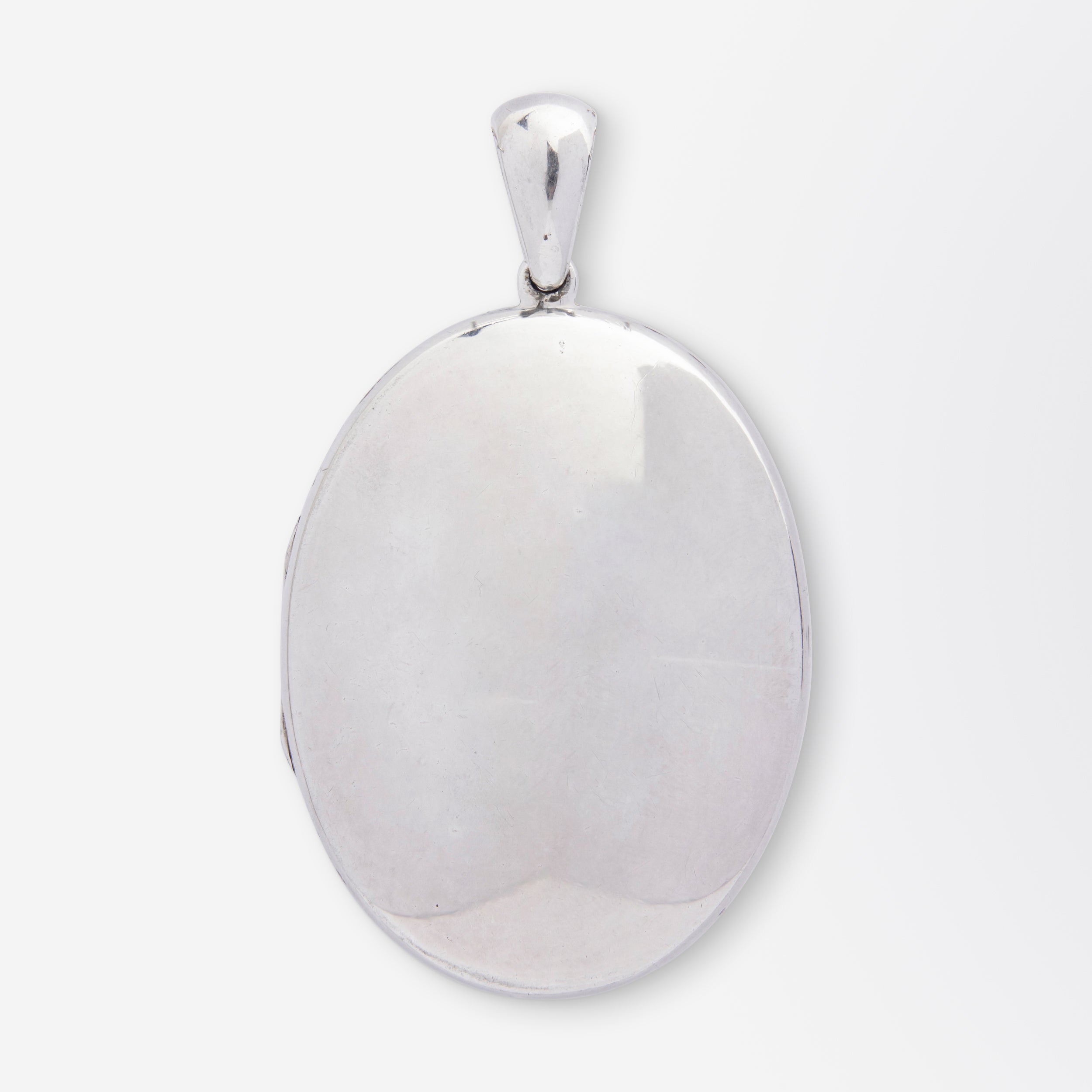Un magnifique médaillon victorien en argent massif, de grande taille, orné d'un monogramme élaboré « Amity, Eternity, Infinity » au centre. Ce médaillon ovale, poli miroir, est suspendu à une bélière large et effilée, permettant d'y glisser aisément une grosse chaîne ou un fermoir à anneau. Le monogramme « AEI », appliqué sur le dessus du médaillon, est d'origine. Fréquent dans les bijoux victoriens, ce monogramme signifie « Amity, Eternity & Infinity ». Le médaillon, qui se ferme solidement, possède deux fenêtres en verre à l'intérieur, permettant d'y glisser une photographie ou une mèche de cheveux. Datant d'environ 1890, ce bijou, dépourvu de poinçons, est probablement d'origine américaine et non anglaise. Un superbe exemple de bijou en argent de l'époque victorienne, toujours aussi élégant et portable aujourd'hui.
