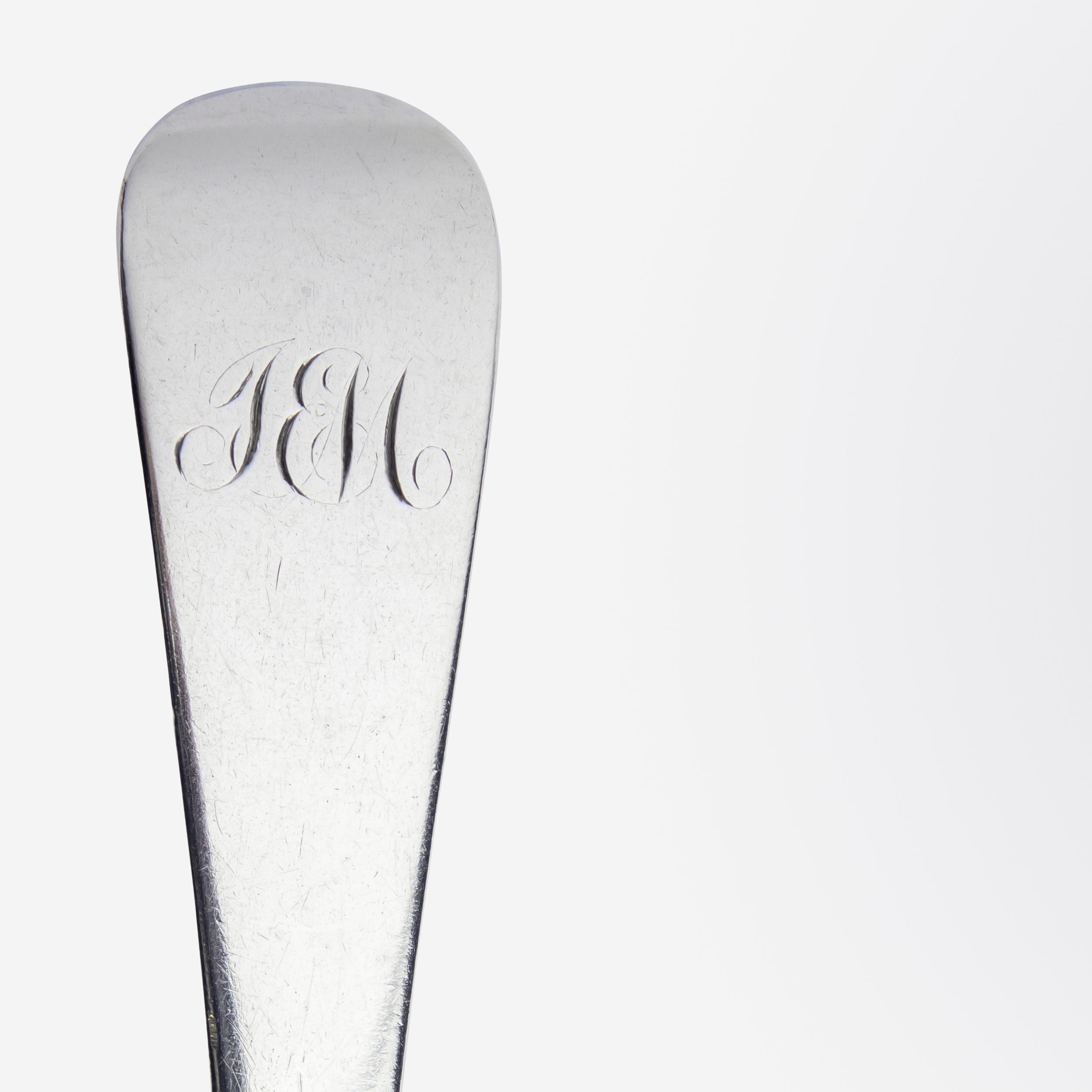 Cette louche à sauce en argent massif a été fabriquée par Peter, Ann et William Bateman, membres de la célèbre famille d'orfèvres Bateman. Elle porte un poinçon indiquant sa fabrication à Londres en 1804. Le manche est orné d'un monogramme d'époque, « JEM », probablement les initiales du premier propriétaire. La louche est en bon état, malgré une légère déformation au centre du manche. Il est à noter que la marque du maître orfèvre n'est pas visible sur l'image des poinçons, mais qu'elle l'est plus nettement en réalité. Un ajout charmant à une collection d'argenterie Bateman ou pour un collectionneur de couverts géorgiens.