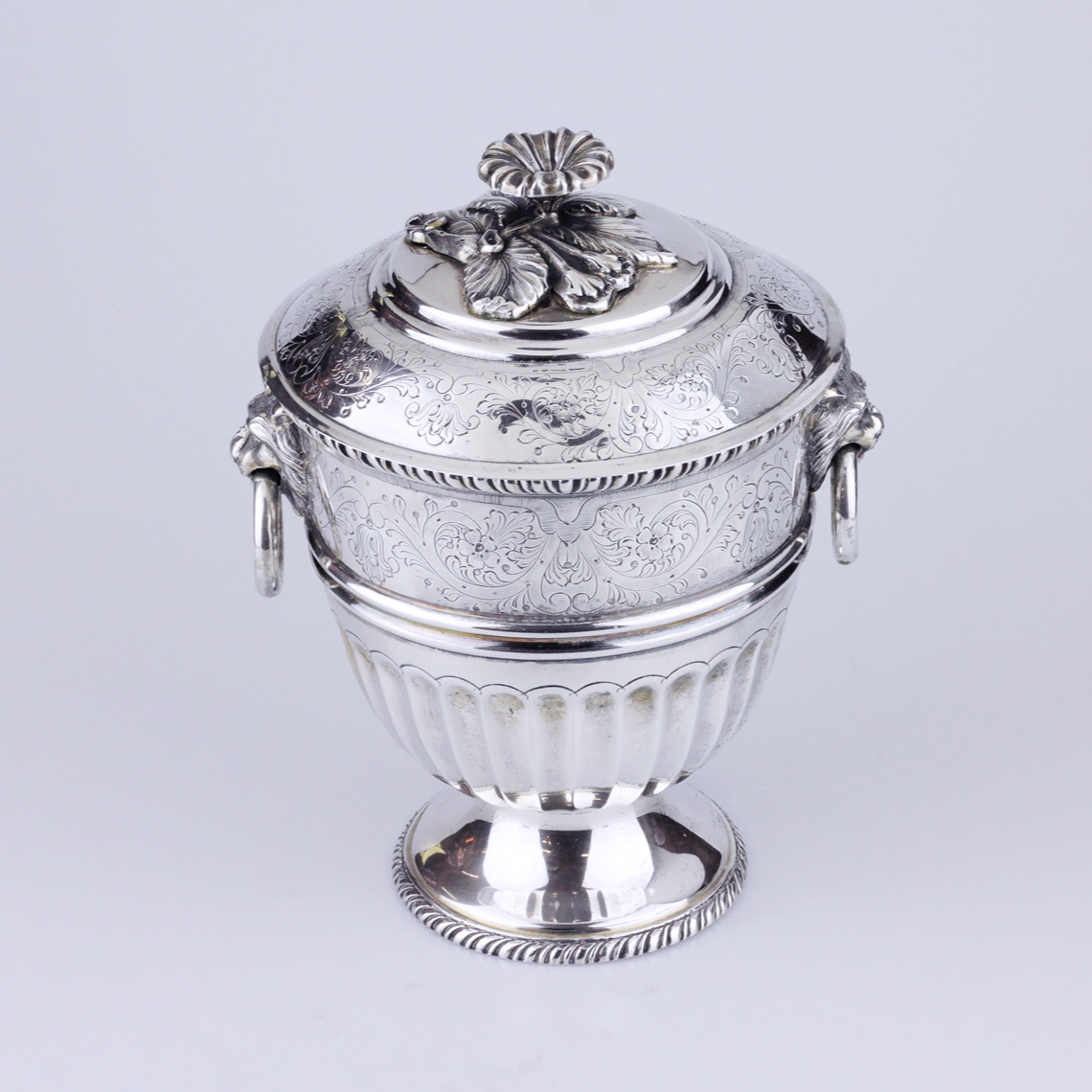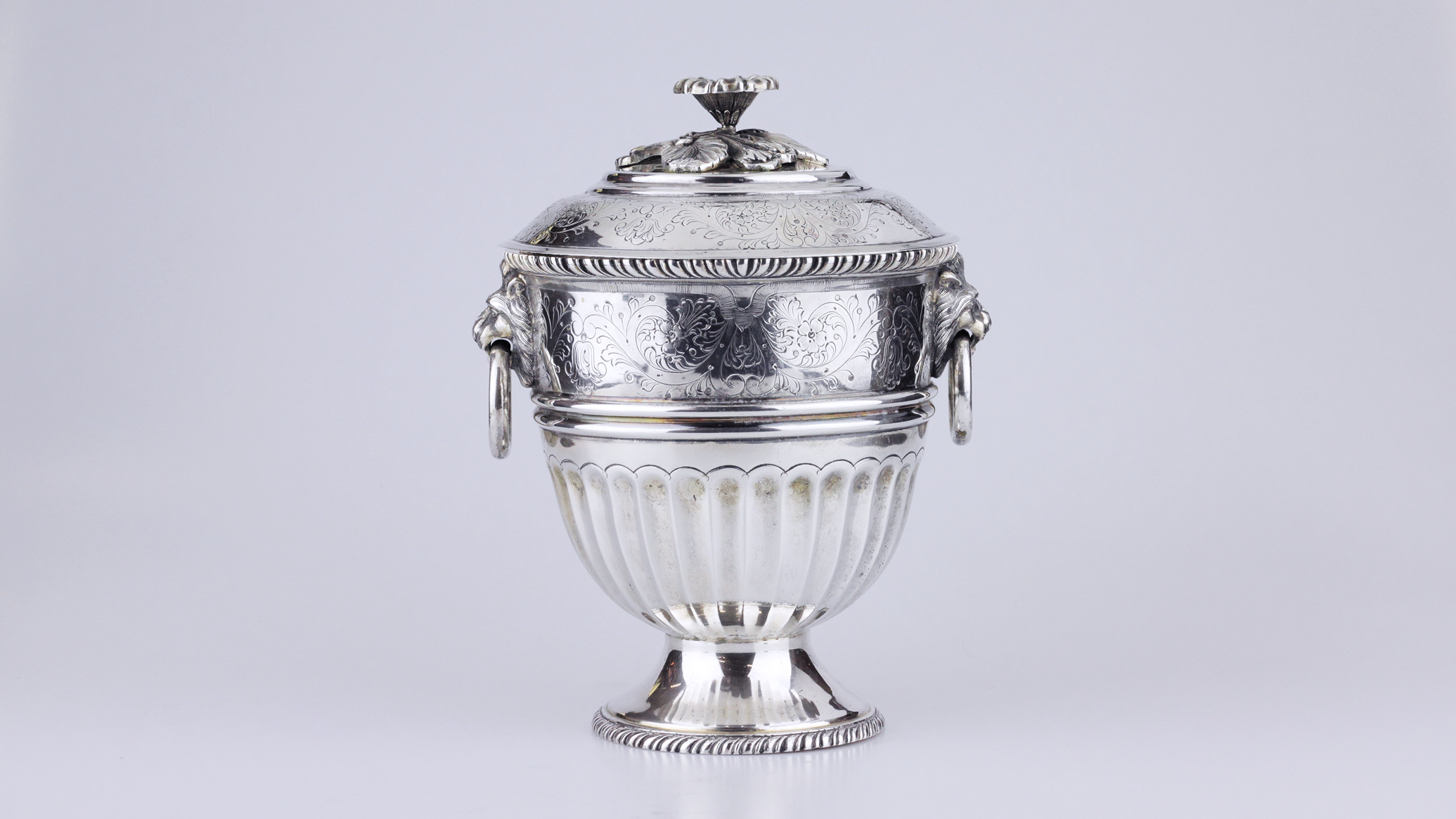 Une belle urne à couvercle argenté ou, plus concrètement, un seau à glace pour les cocktails du soir.