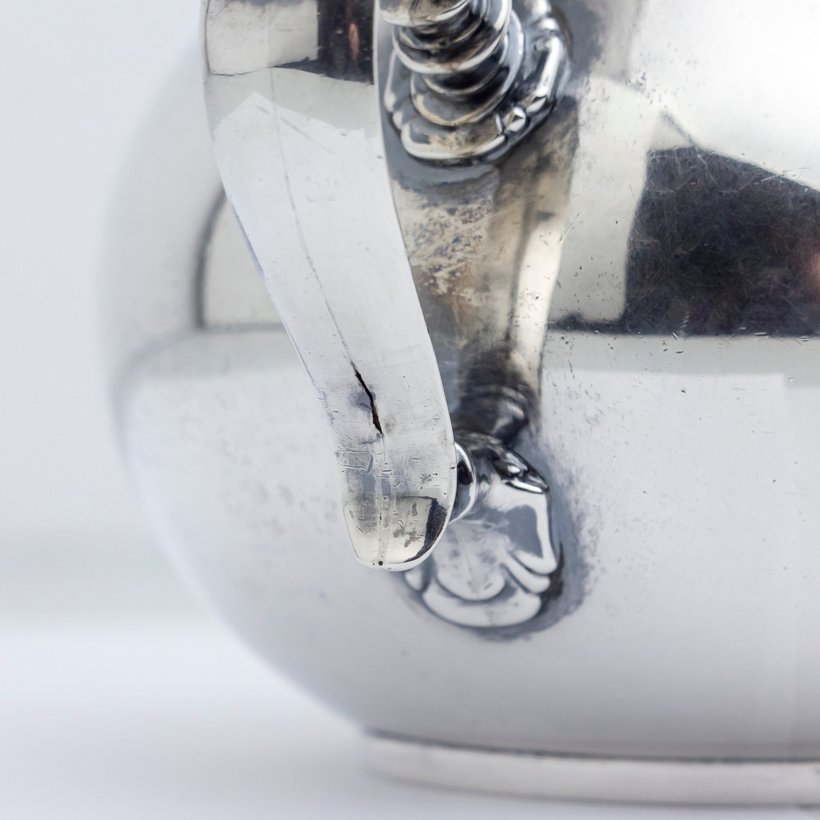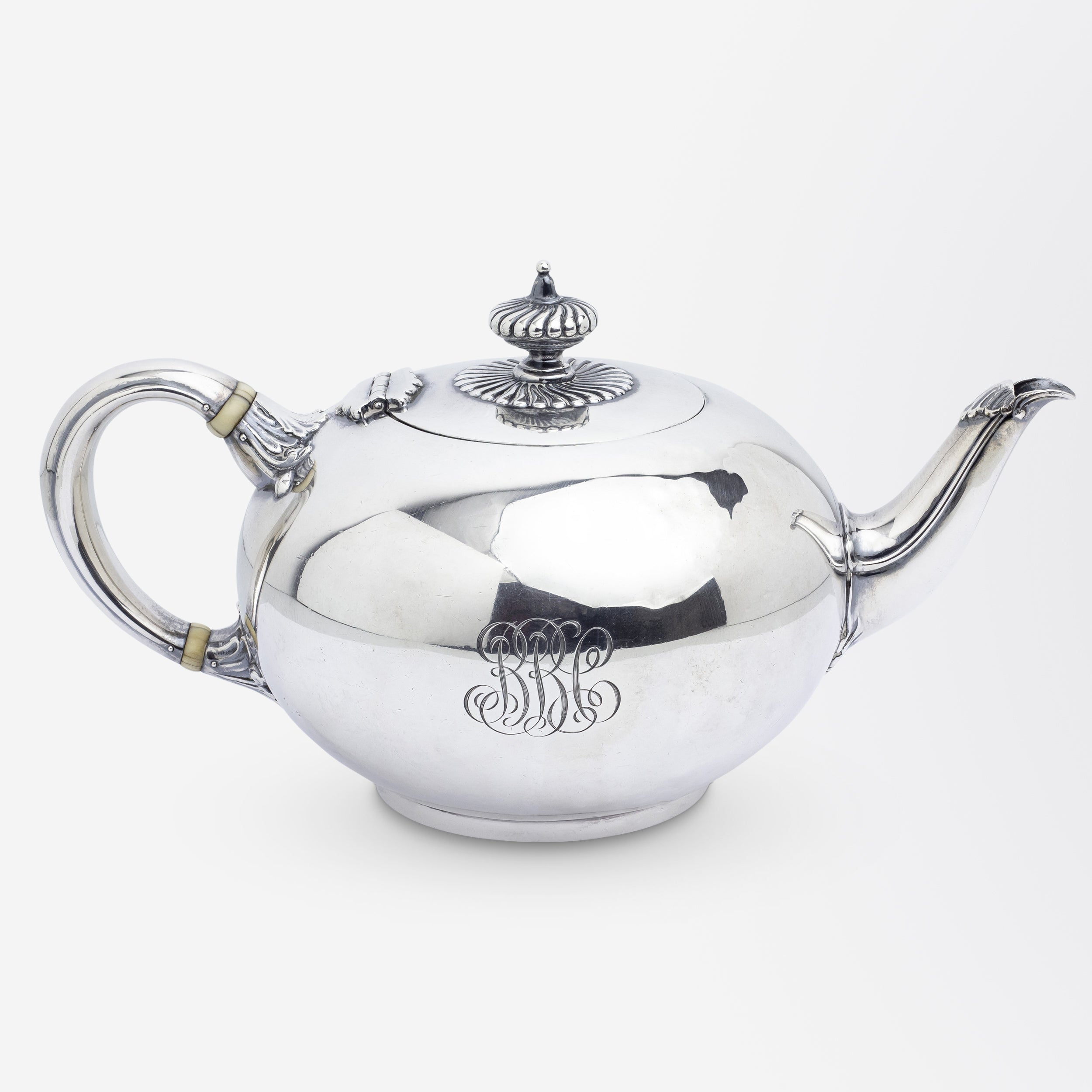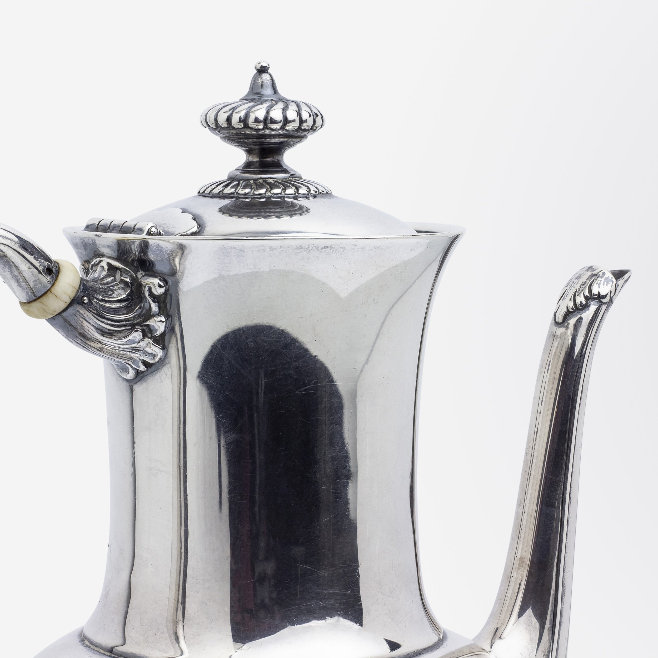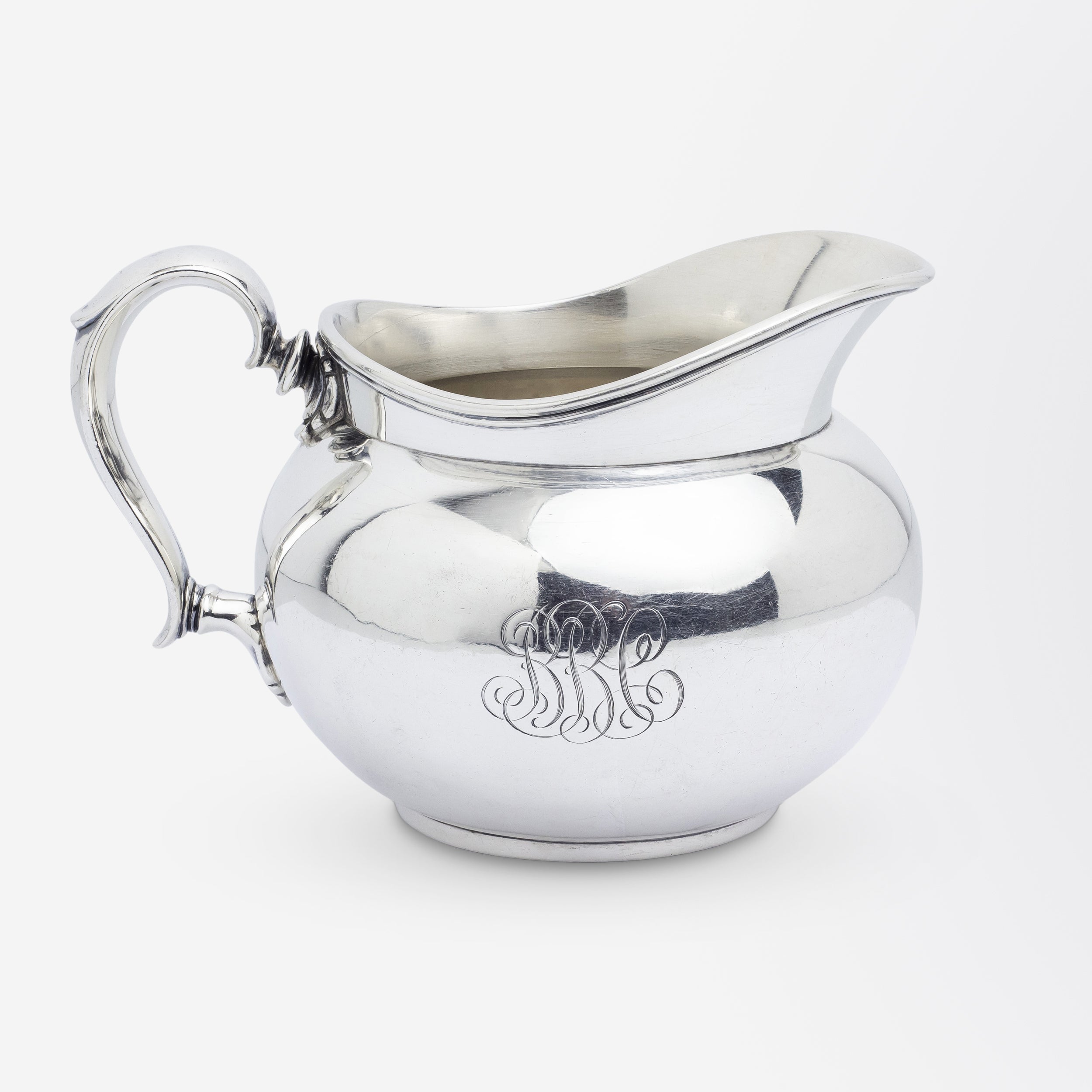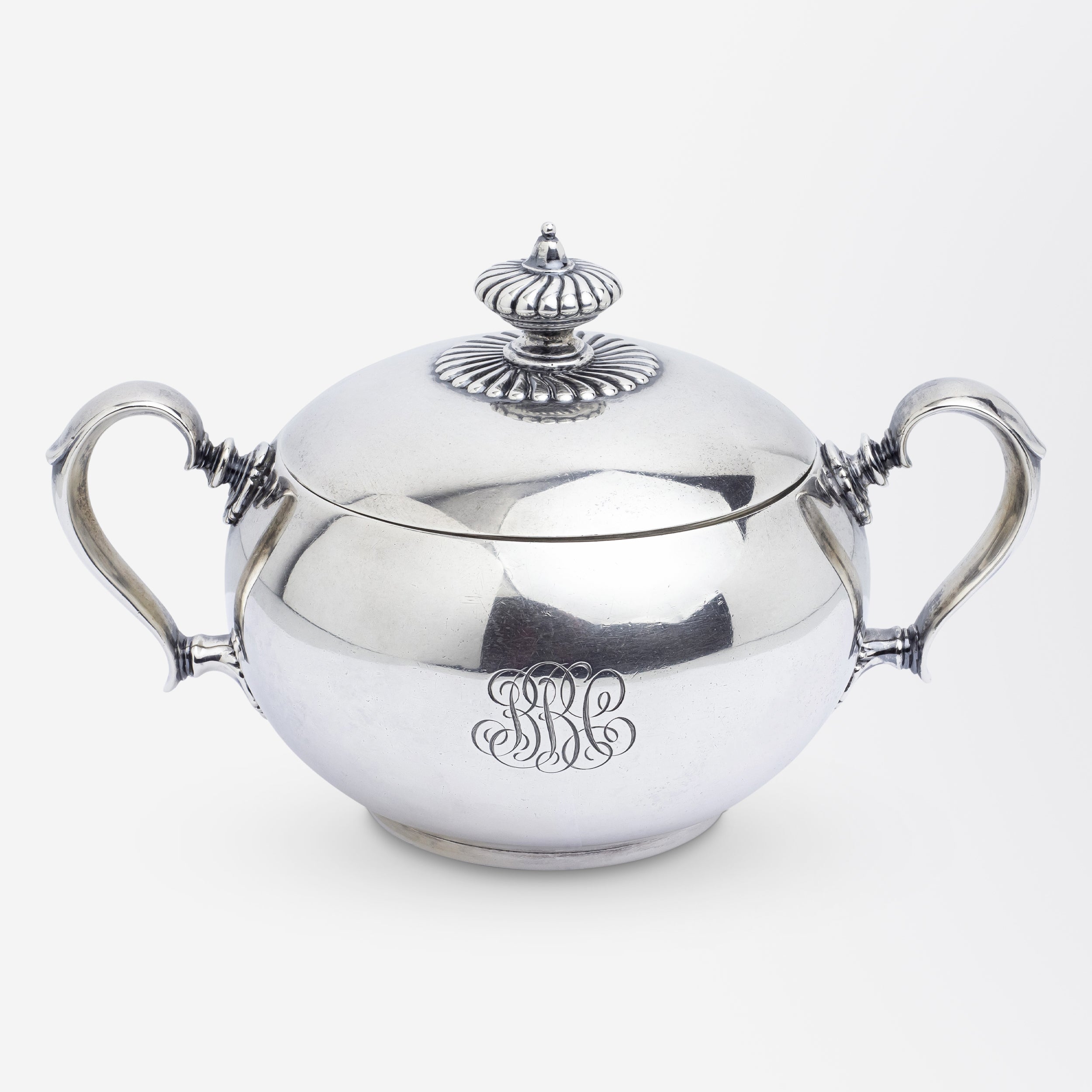 Ce service à thé et à café quatre pièces a été réalisé par la maison américaine de joaillerie et d'orfèvrerie Tiffany & Company. Il comprend une cafetière, une théière, un sucrier avec couvercle et un pot à lait, tous en argent massif avec des manchons en ivoire. Le service est monogrammé sur un côté ; on y trouve les initiales « BBC » dans une écriture très ornée. Les couvercles de la théière, de la cafetière et du sucrier sont ornés de petits boutons en forme de melon, ajoutant une touche d'élégance à ces pièces par ailleurs très sobres. Le service porte le poinçon Tiffany, ce qui permet de dater sa fabrication entre 1902 et 1907, sous la direction de Charles Cook, bien que le modèle ait été créé en 1891. Ce service a été fréquemment utilisé et est en bon état, présentant des marques d'usure dues à son âge : de légères marques, des éraflures et une petite fente sur une anse, visible sur les photos. Ces marques sont tout à fait normales pour son âge et son utilisation.