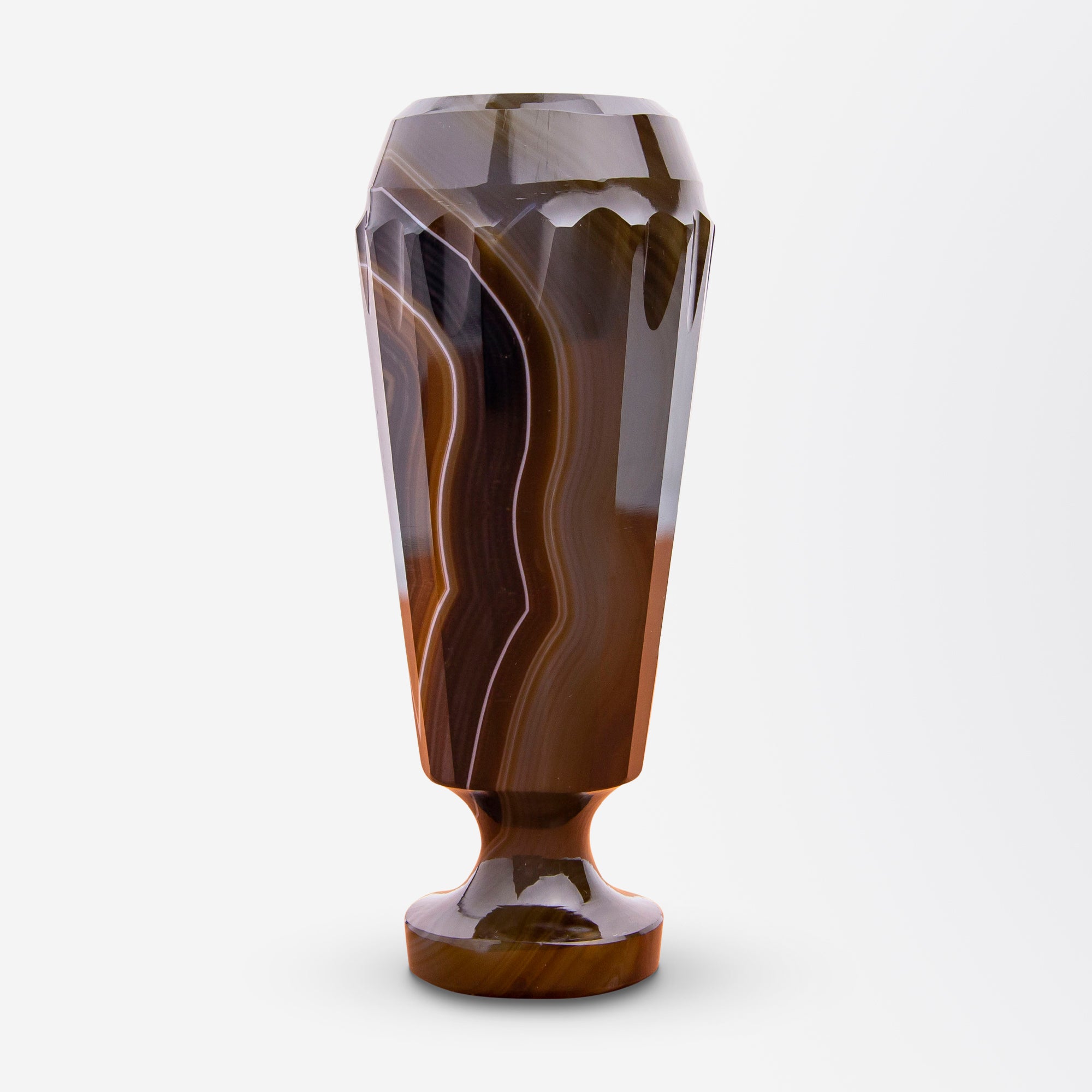 Ce sceau de bureau monumental date de l'époque victorienne et a été sculpté dans un grand bloc d'agate rubanée. La pièce d'agate facettée présente un rubanage prononcé et des variations de couleur sur une face, tandis que le revers est plus sobre et moins orné. La matrice du sceau arbore un monogramme original, probablement un « SL » ou un « LS » entrelacés selon l'ordre de lecture. Ce sceau date de l'époque victorienne, période où l'agate rubanée était très répandue, bien que le monogramme ait un aspect légèrement plus contemporain et puisse être un ajout postérieur, peut-être de la période Art déco. Ce sceau surdimensionné serait un bel objet sur le bureau d'un professionnel ou une pièce maîtresse dans une collection de roches et de pierres précieuses.