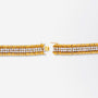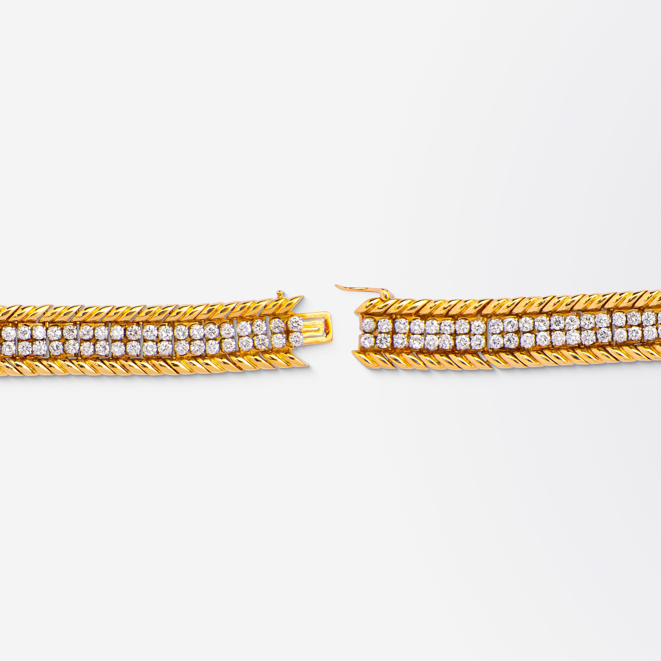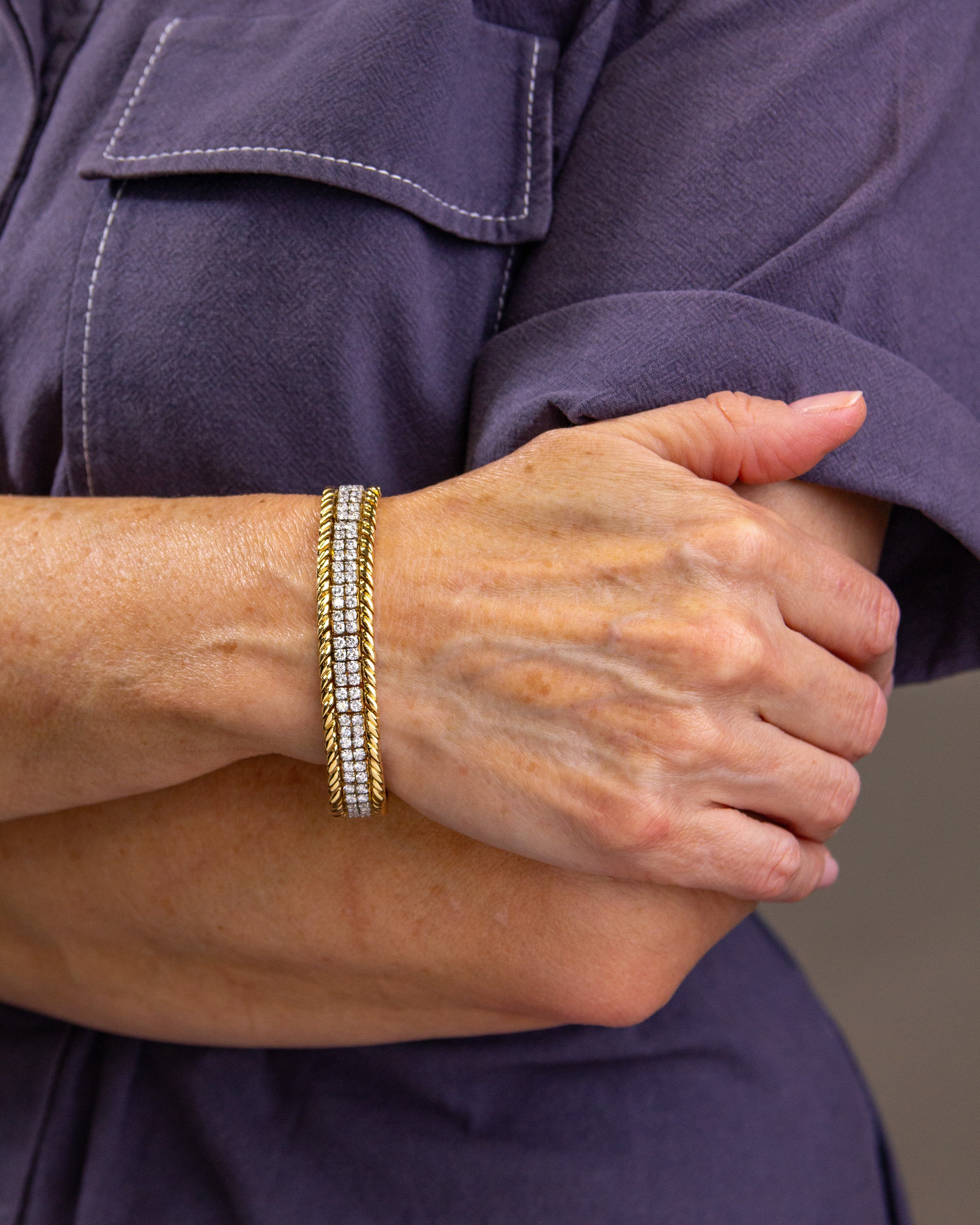 Confectionné en or jaune 18 carats et platine, puis serti de diamants, ce bracelet a été fabriqué en France au cours des cinquante dernières années environ. Il se compose d'une double rangée de quatre diamants sertis griffes sur platine, encadrée par deux rangées d'un motif en corde en or jaune 18 carats. Entièrement articulé, il se ferme par un fermoir à cliquet intégré avec un cliquet de sécurité en forme de huit, tous deux parfaitement fonctionnels et sécurisés. Les diamants ronds taille brillant sont de couleur F/G et de pureté VS-SI, pour un total de 6,30 carats et 140 pièces. Le bracelet porte des poinçons attestant de sa fabrication en France, ainsi que des marques indiquant sa composition en platine et en or jaune 18 carats. Bien qu'il ne s'agisse pas d'une véritable antiquité, ce bracelet vintage est d'une facture remarquable et se mariera à merveille avec d'autres bracelets et joncs en or.
